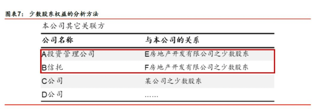 例如:某房企的少数股东权益规模较大,我们重点分析其少数股东权益主体性质,在其审计报告中披露,A投资管理公司为E房地产开发公司的少数股东,B信托为F房地产开发公司的少数股东,由于A和B均为金融类企业,意味着以E和F进行融资的可能性增大。