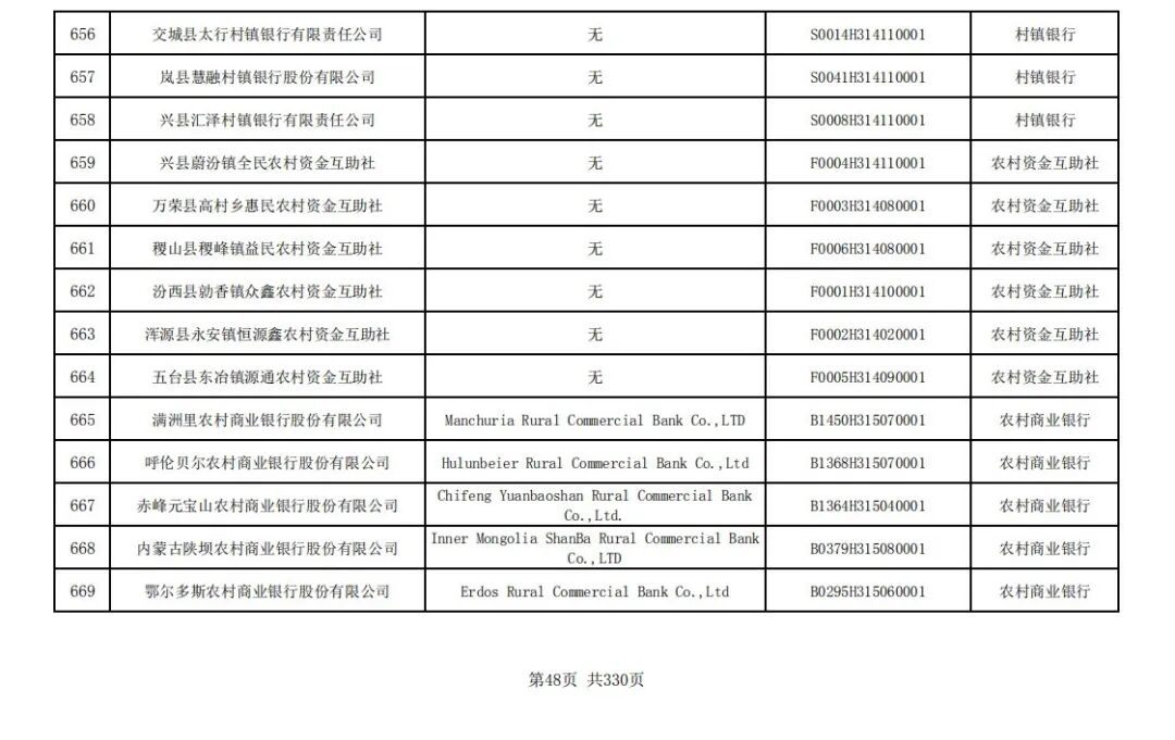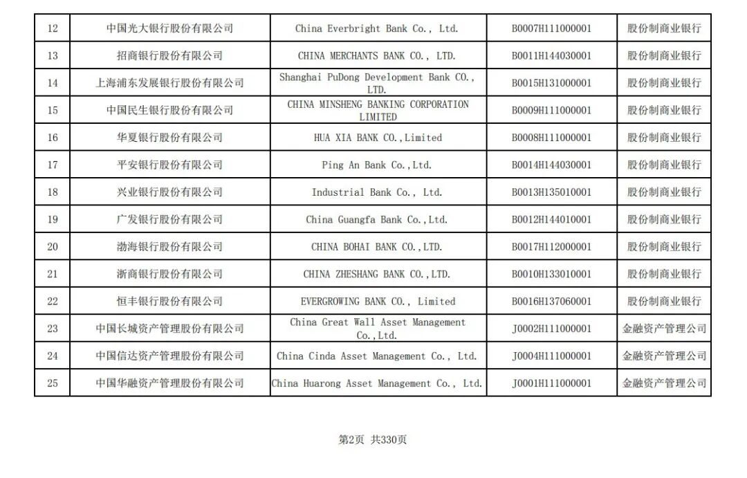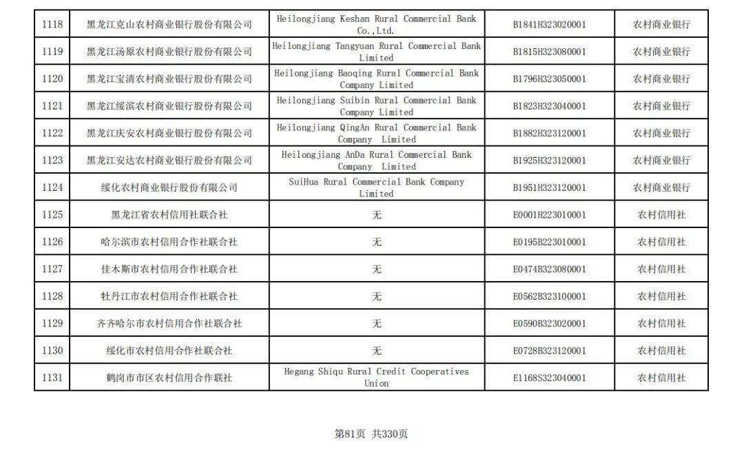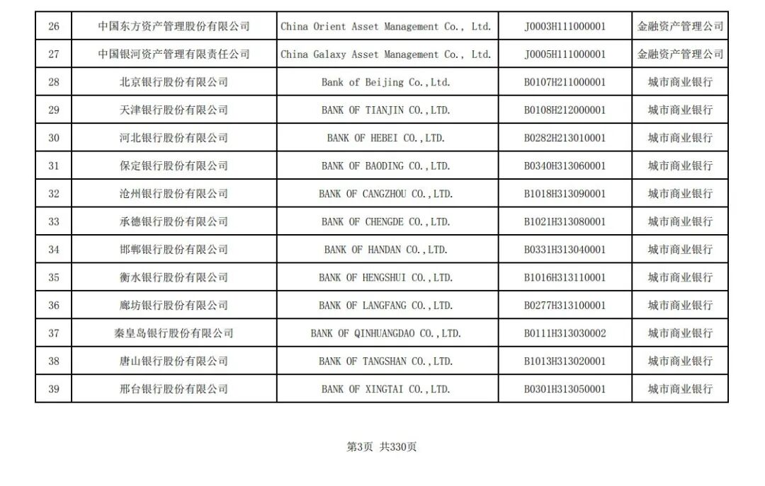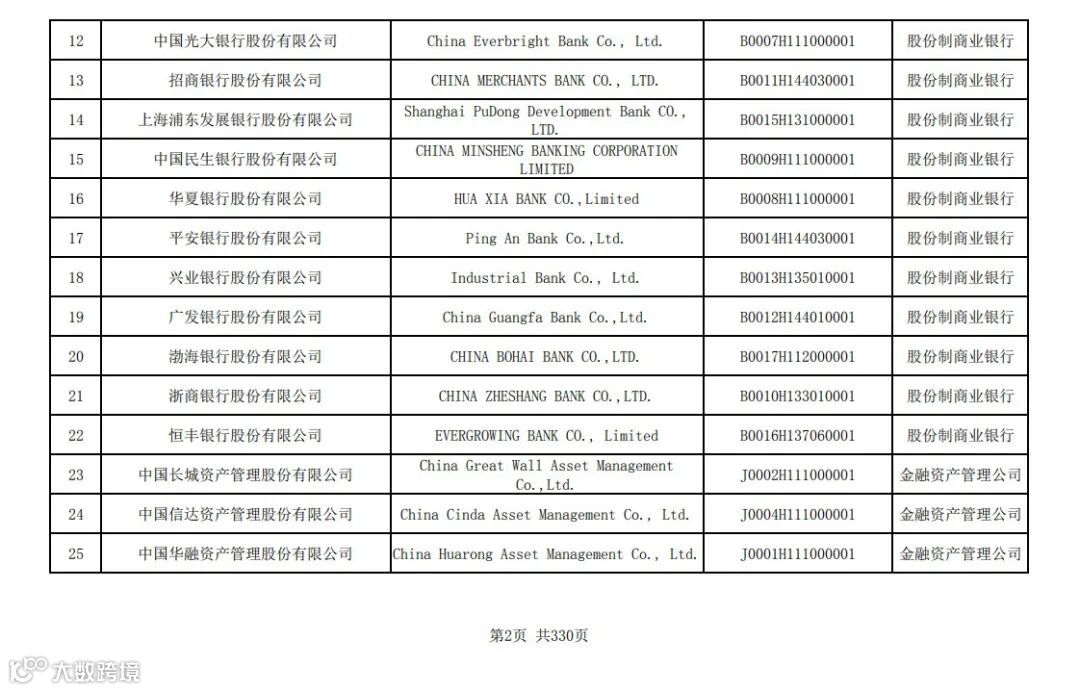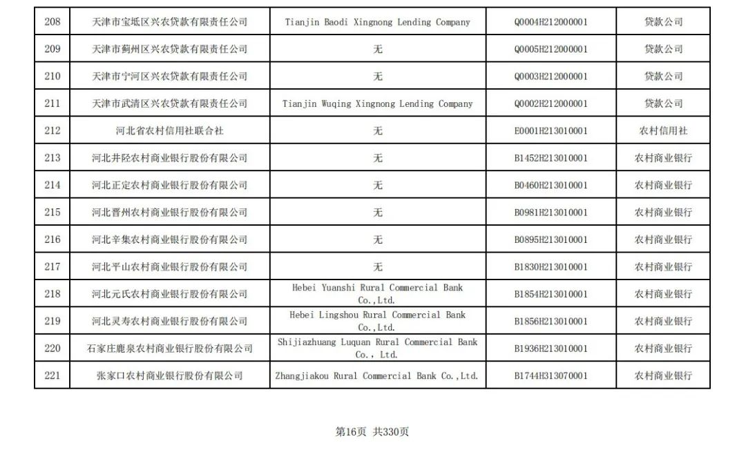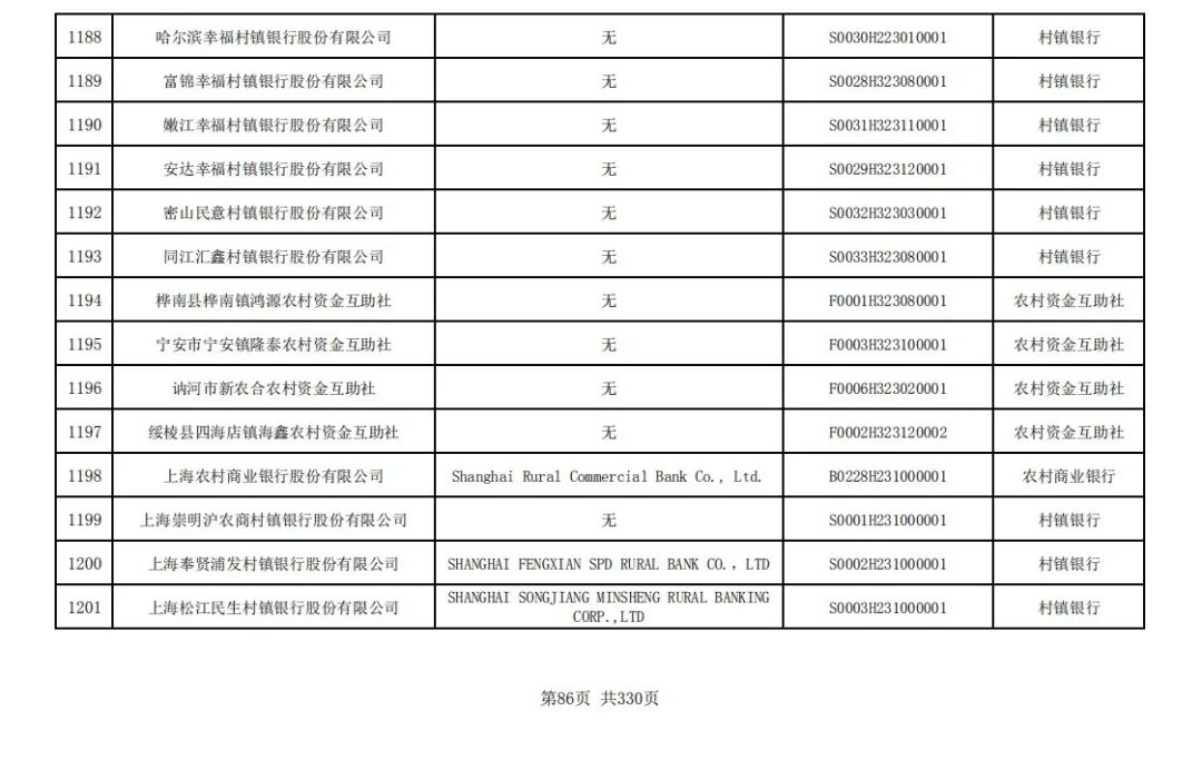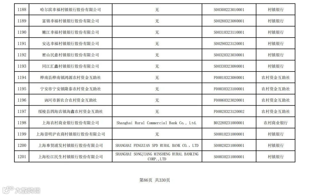 名单中包括1家开发性金融机构、2家政策性银行、6家国有大型商业银行、12家股份制商业银行、5家金融资产管理公司,以及住房储蓄银行、城市商业银行、民营银行、农村商业银行、村镇银行、贷款公司、农村信用社、农村资金互助社、外资法人银行、信托公司、金融租赁公司、企业集团财务公司、汽车金融公司、消费金融公司、货币经纪公司,此外还包括金融资产投资公司、银行理财子公司等在内的其他金融机构等,共计4601家。