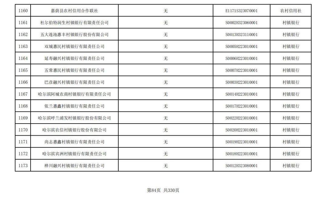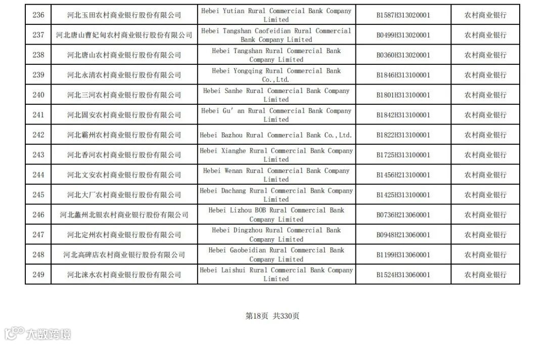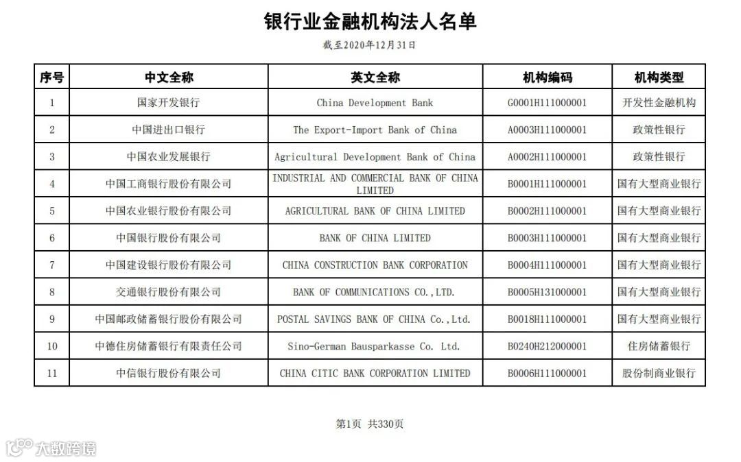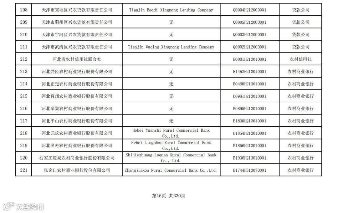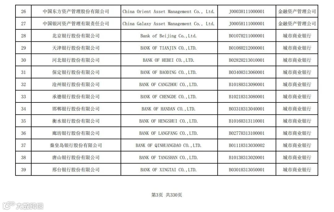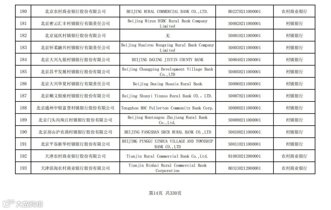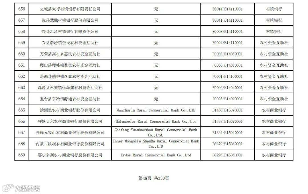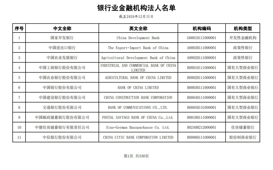 名单中包括1家开发性金融机构、2家政策性银行、6家国有大型商业银行、12家股份制商业银行、5家金融资产管理公司,以及住房储蓄银行、城市商业银行、民营银行、农村商业银行、村镇银行、贷款公司、农村信用社、农村资金互助社、外资法人银行、信托公司、金融租赁公司、企业集团财务公司、汽车金融公司、消费金融公司、货币经纪公司,此外还包括金融资产投资公司、银行理财子公司等在内的其他金融机构等,共计4601家。