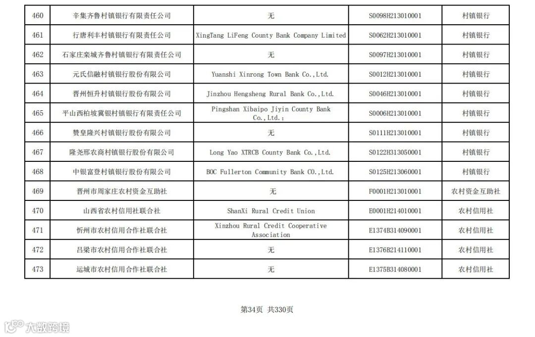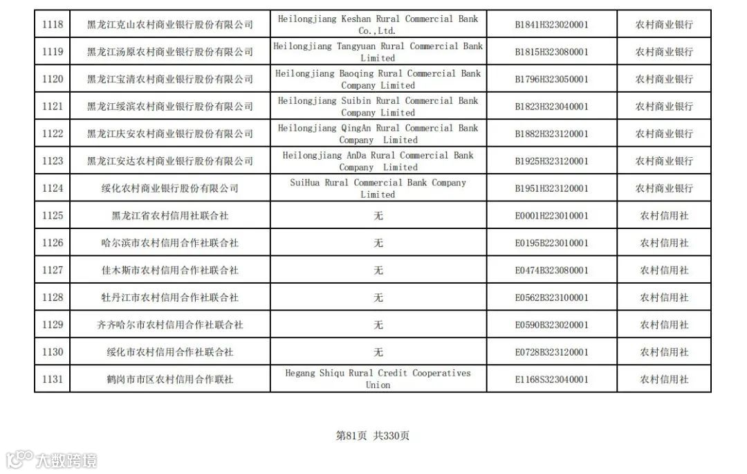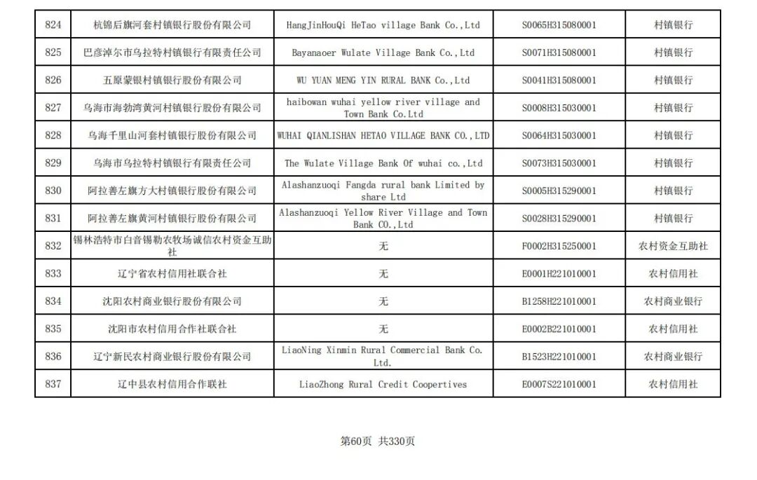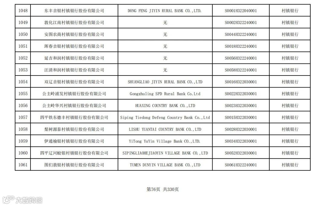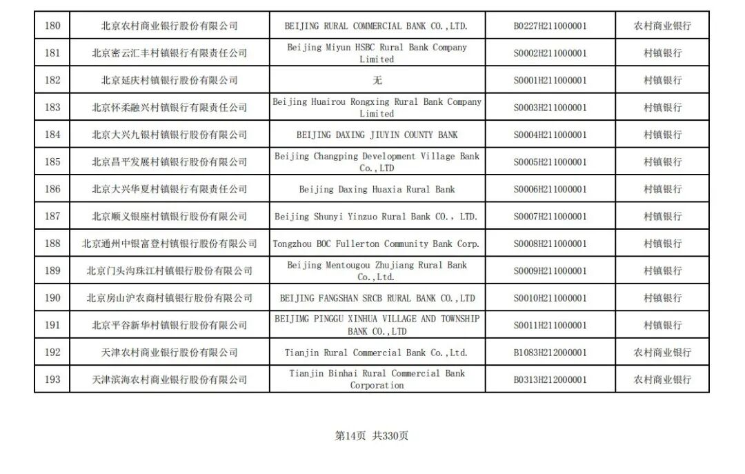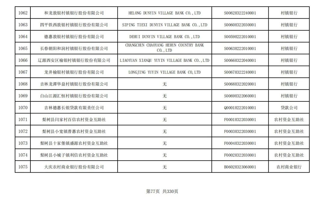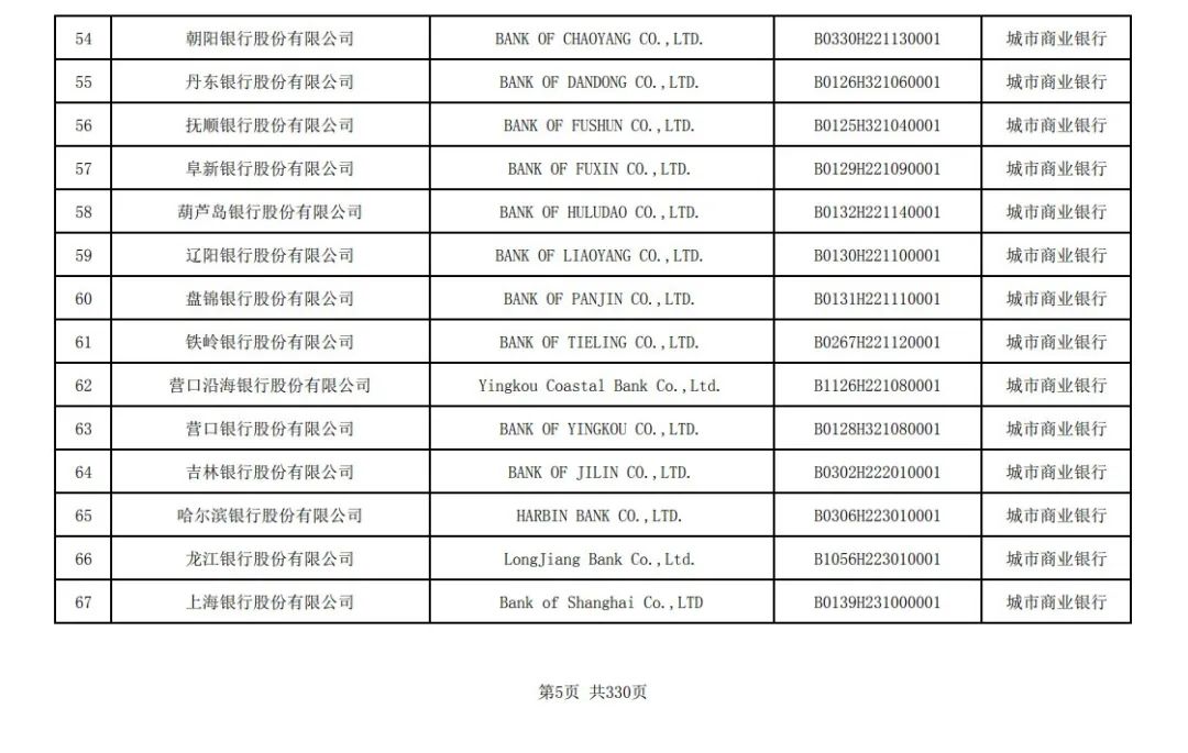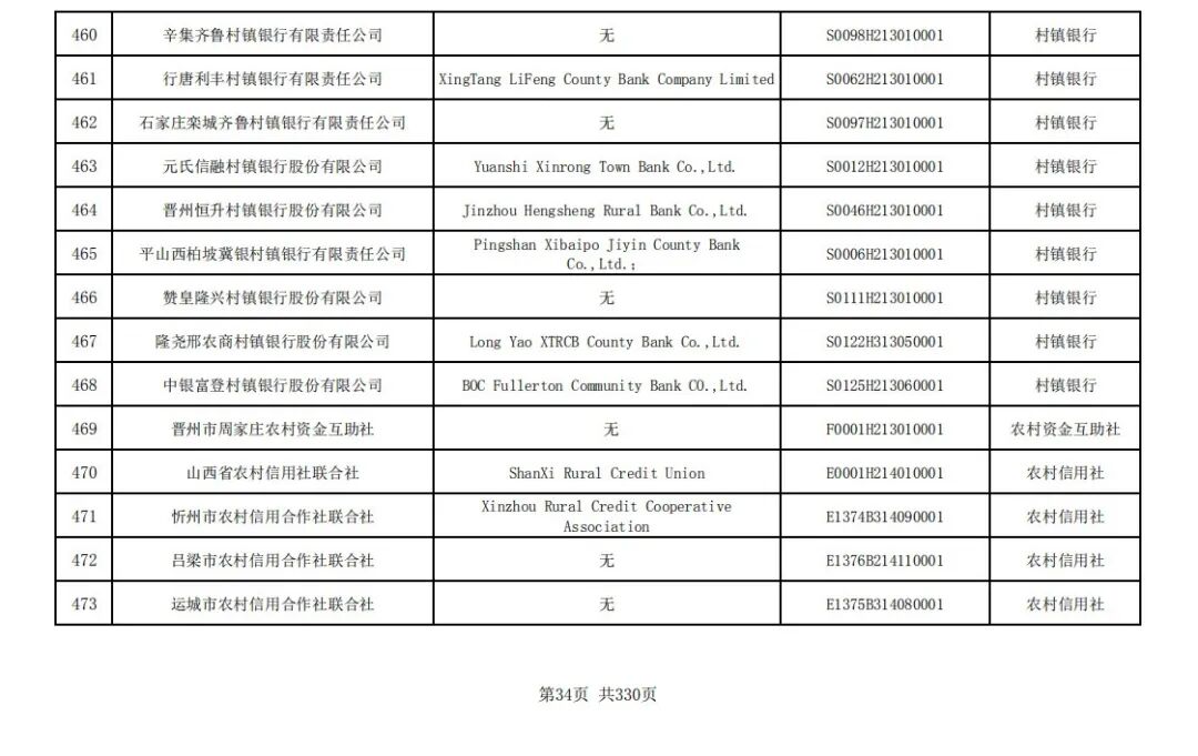 名单中包括1家开发性金融机构、2家政策性银行、6家国有大型商业银行、12家股份制商业银行、5家金融资产管理公司,以及住房储蓄银行、城市商业银行、民营银行、农村商业银行、村镇银行、贷款公司、农村信用社、农村资金互助社、外资法人银行、信托公司、金融租赁公司、企业集团财务公司、汽车金融公司、消费金融公司、货币经纪公司,此外还包括金融资产投资公司、银行理财子公司等在内的其他金融机构等,共计4601家。