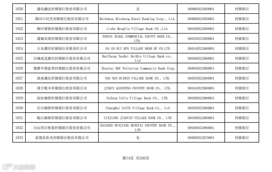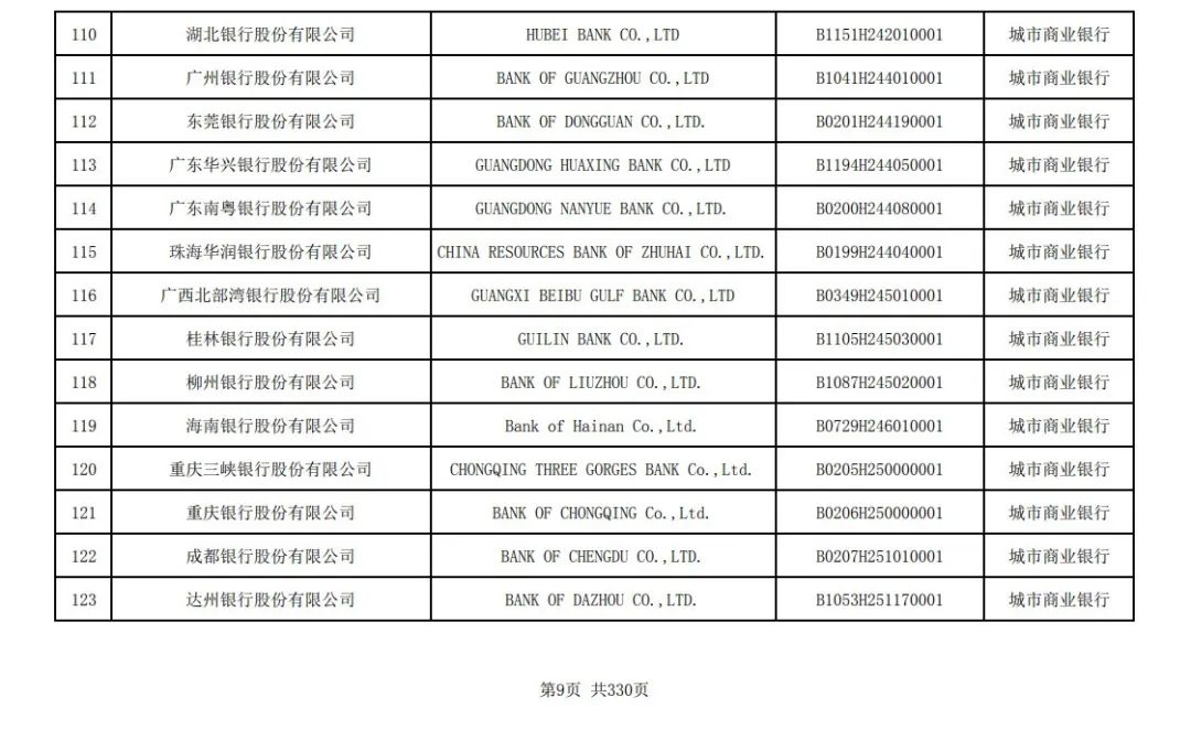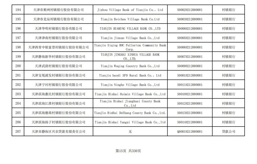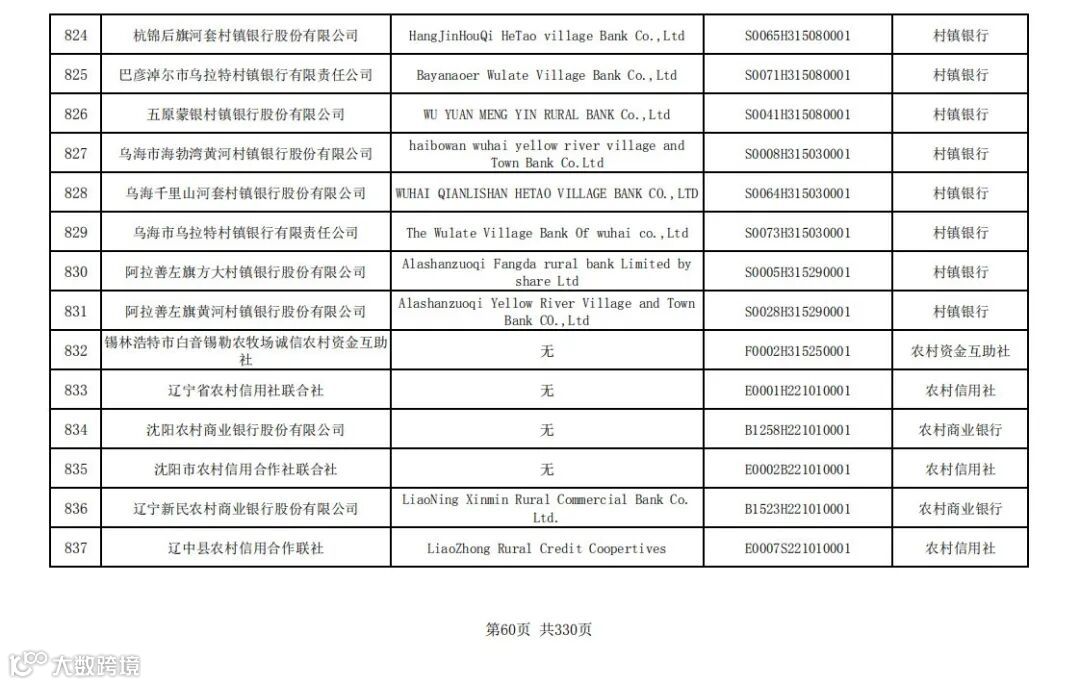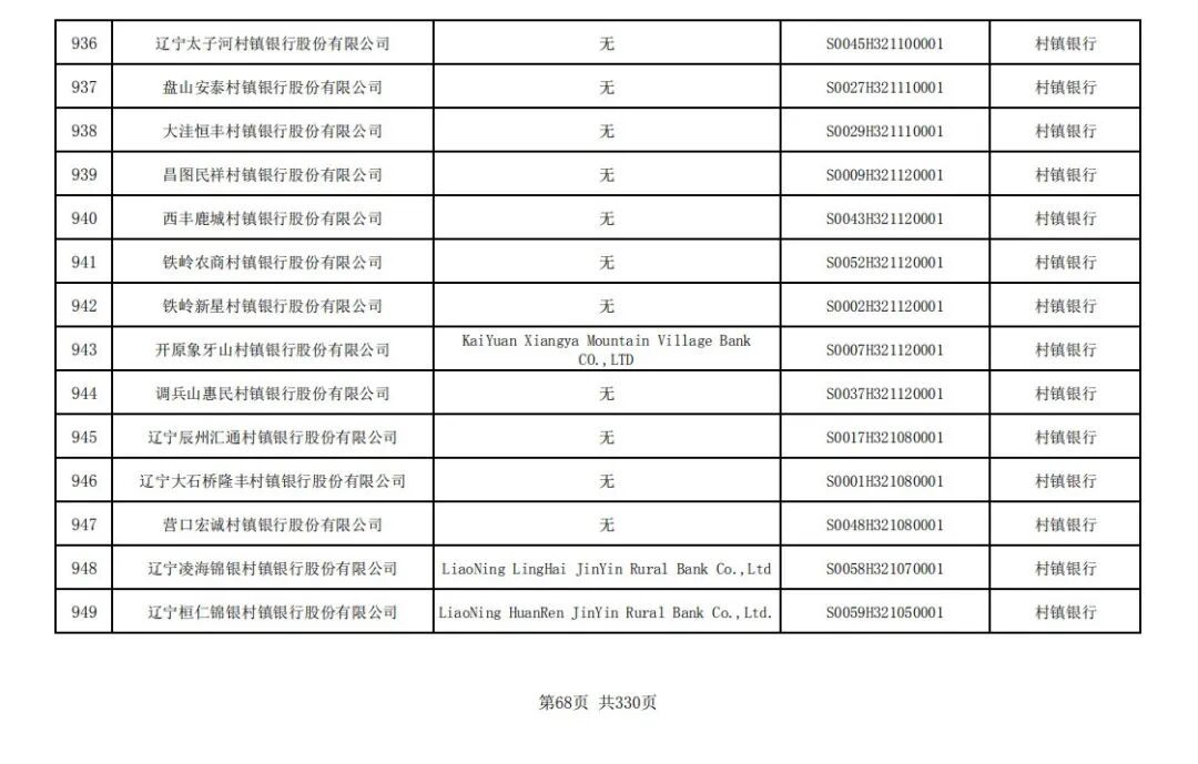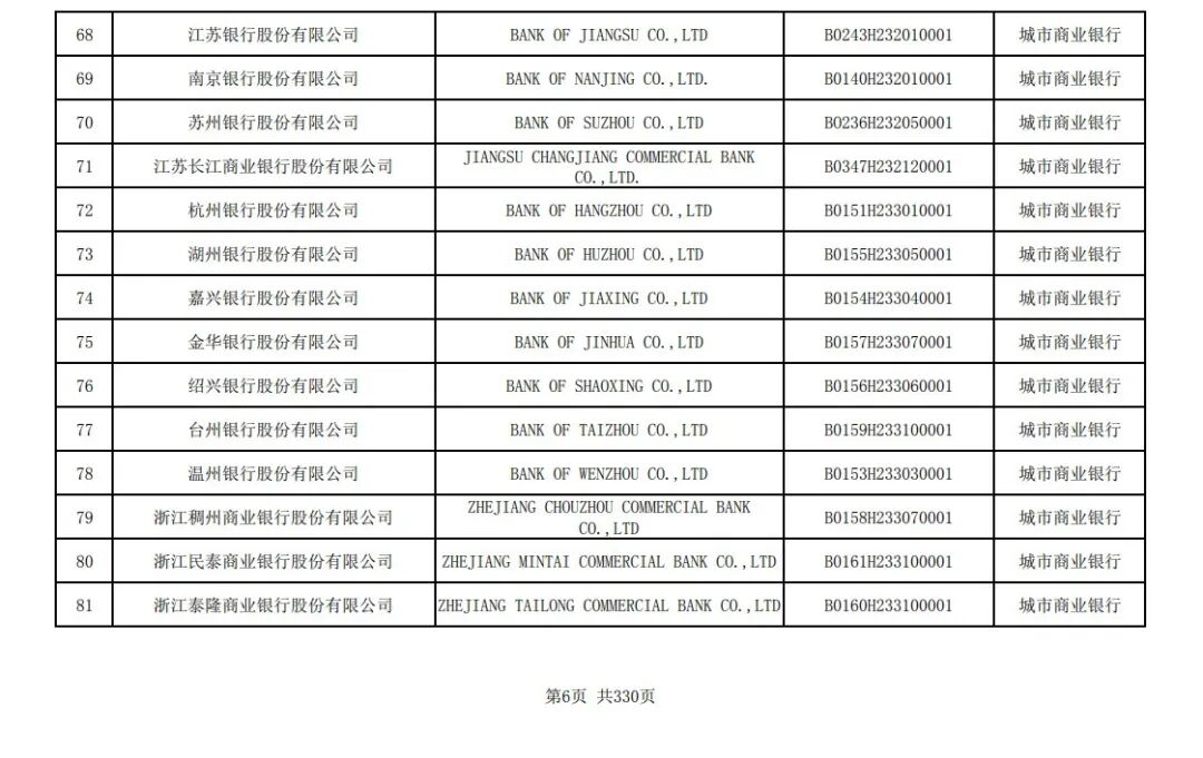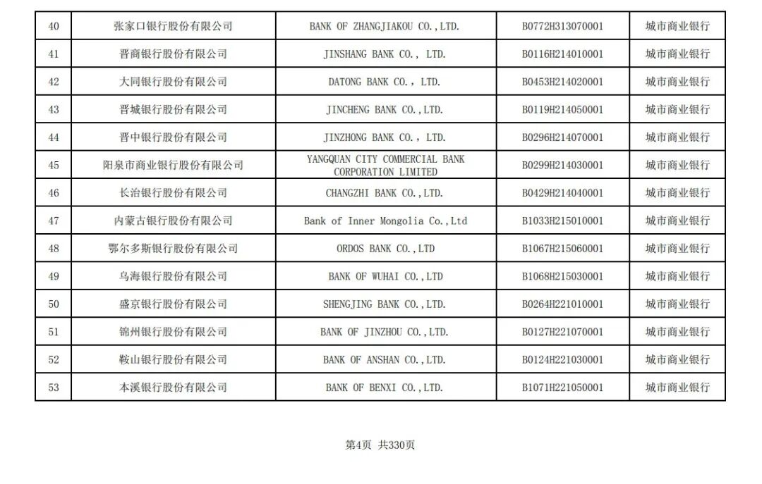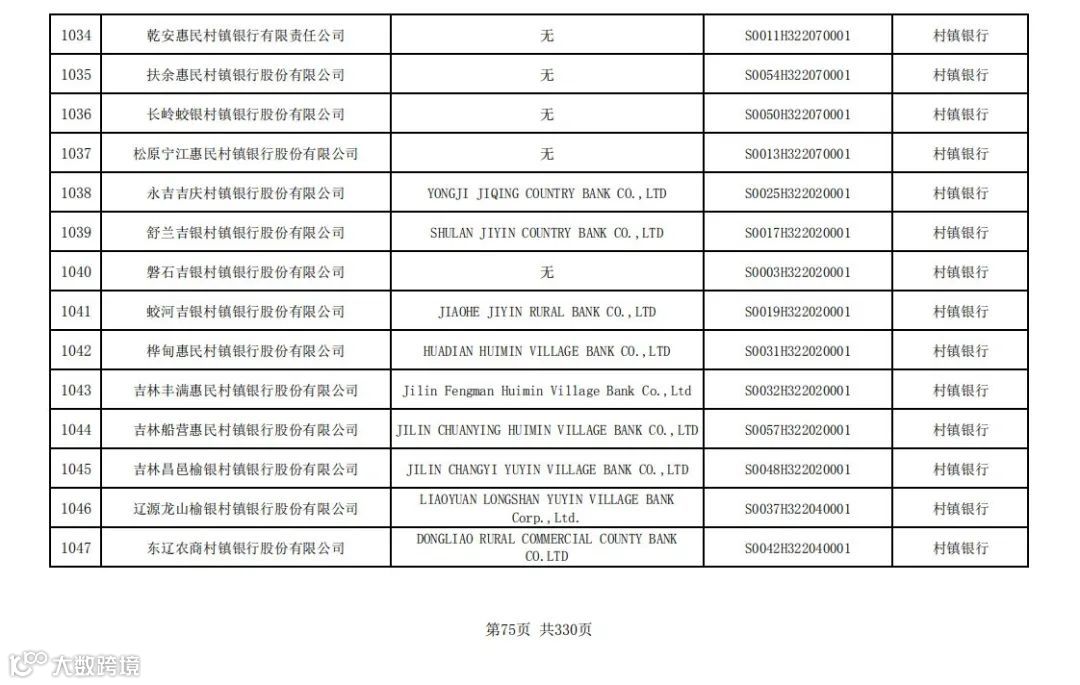 名单中包括1家开发性金融机构、2家政策性银行、6家国有大型商业银行、12家股份制商业银行、5家金融资产管理公司,以及住房储蓄银行、城市商业银行、民营银行、农村商业银行、村镇银行、贷款公司、农村信用社、农村资金互助社、外资法人银行、信托公司、金融租赁公司、企业集团财务公司、汽车金融公司、消费金融公司、货币经纪公司,此外还包括金融资产投资公司、银行理财子公司等在内的其他金融机构等,共计4601家。
