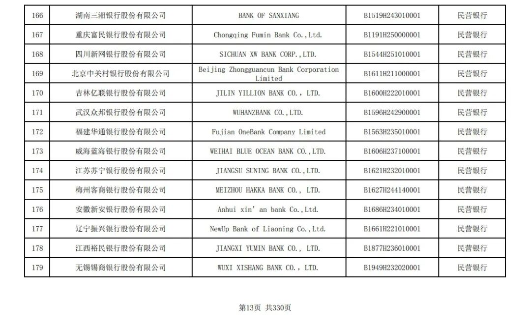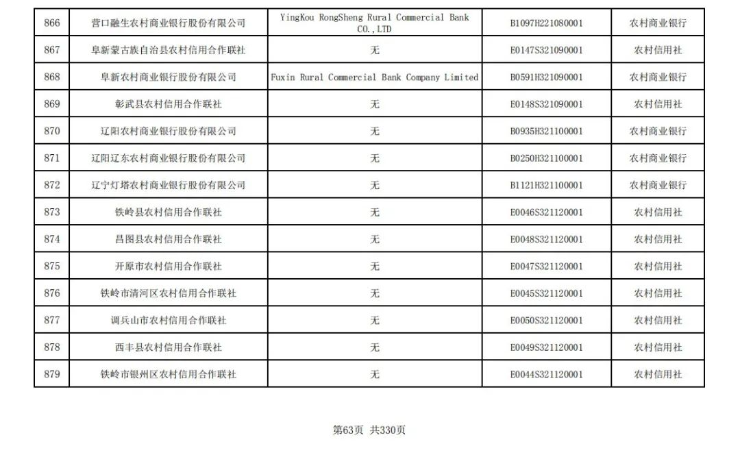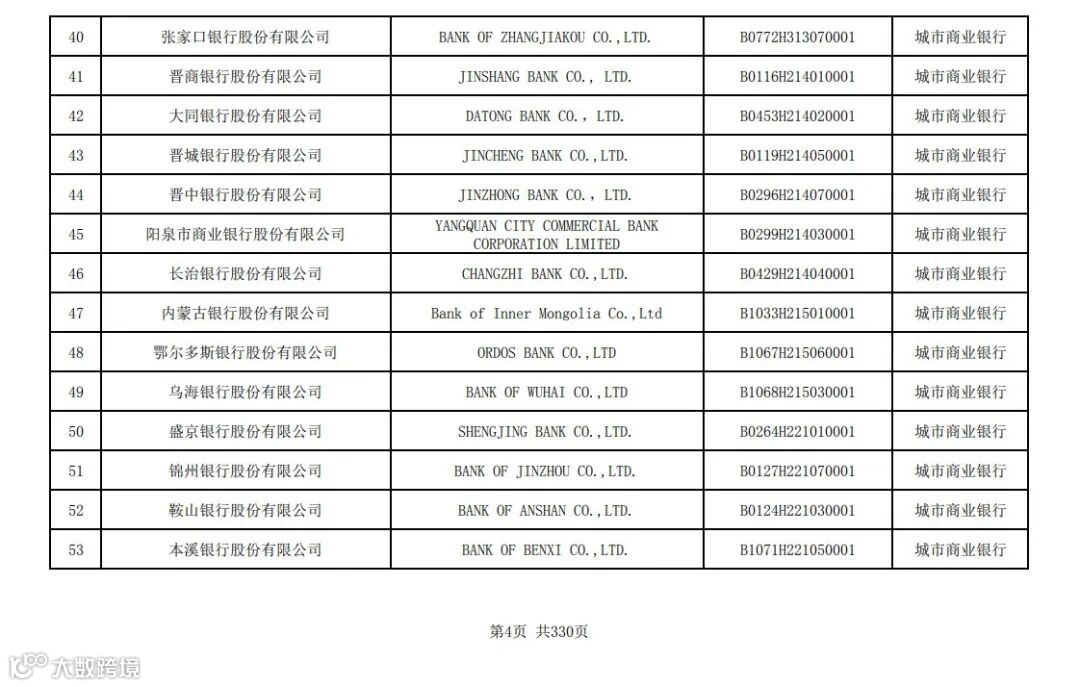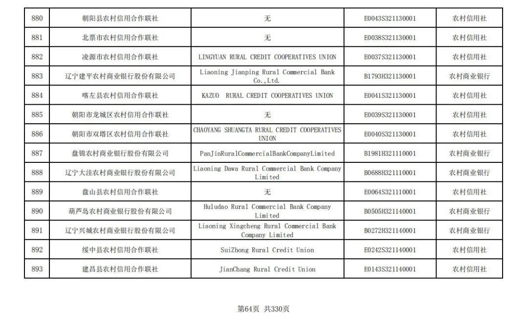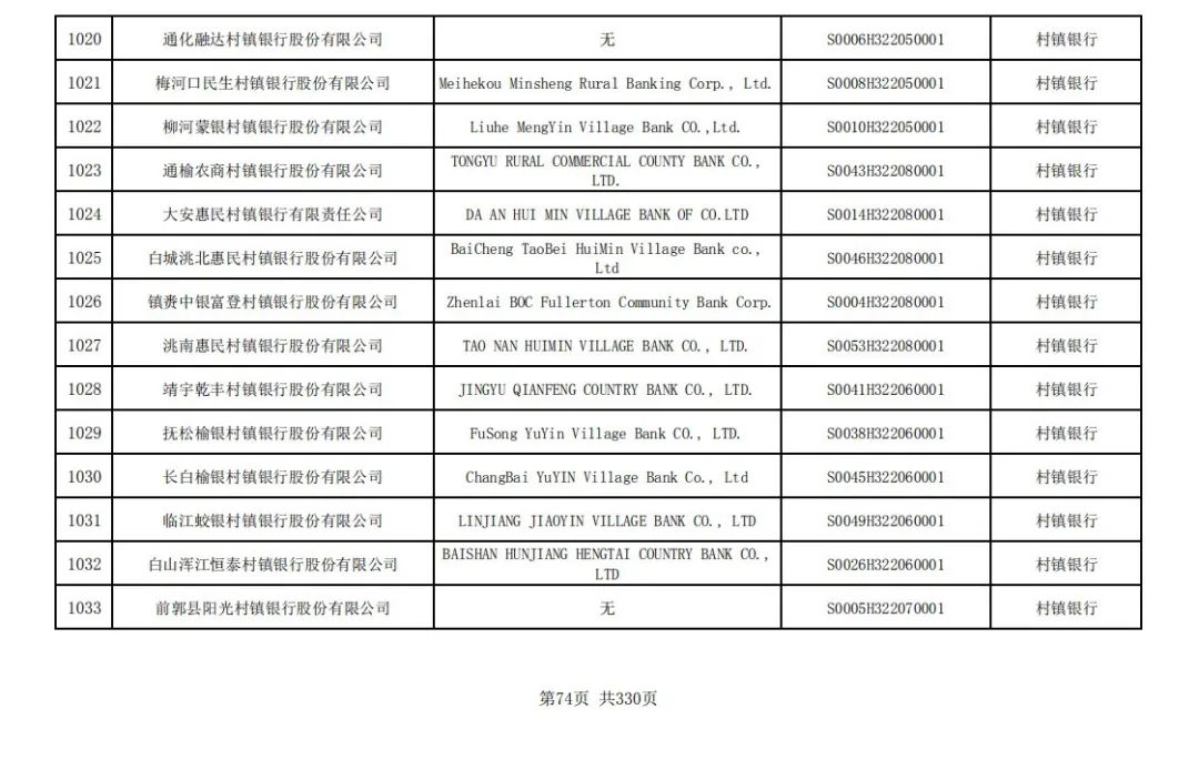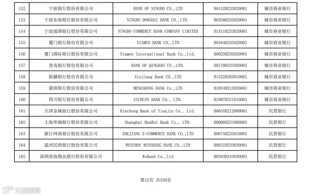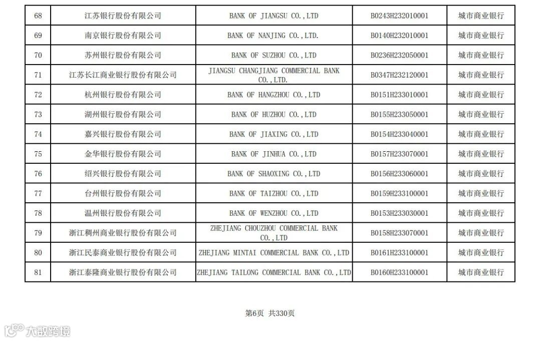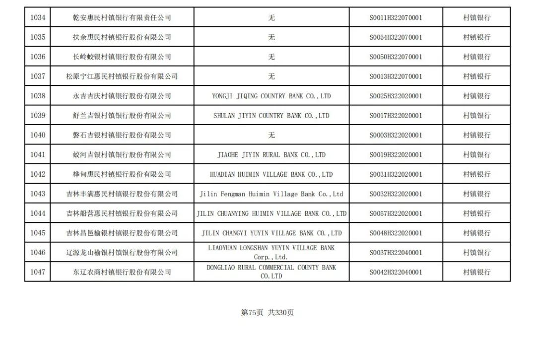 名单中包括1家开发性金融机构、2家政策性银行、6家国有大型商业银行、12家股份制商业银行、5家金融资产管理公司,以及住房储蓄银行、城市商业银行、民营银行、农村商业银行、村镇银行、贷款公司、农村信用社、农村资金互助社、外资法人银行、信托公司、金融租赁公司、企业集团财务公司、汽车金融公司、消费金融公司、货币经纪公司,此外还包括金融资产投资公司、银行理财子公司等在内的其他金融机构等,共计4601家。
