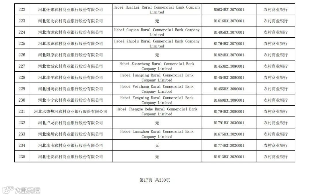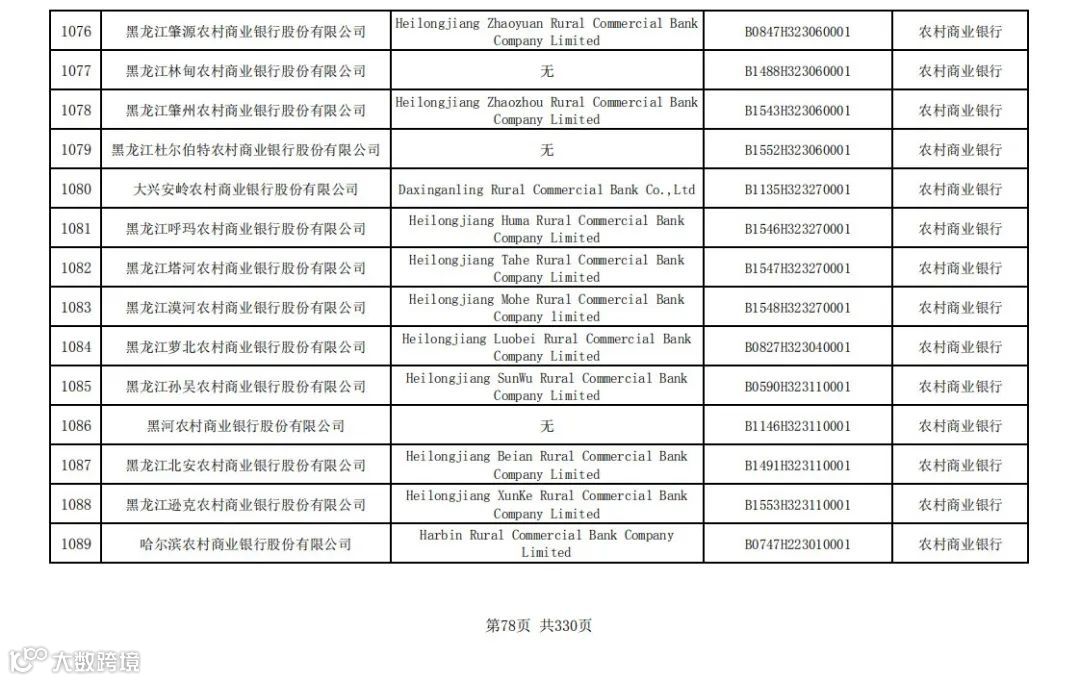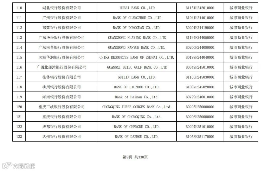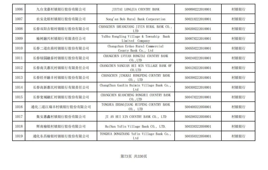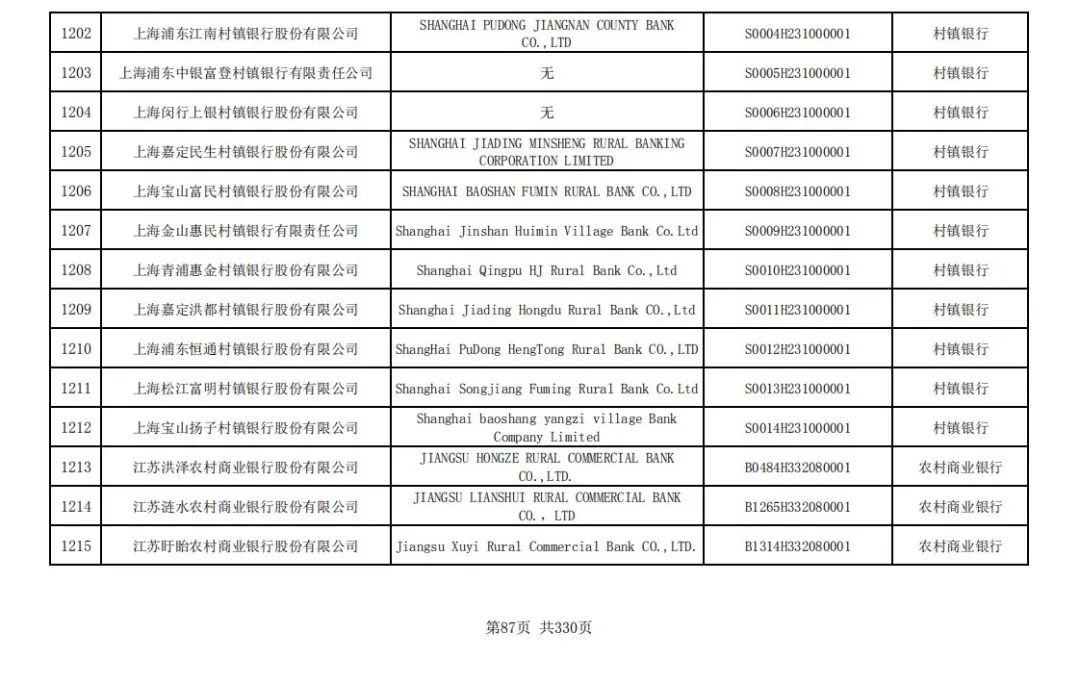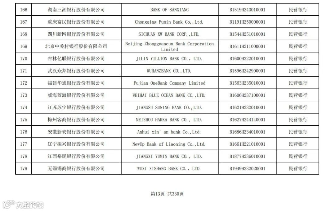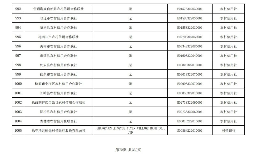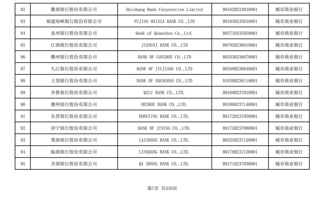名单中包括1家开发性金融机构、2家政策性银行、6家国有大型商业银行、12家股份制商业银行、5家金融资产管理公司,以及住房储蓄银行、城市商业银行、民营银行、农村商业银行、村镇银行、贷款公司、农村信用社、农村资金互助社、外资法人银行、信托公司、金融租赁公司、企业集团财务公司、汽车金融公司、消费金融公司、货币经纪公司,此外还包括金融资产投资公司、银行理财子公司等在内的其他金融机构等,共计4601家。