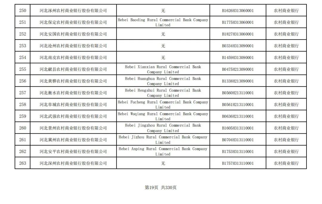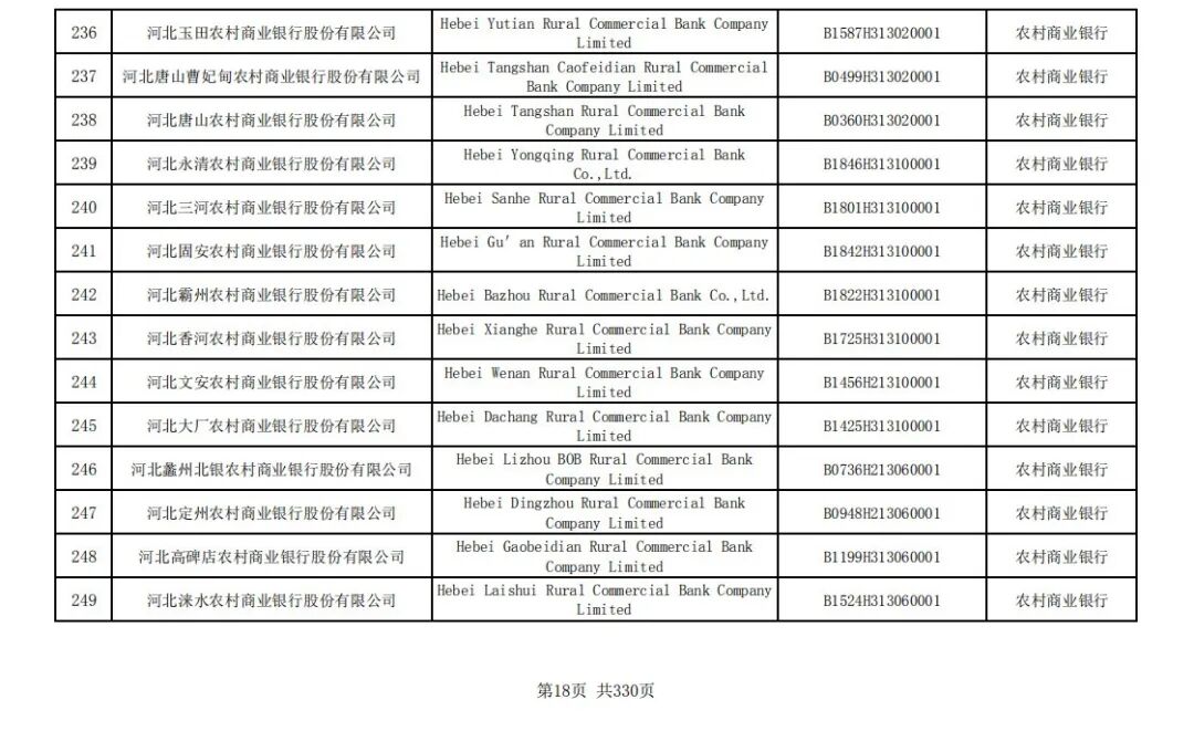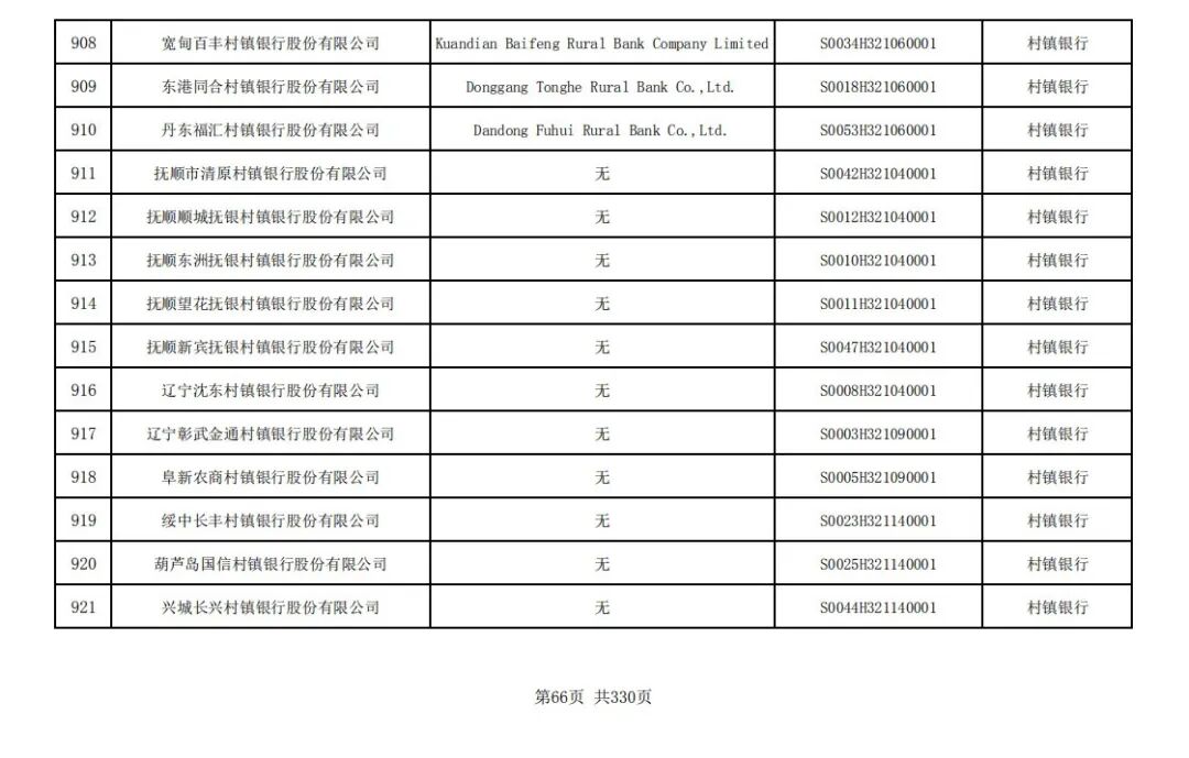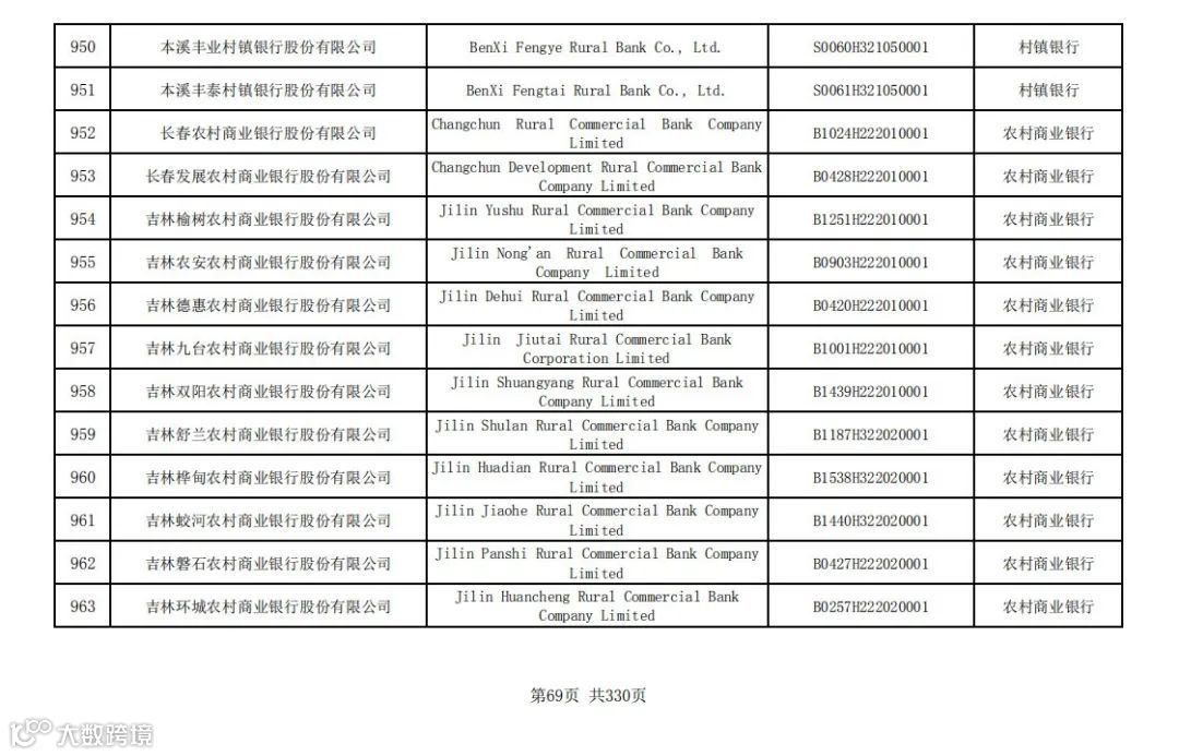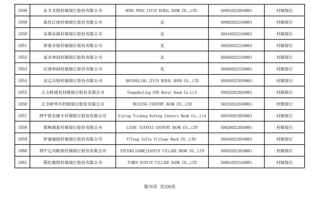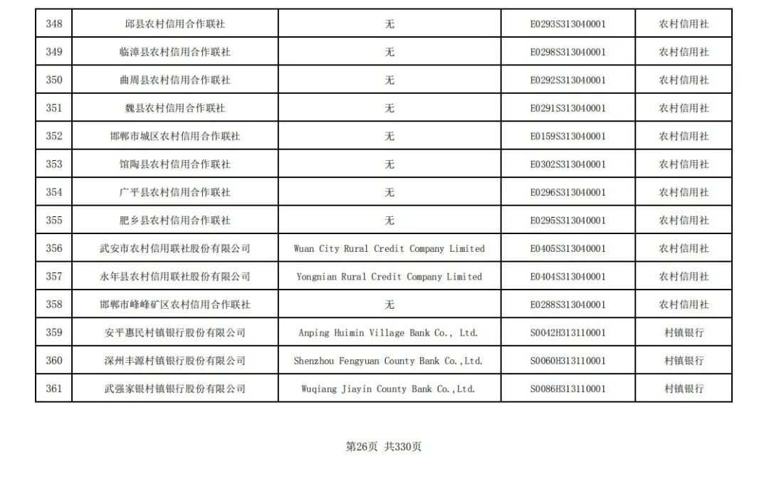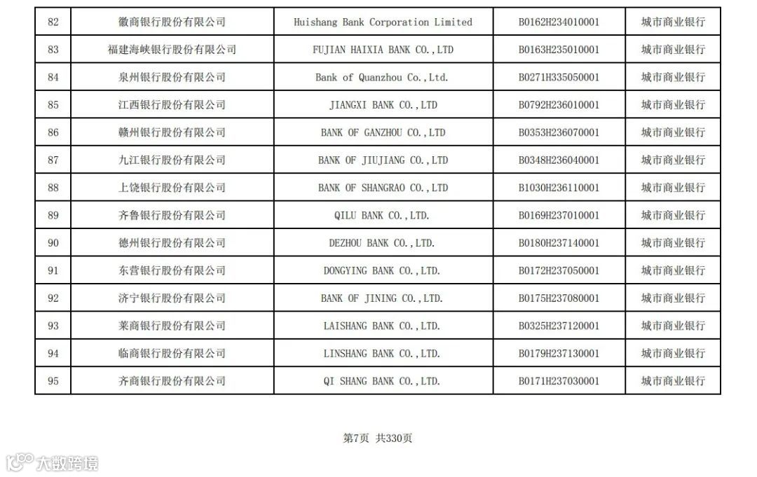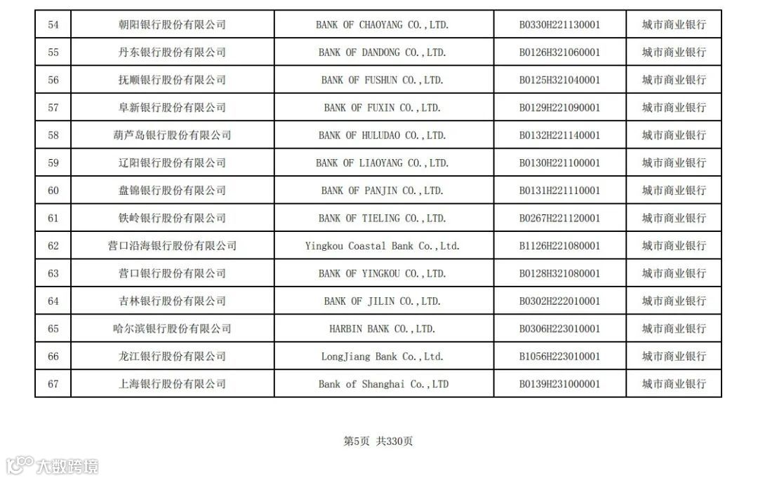 名单中包括1家开发性金融机构、2家政策性银行、6家国有大型商业银行、12家股份制商业银行、5家金融资产管理公司,以及住房储蓄银行、城市商业银行、民营银行、农村商业银行、村镇银行、贷款公司、农村信用社、农村资金互助社、外资法人银行、信托公司、金融租赁公司、企业集团财务公司、汽车金融公司、消费金融公司、货币经纪公司,此外还包括金融资产投资公司、银行理财子公司等在内的其他金融机构等,共计4601家。