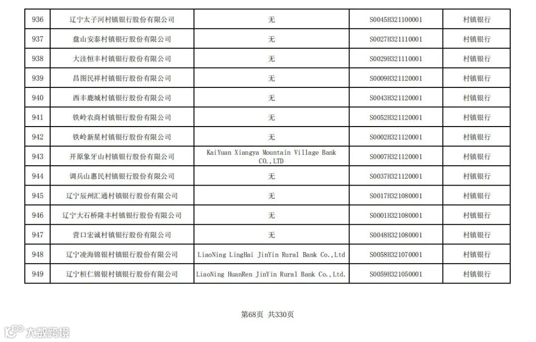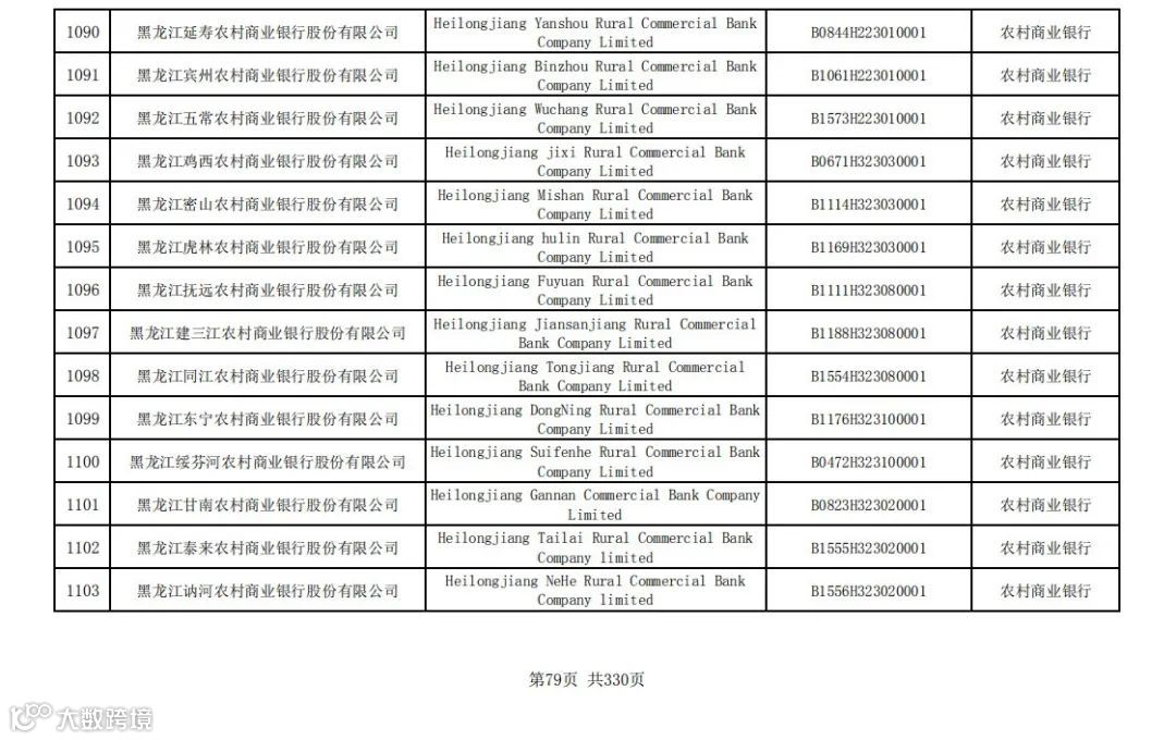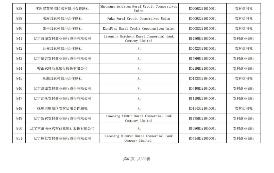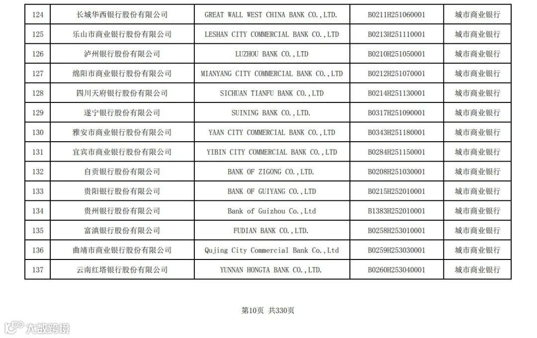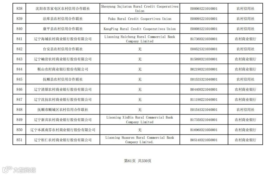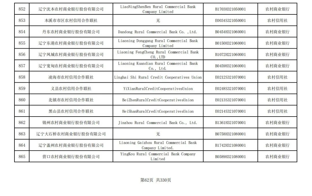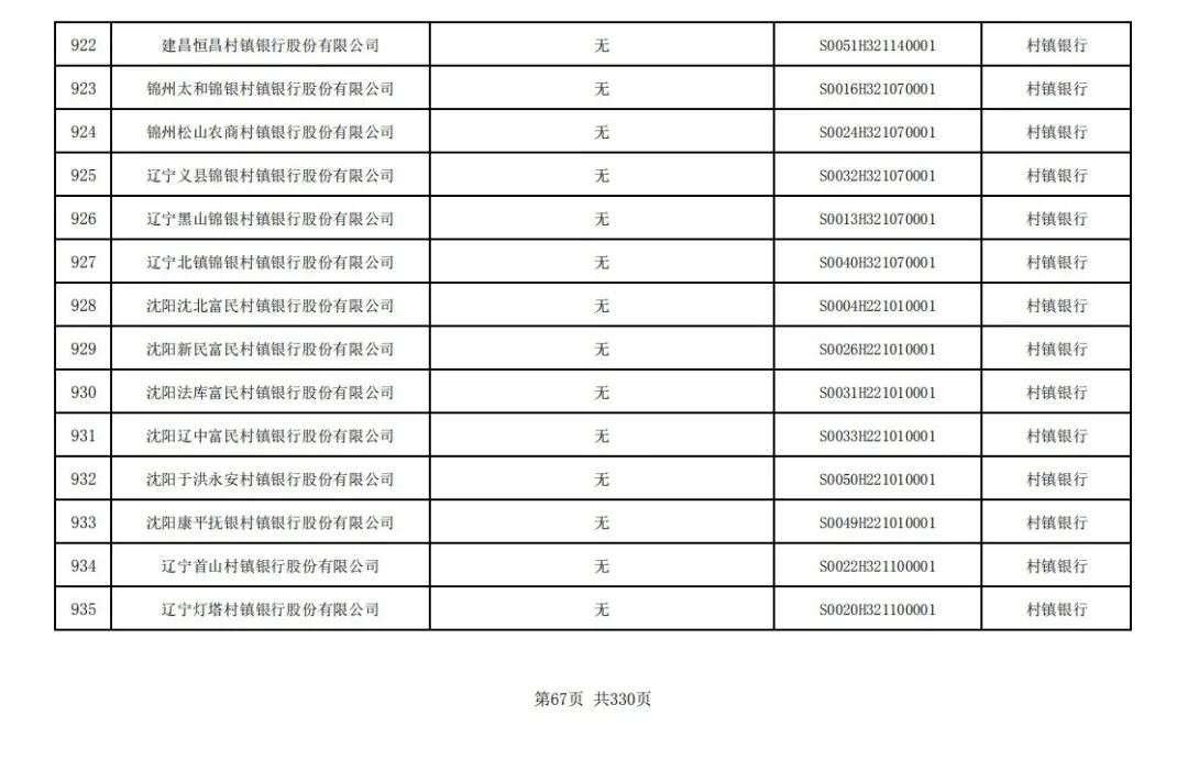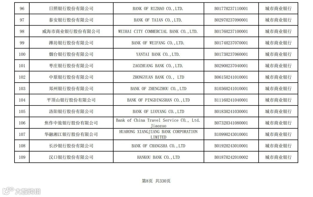 名单中包括1家开发性金融机构、2家政策性银行、6家国有大型商业银行、12家股份制商业银行、5家金融资产管理公司,以及住房储蓄银行、城市商业银行、民营银行、农村商业银行、村镇银行、贷款公司、农村信用社、农村资金互助社、外资法人银行、信托公司、金融租赁公司、企业集团财务公司、汽车金融公司、消费金融公司、货币经纪公司,此外还包括金融资产投资公司、银行理财子公司等在内的其他金融机构等,共计4601家。