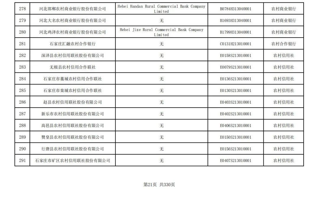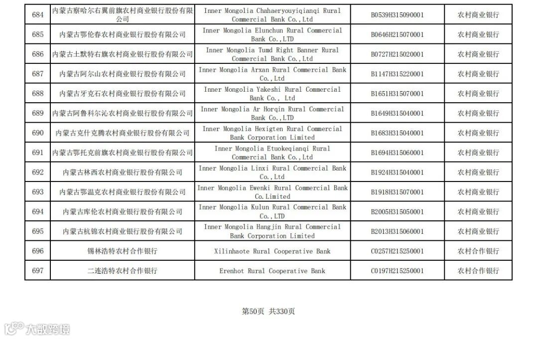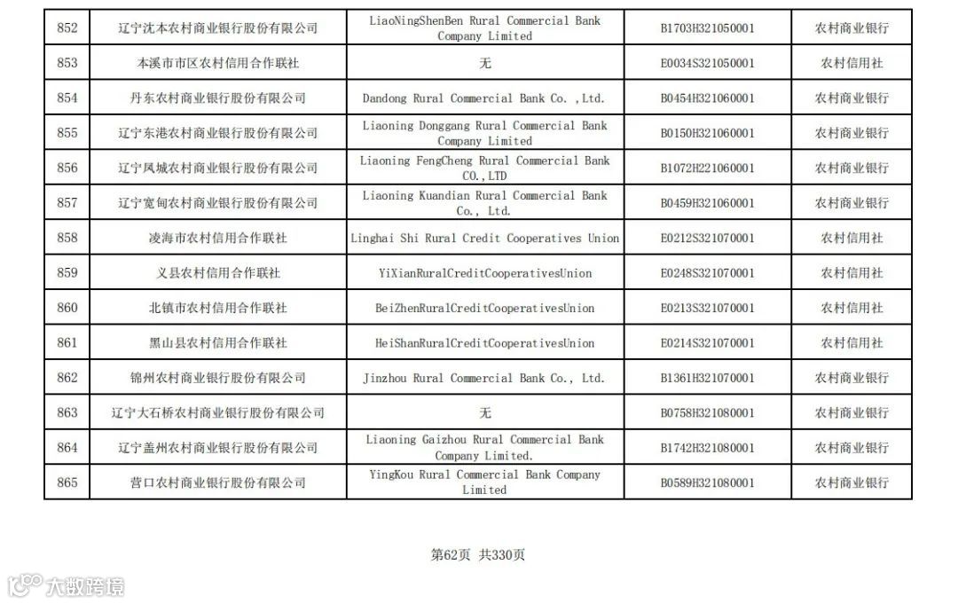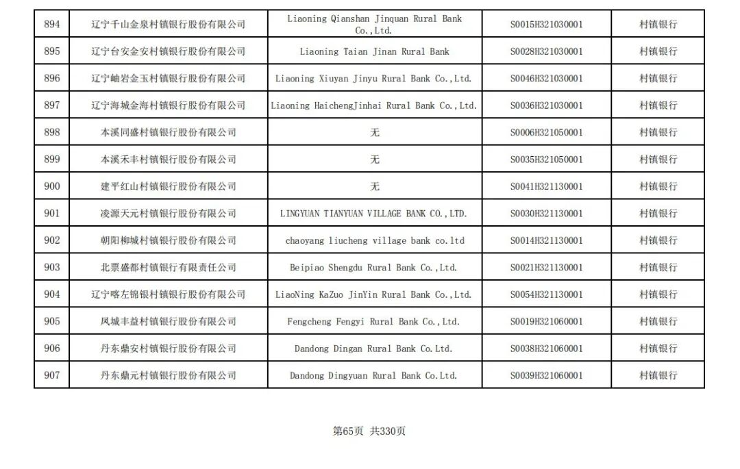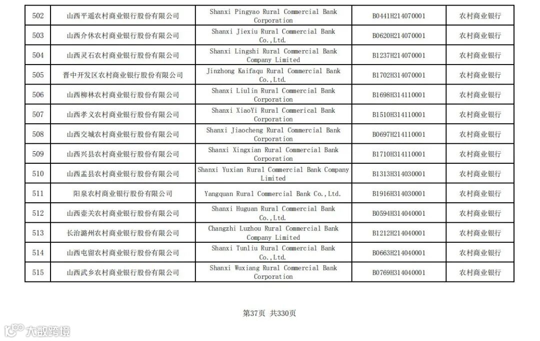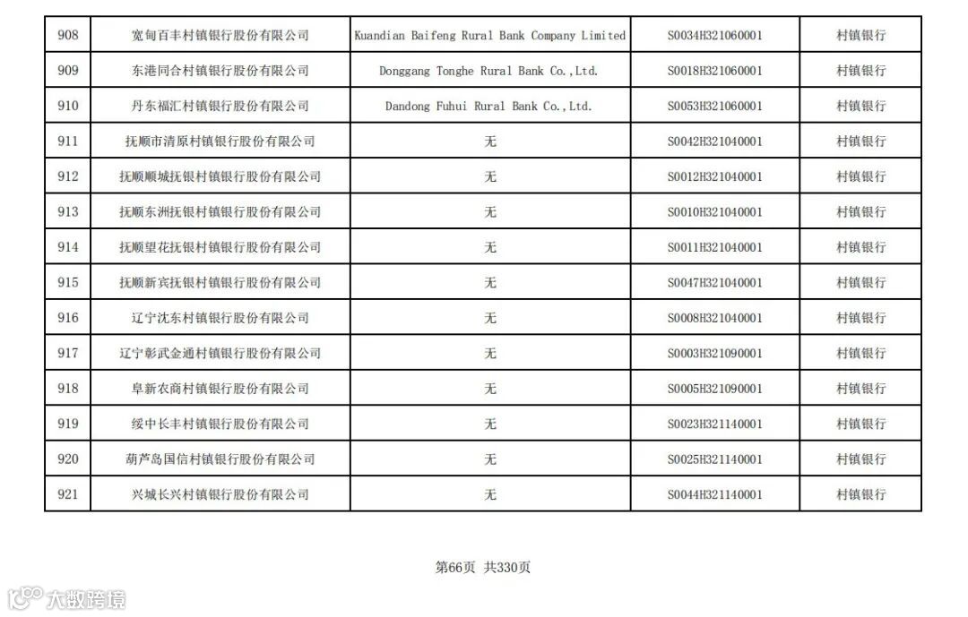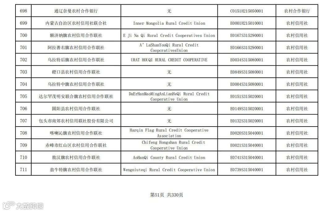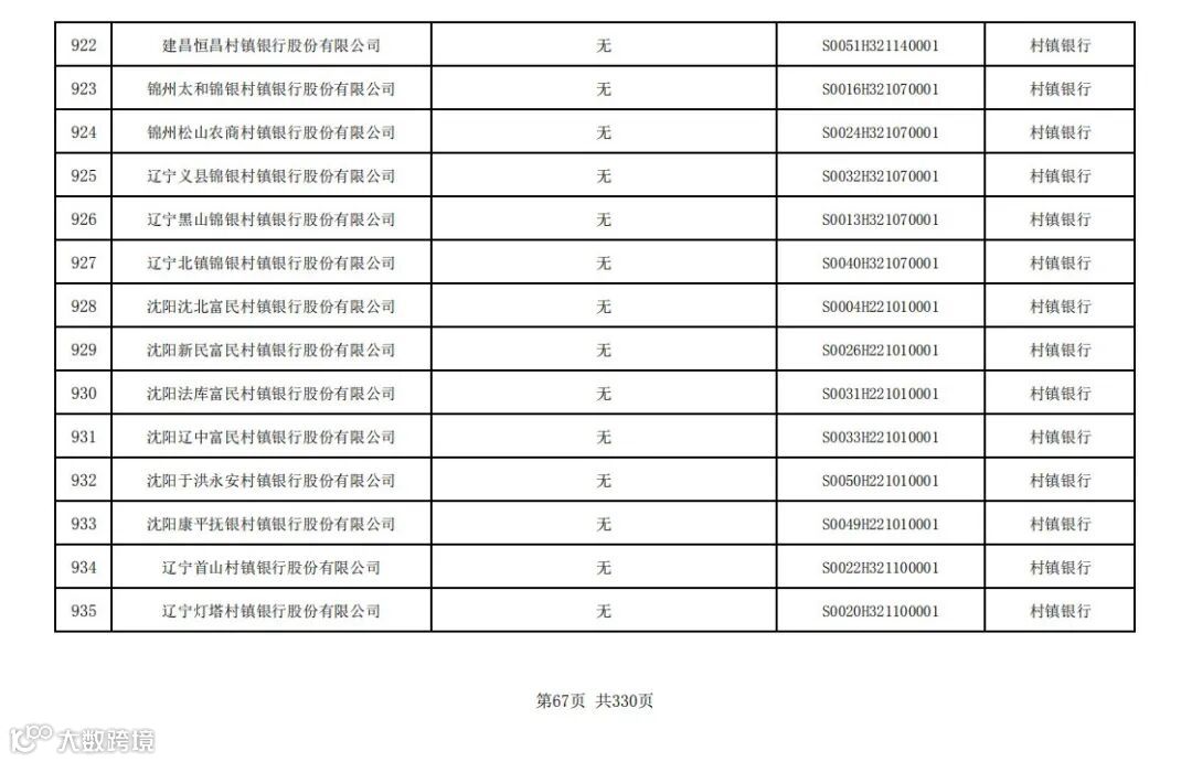 名单中包括1家开发性金融机构、2家政策性银行、6家国有大型商业银行、12家股份制商业银行、5家金融资产管理公司,以及住房储蓄银行、城市商业银行、民营银行、农村商业银行、村镇银行、贷款公司、农村信用社、农村资金互助社、外资法人银行、信托公司、金融租赁公司、企业集团财务公司、汽车金融公司、消费金融公司、货币经纪公司,此外还包括金融资产投资公司、银行理财子公司等在内的其他金融机构等,共计4601家。