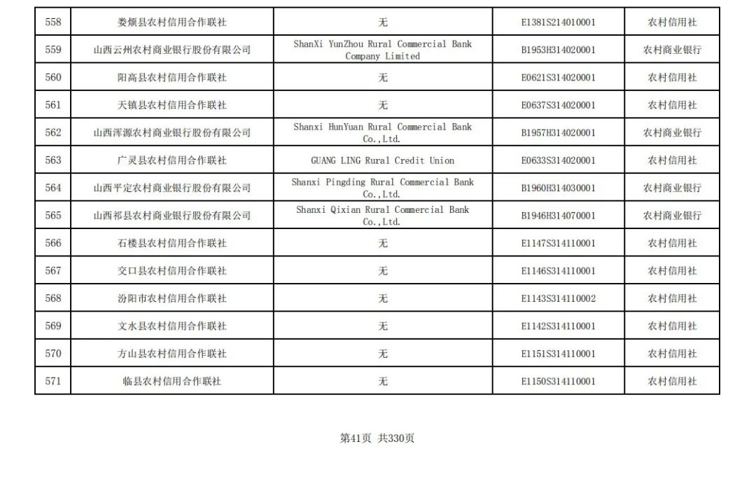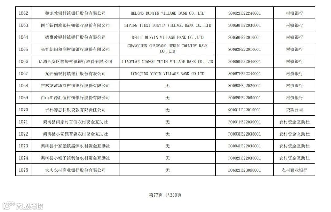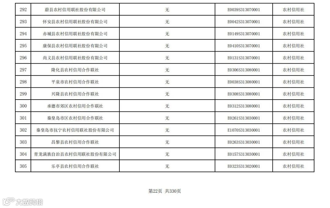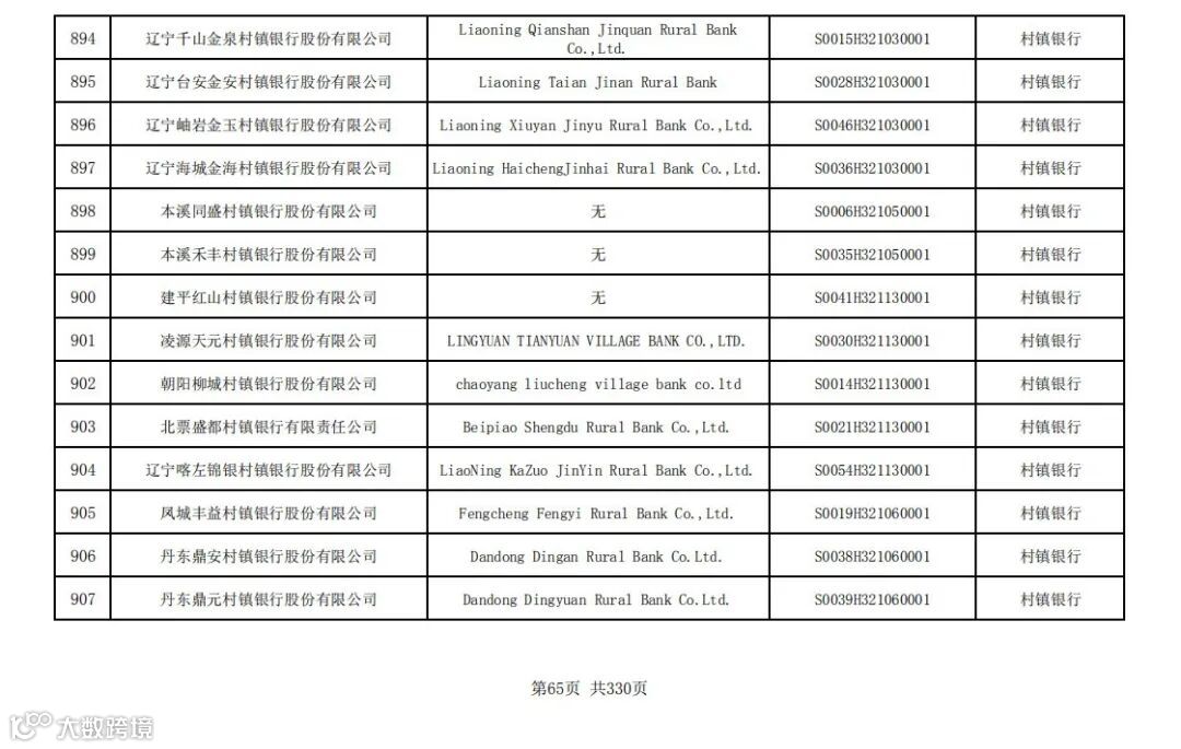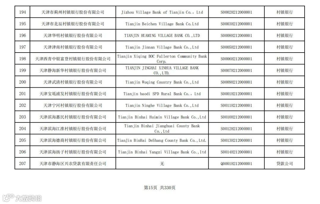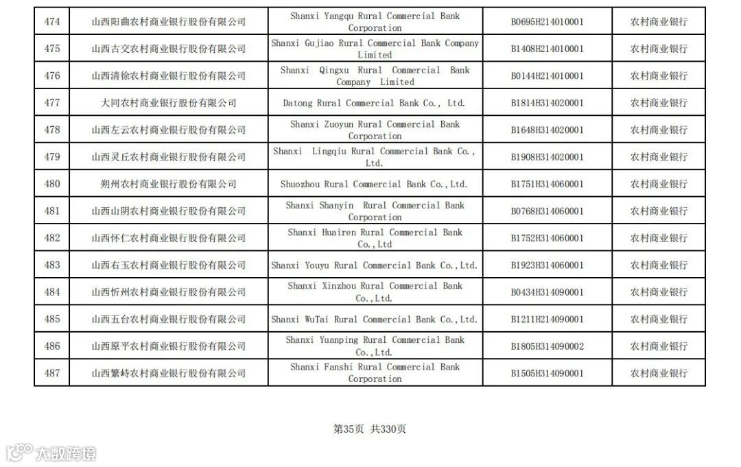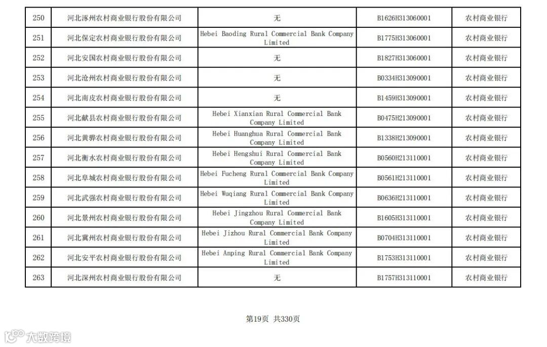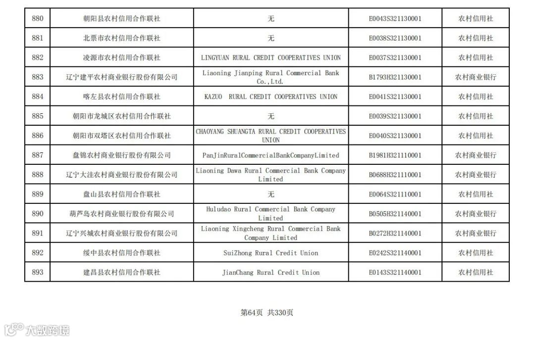 名单中包括1家开发性金融机构、2家政策性银行、6家国有大型商业银行、12家股份制商业银行、5家金融资产管理公司,以及住房储蓄银行、城市商业银行、民营银行、农村商业银行、村镇银行、贷款公司、农村信用社、农村资金互助社、外资法人银行、信托公司、金融租赁公司、企业集团财务公司、汽车金融公司、消费金融公司、货币经纪公司,此外还包括金融资产投资公司、银行理财子公司等在内的其他金融机构等,共计4601家。