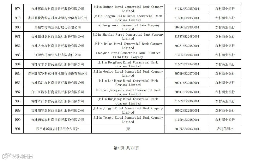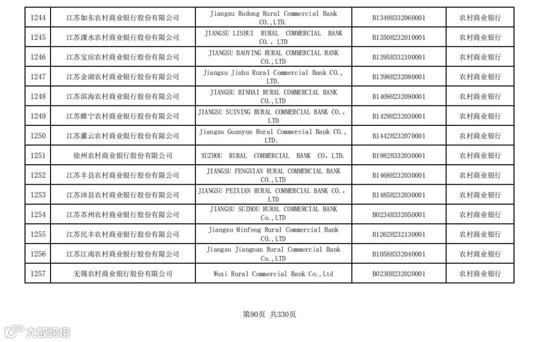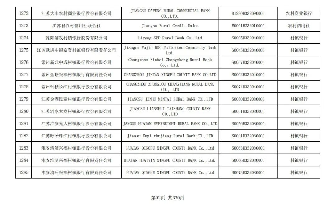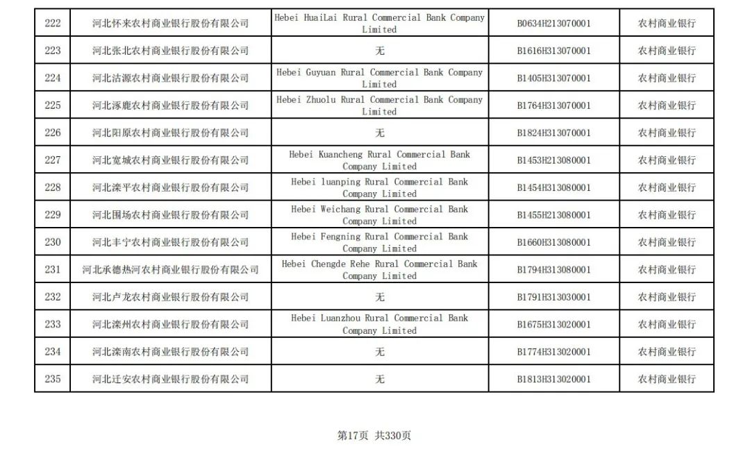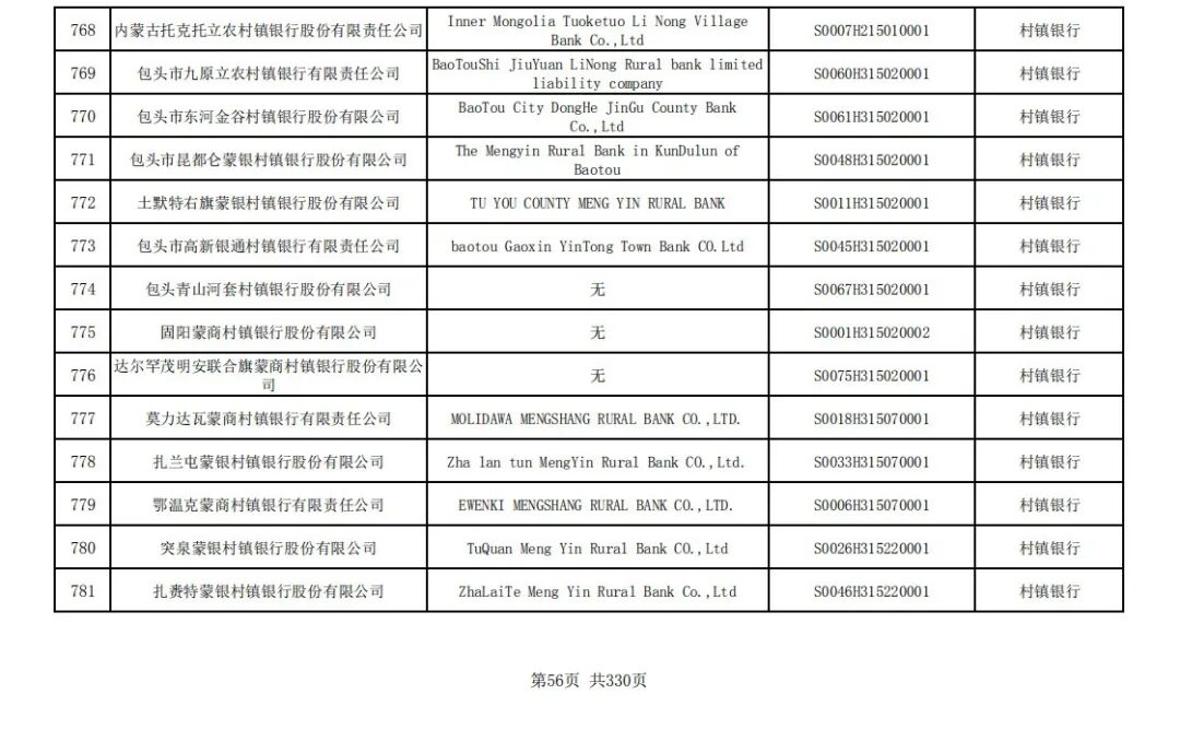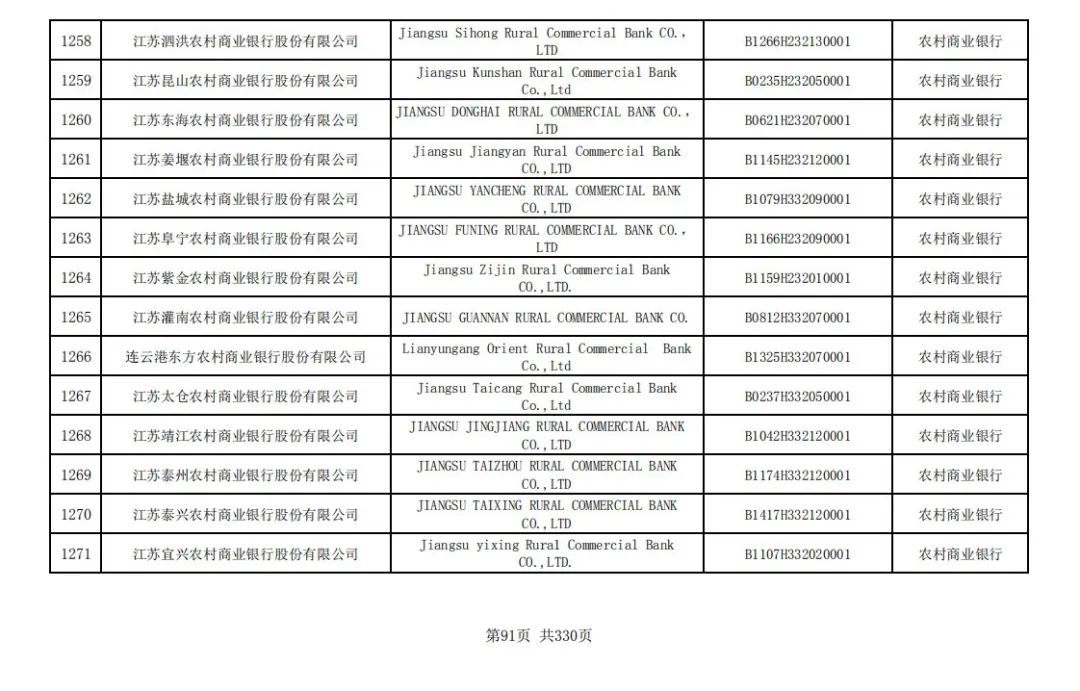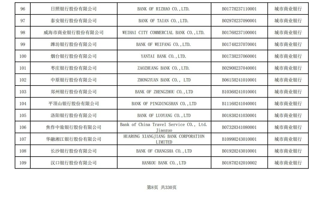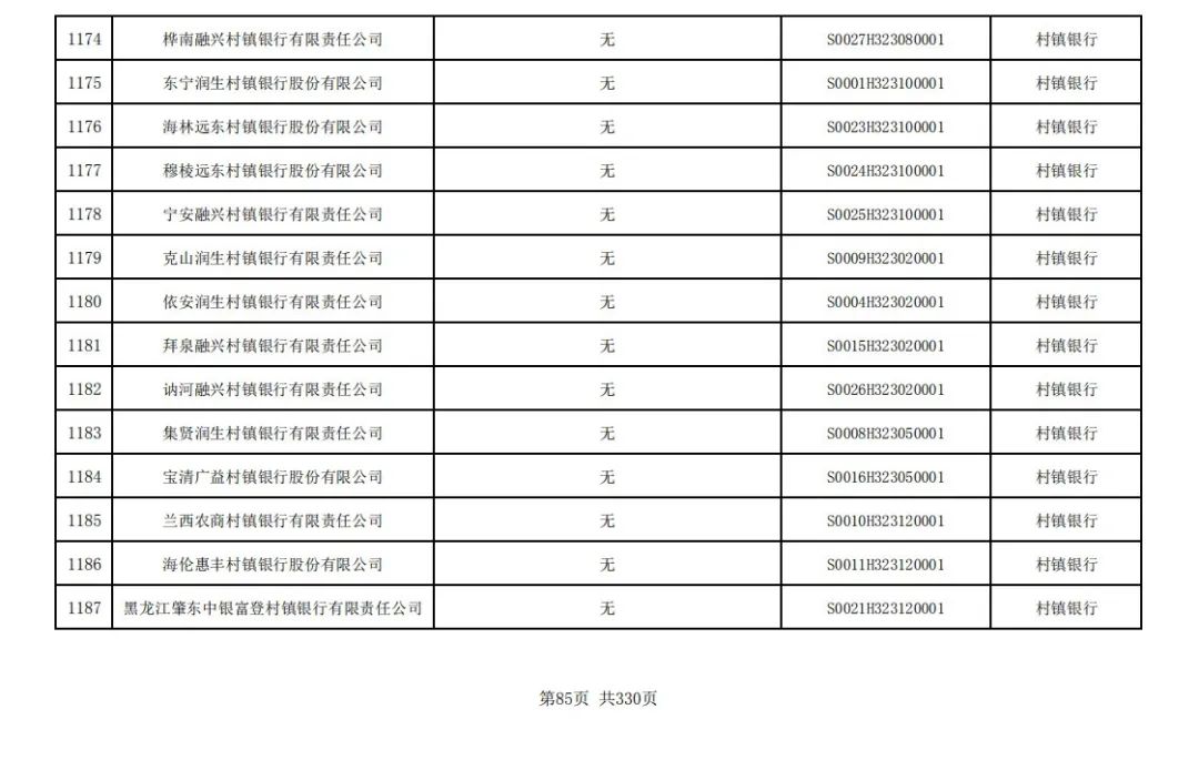 名单中包括1家开发性金融机构、2家政策性银行、6家国有大型商业银行、12家股份制商业银行、5家金融资产管理公司,以及住房储蓄银行、城市商业银行、民营银行、农村商业银行、村镇银行、贷款公司、农村信用社、农村资金互助社、外资法人银行、信托公司、金融租赁公司、企业集团财务公司、汽车金融公司、消费金融公司、货币经纪公司,此外还包括金融资产投资公司、银行理财子公司等在内的其他金融机构等,共计4601家。