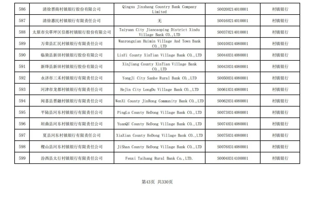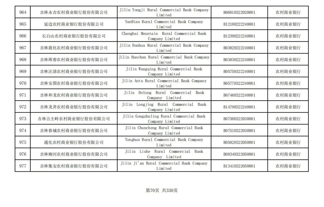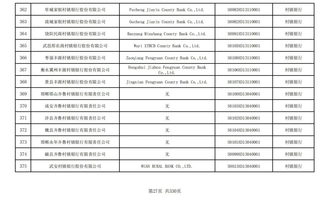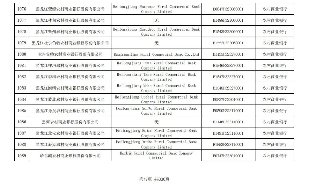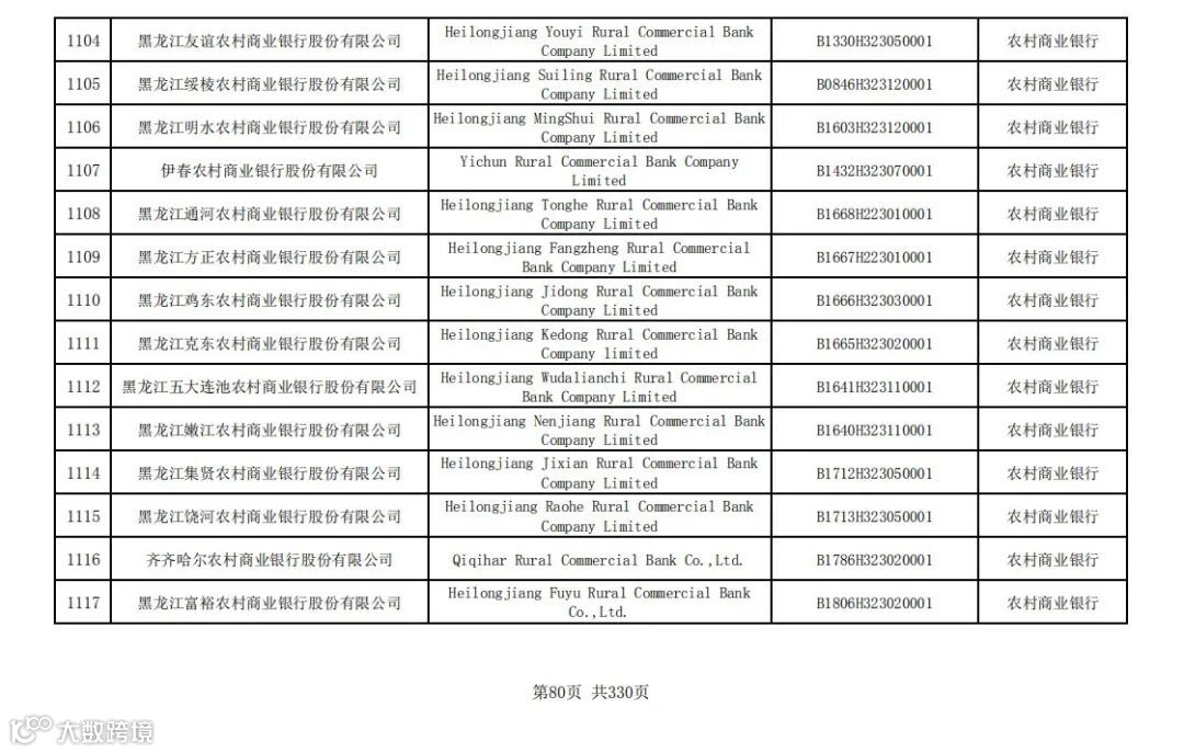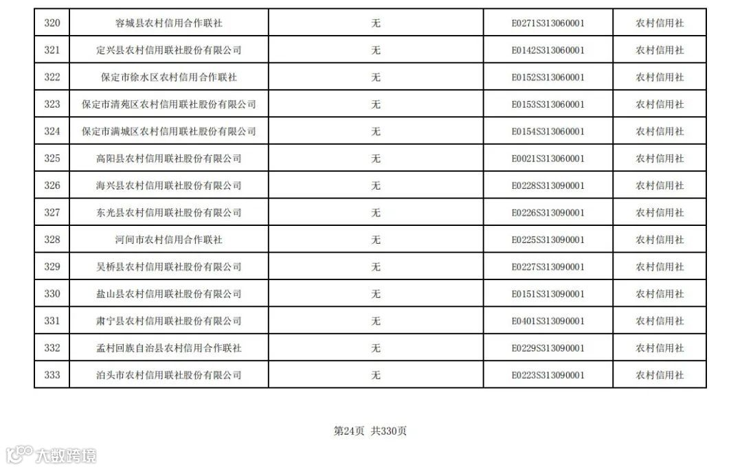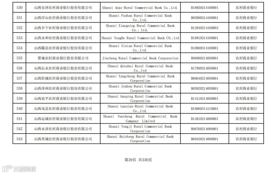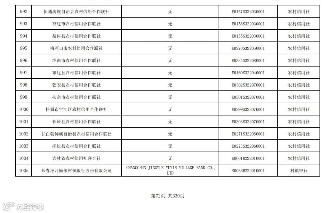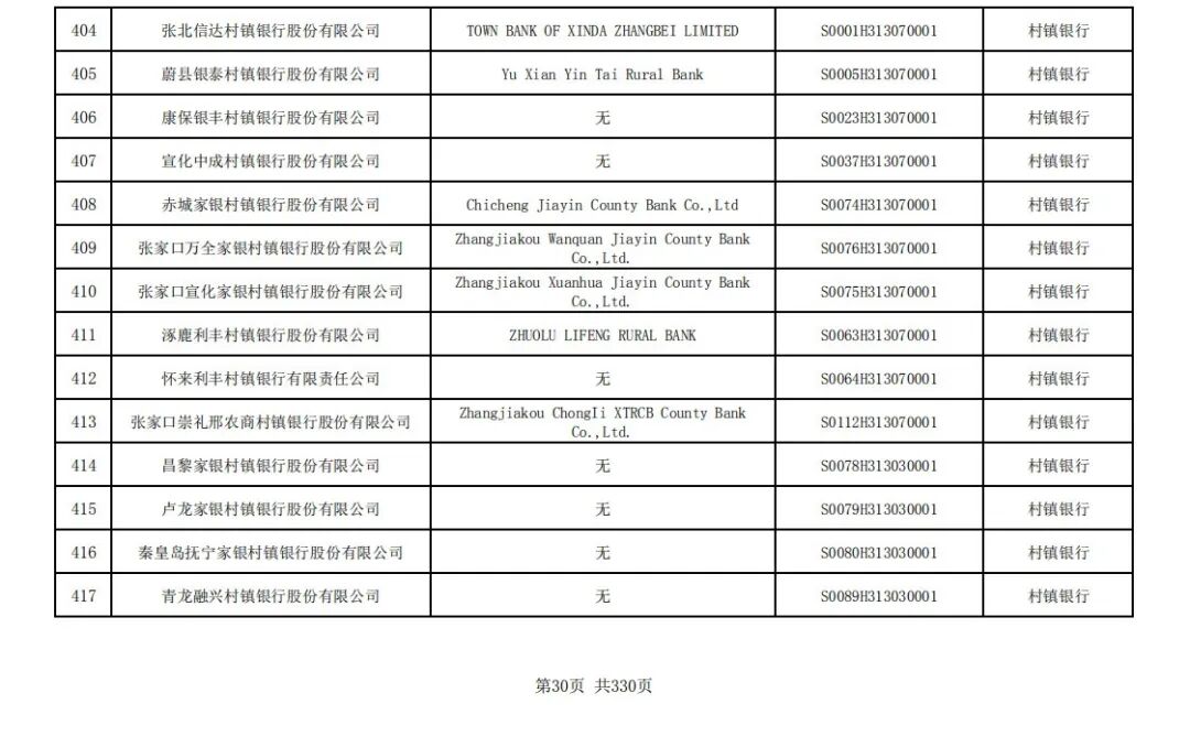 名单中包括1家开发性金融机构、2家政策性银行、6家国有大型商业银行、12家股份制商业银行、5家金融资产管理公司,以及住房储蓄银行、城市商业银行、民营银行、农村商业银行、村镇银行、贷款公司、农村信用社、农村资金互助社、外资法人银行、信托公司、金融租赁公司、企业集团财务公司、汽车金融公司、消费金融公司、货币经纪公司,此外还包括金融资产投资公司、银行理财子公司等在内的其他金融机构等,共计4601家。