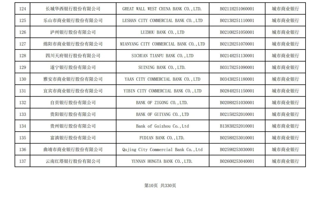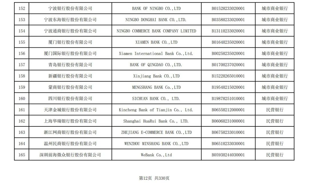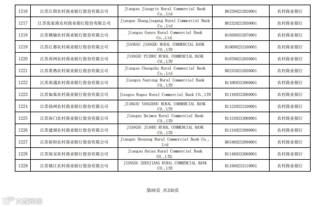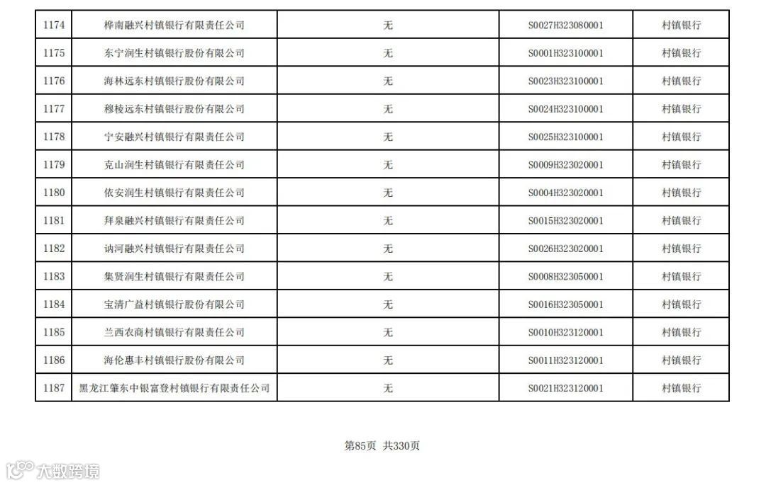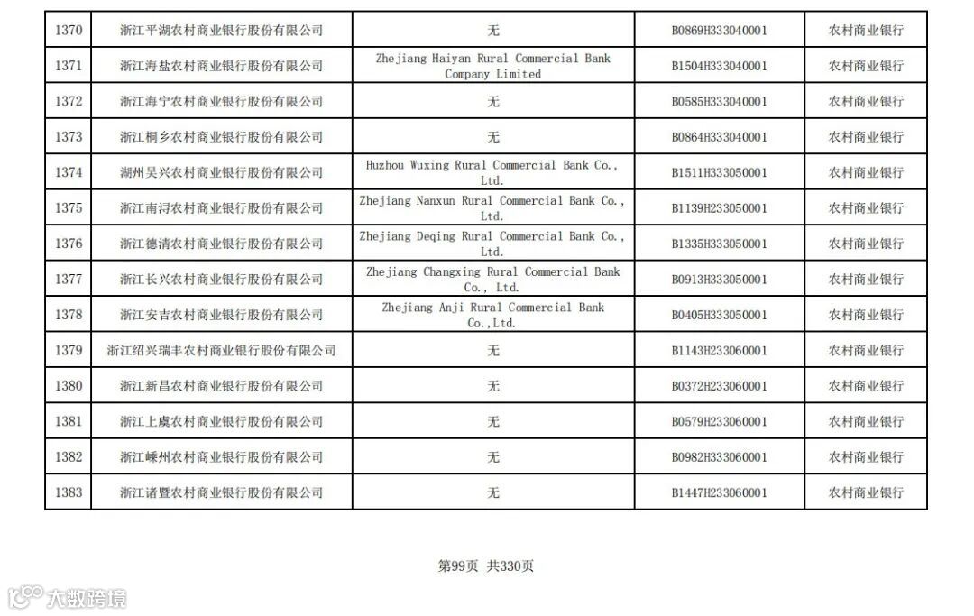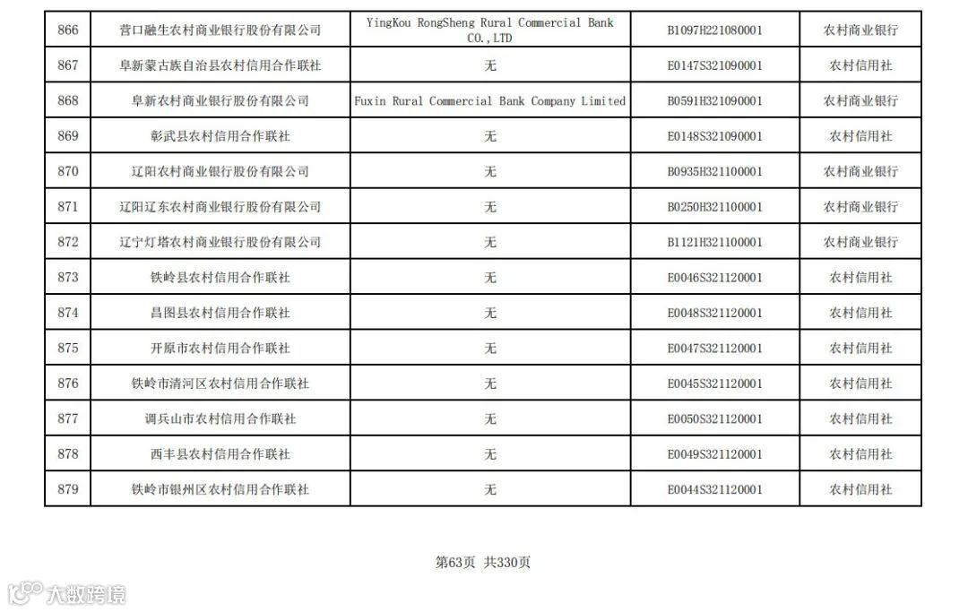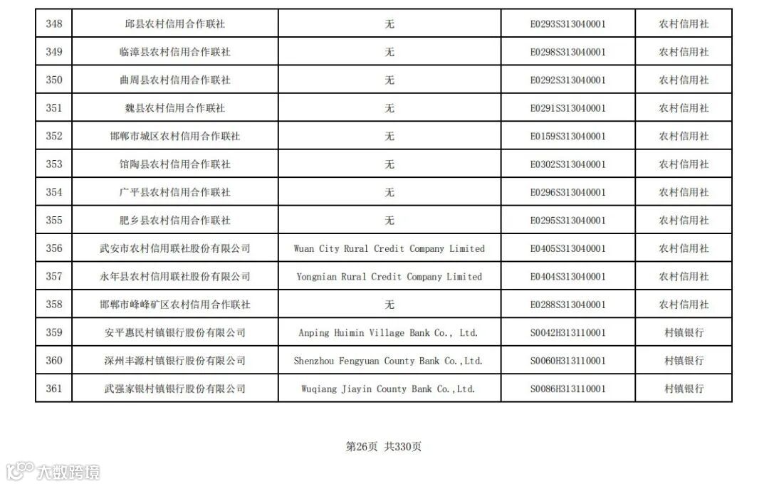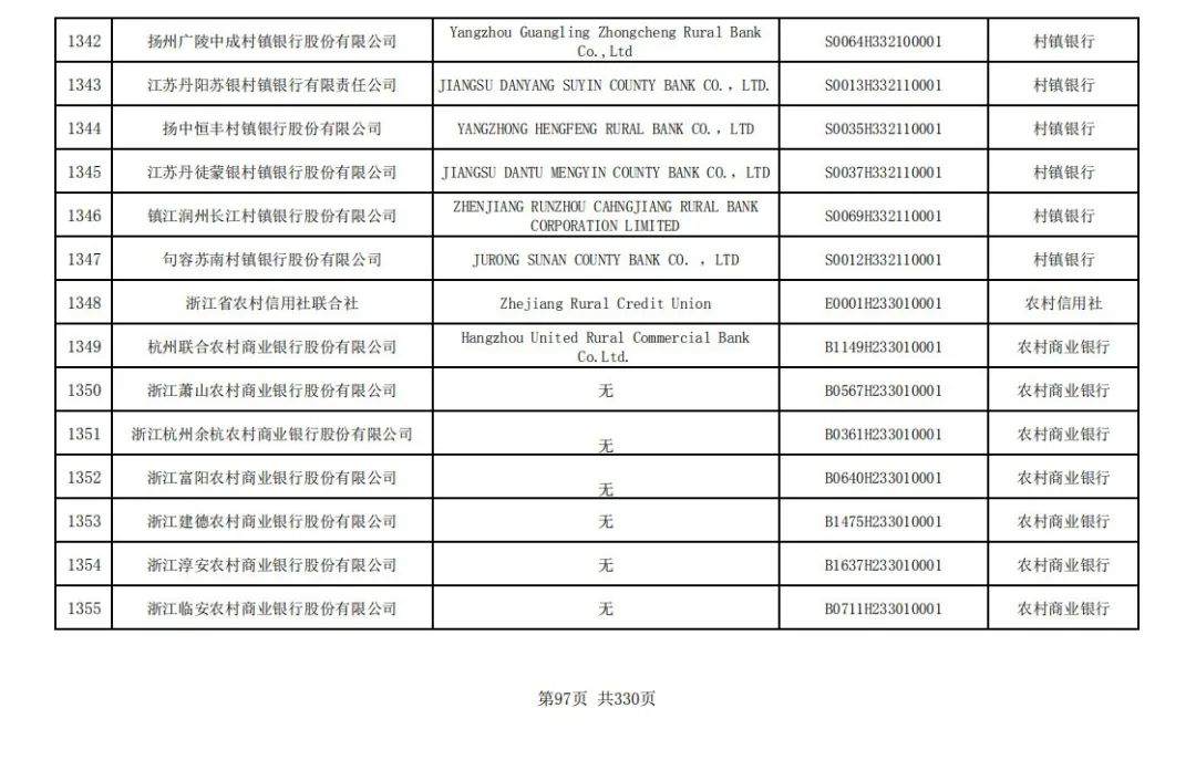 名单中包括1家开发性金融机构、2家政策性银行、6家国有大型商业银行、12家股份制商业银行、5家金融资产管理公司,以及住房储蓄银行、城市商业银行、民营银行、农村商业银行、村镇银行、贷款公司、农村信用社、农村资金互助社、外资法人银行、信托公司、金融租赁公司、企业集团财务公司、汽车金融公司、消费金融公司、货币经纪公司,此外还包括金融资产投资公司、银行理财子公司等在内的其他金融机构等,共计4601家。