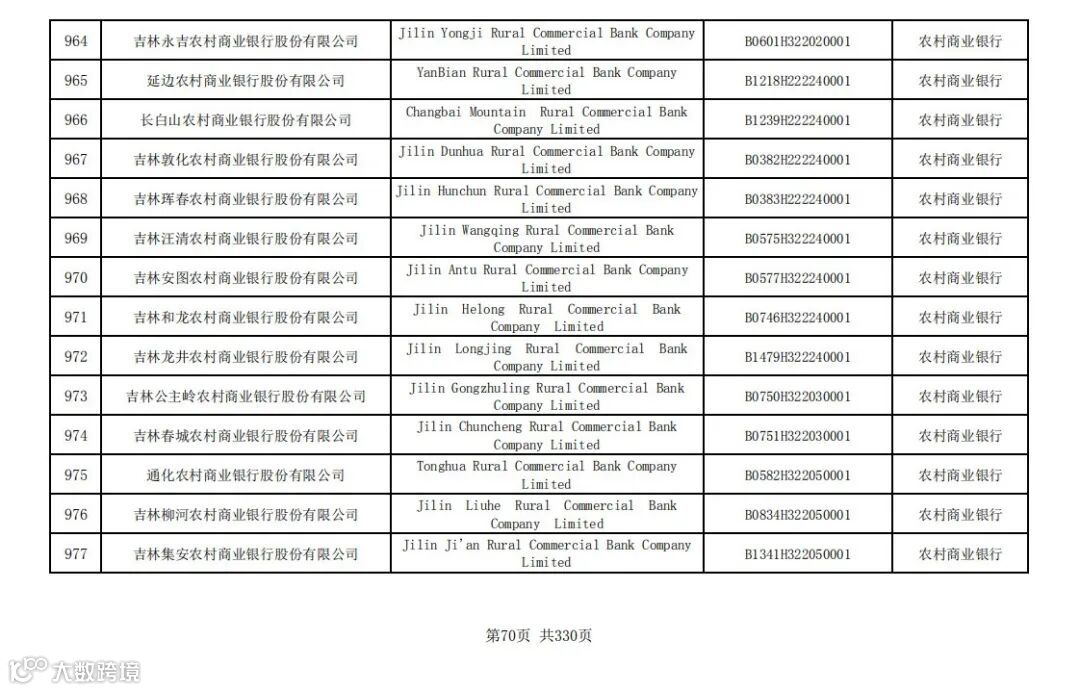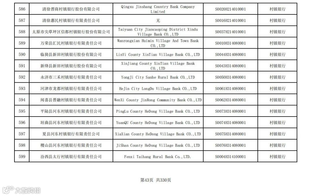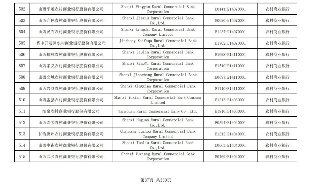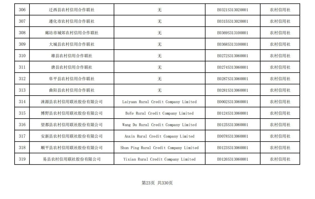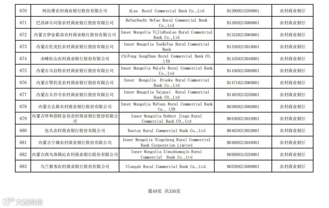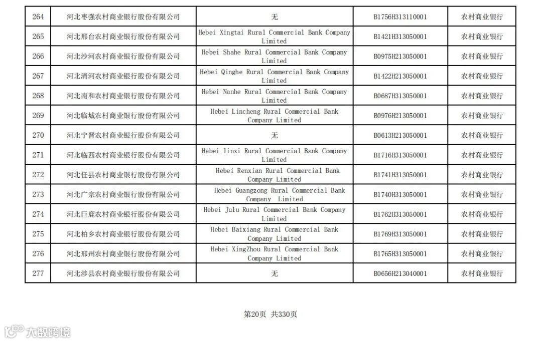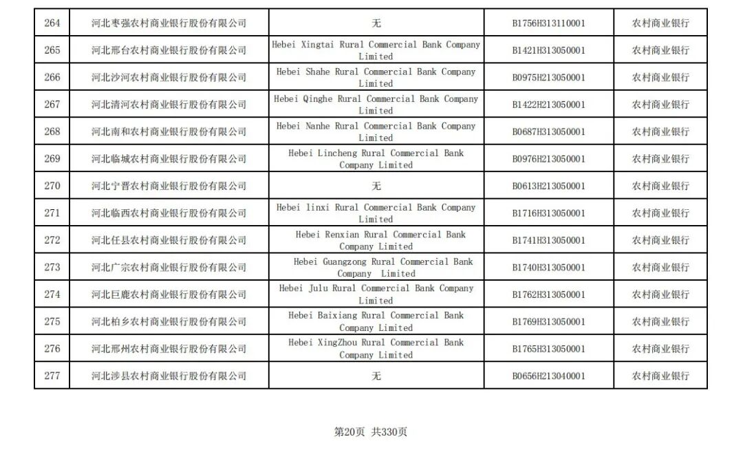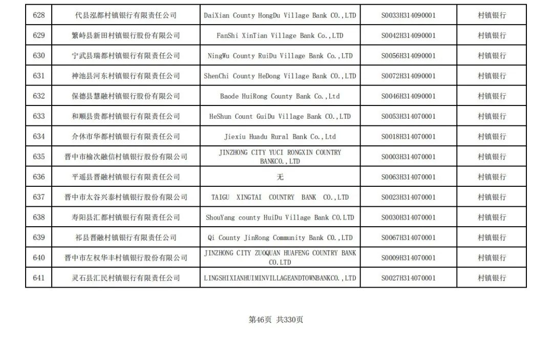 名单中包括1家开发性金融机构、2家政策性银行、6家国有大型商业银行、12家股份制商业银行、5家金融资产管理公司,以及住房储蓄银行、城市商业银行、民营银行、农村商业银行、村镇银行、贷款公司、农村信用社、农村资金互助社、外资法人银行、信托公司、金融租赁公司、企业集团财务公司、汽车金融公司、消费金融公司、货币经纪公司,此外还包括金融资产投资公司、银行理财子公司等在内的其他金融机构等,共计4601家。
