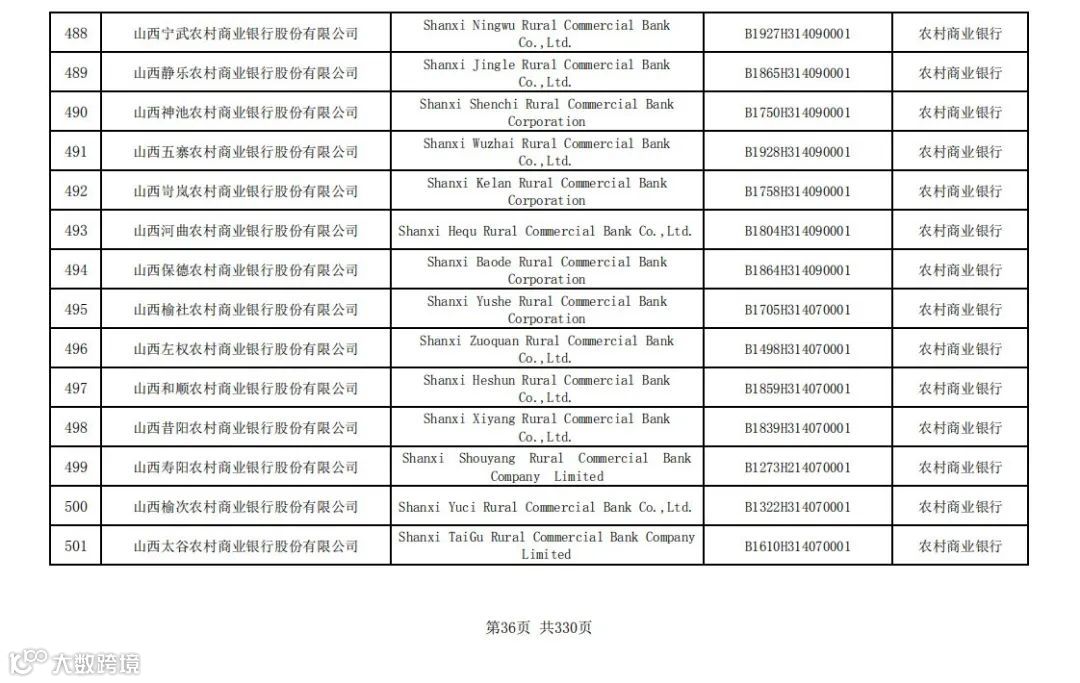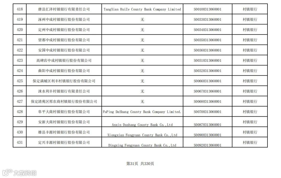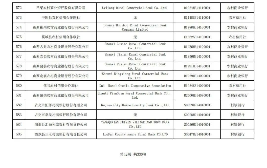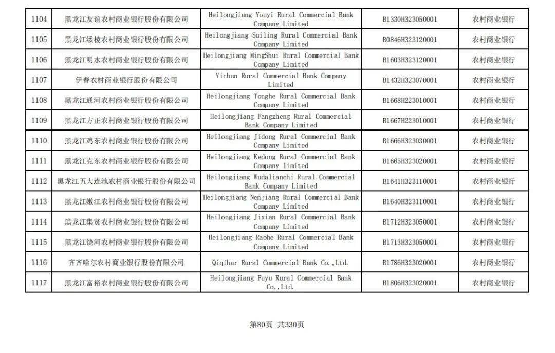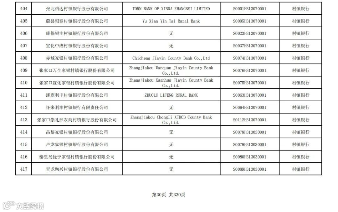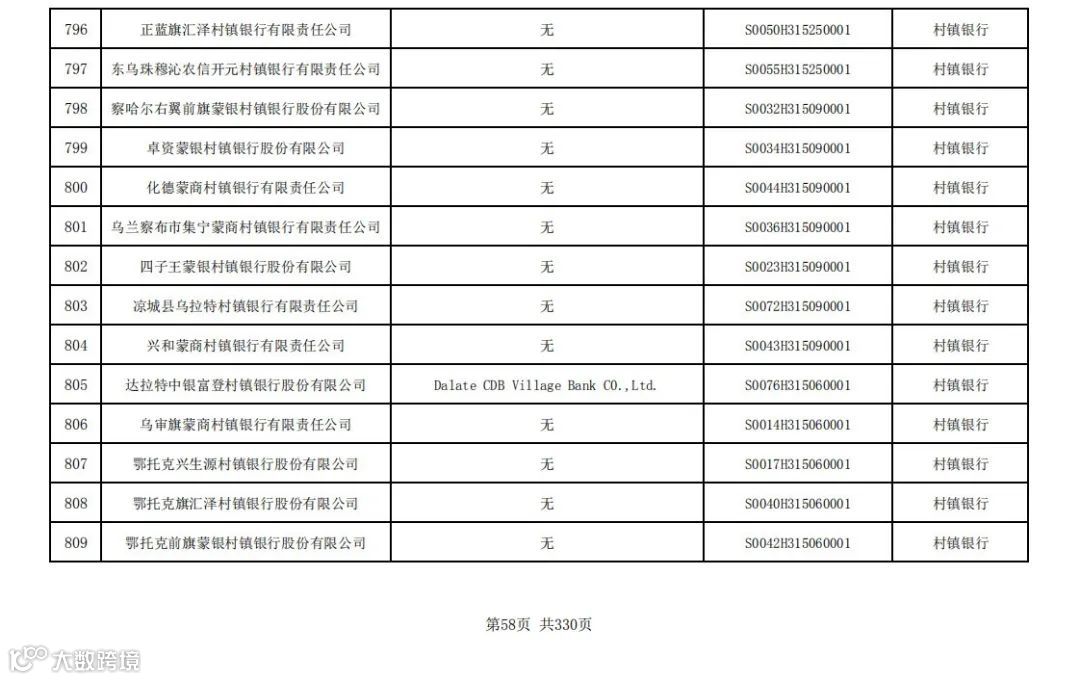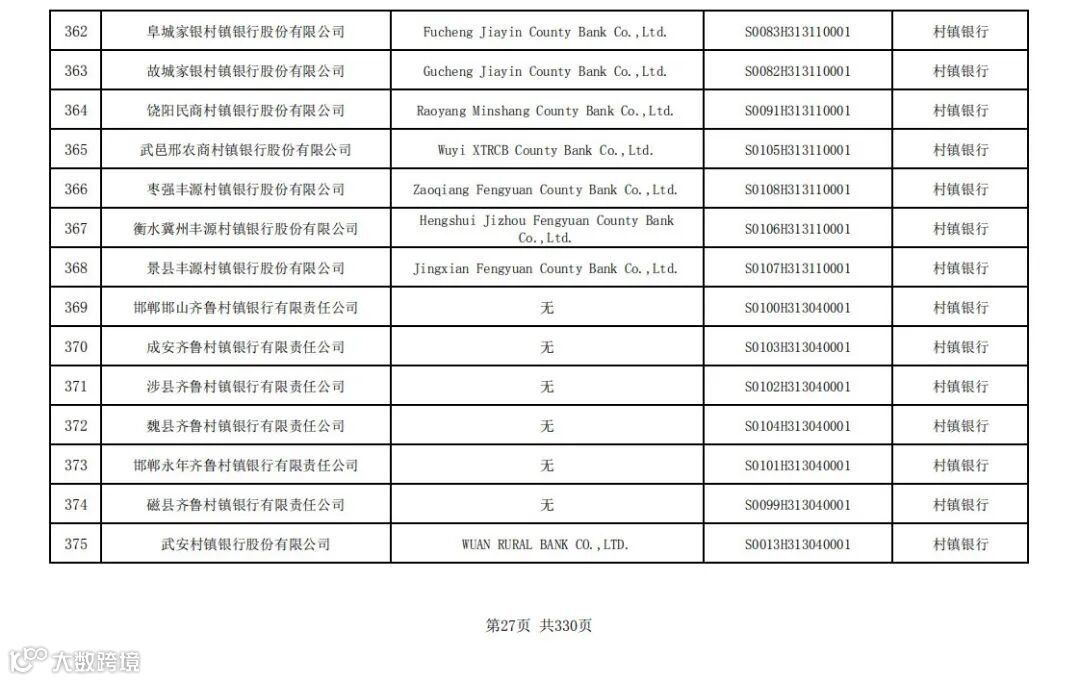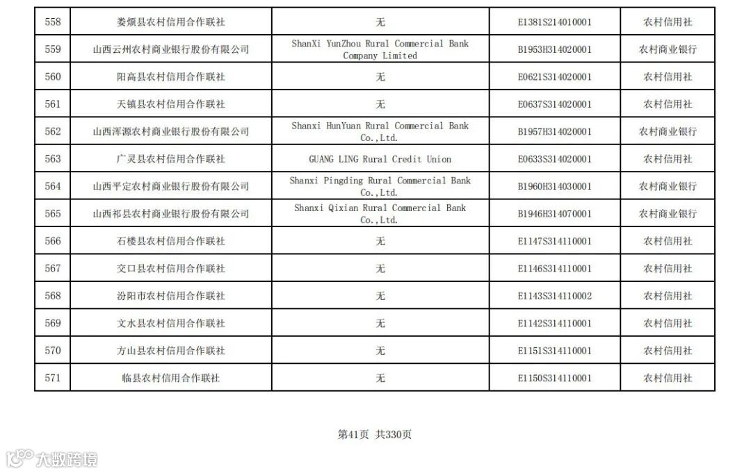 名单中包括1家开发性金融机构、2家政策性银行、6家国有大型商业银行、12家股份制商业银行、5家金融资产管理公司,以及住房储蓄银行、城市商业银行、民营银行、农村商业银行、村镇银行、贷款公司、农村信用社、农村资金互助社、外资法人银行、信托公司、金融租赁公司、企业集团财务公司、汽车金融公司、消费金融公司、货币经纪公司,此外还包括金融资产投资公司、银行理财子公司等在内的其他金融机构等,共计4601家。
