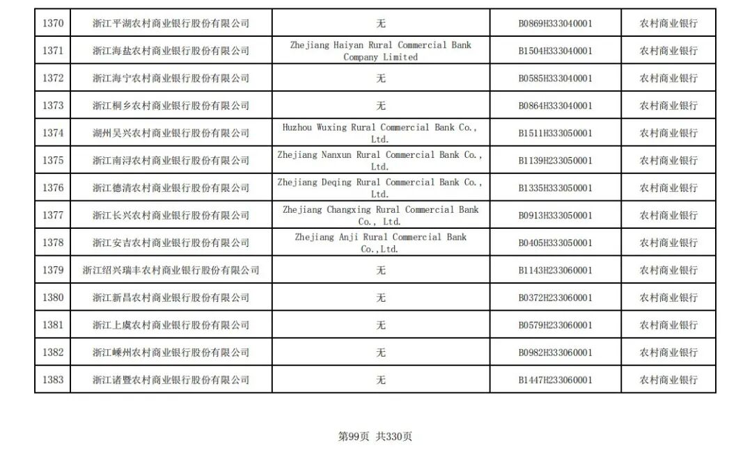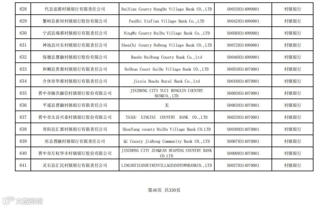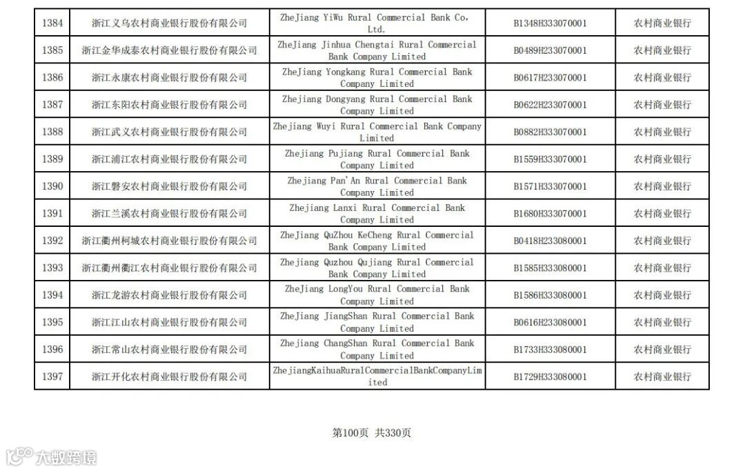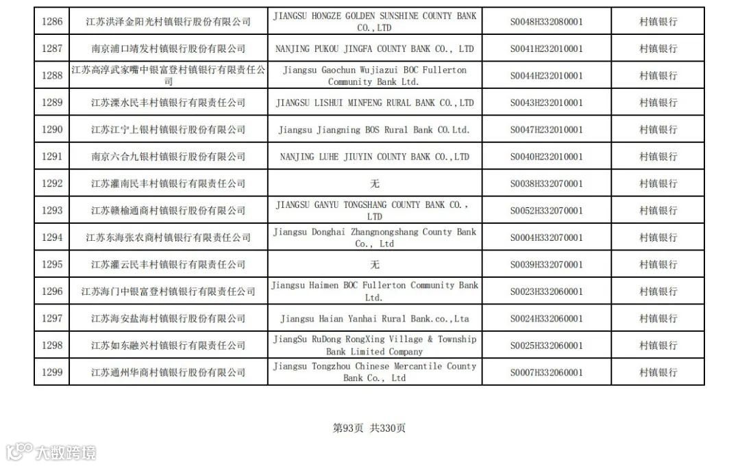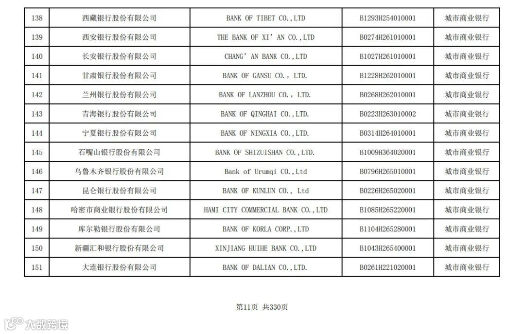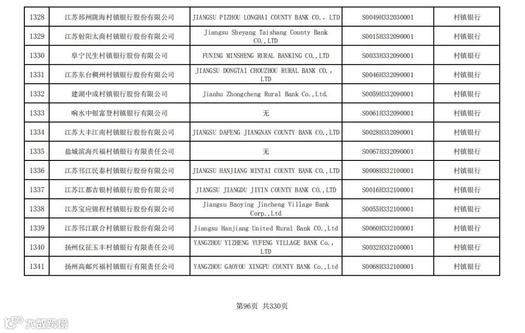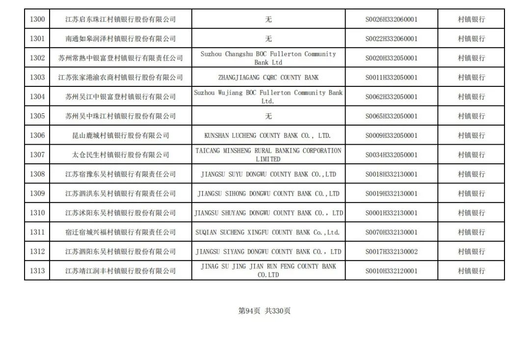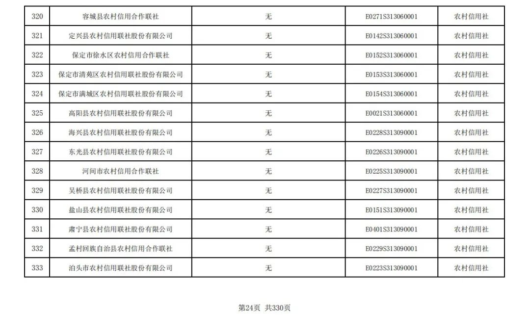 名单中包括1家开发性金融机构、2家政策性银行、6家国有大型商业银行、12家股份制商业银行、5家金融资产管理公司,以及住房储蓄银行、城市商业银行、民营银行、农村商业银行、村镇银行、贷款公司、农村信用社、农村资金互助社、外资法人银行、信托公司、金融租赁公司、企业集团财务公司、汽车金融公司、消费金融公司、货币经纪公司,此外还包括金融资产投资公司、银行理财子公司等在内的其他金融机构等,共计4601家。