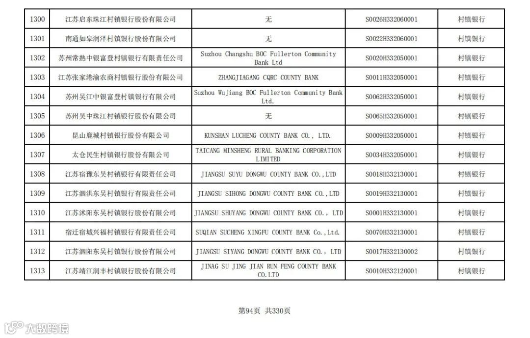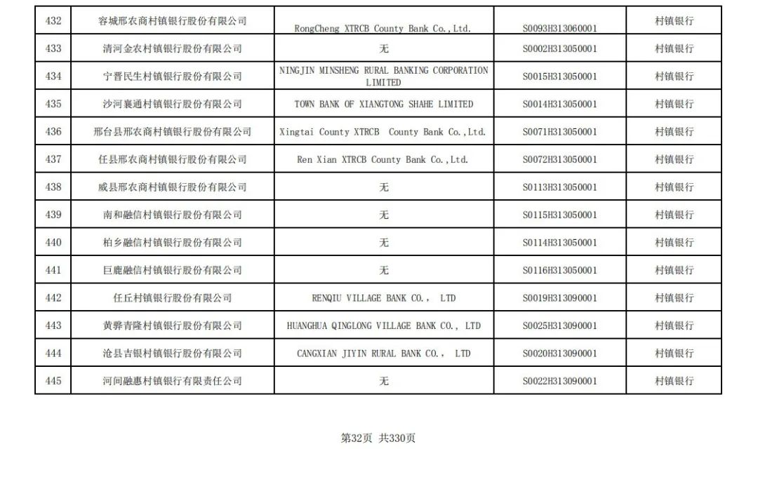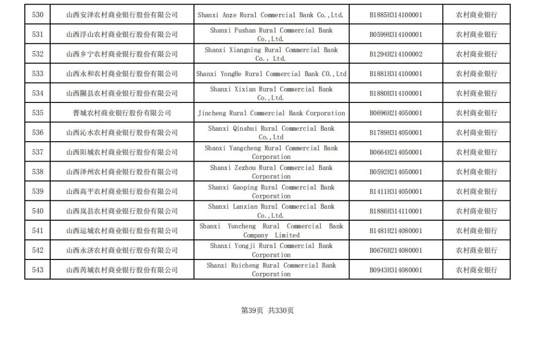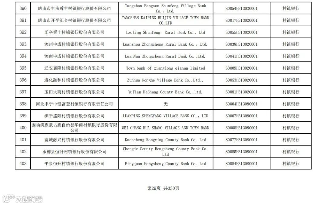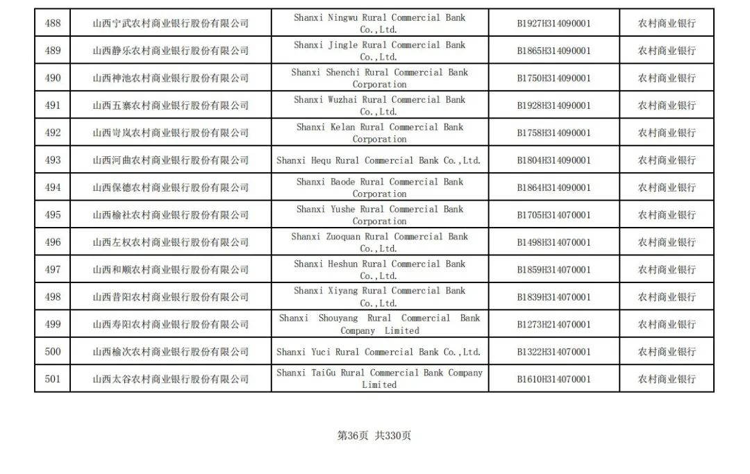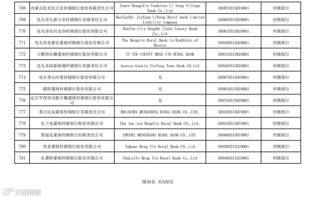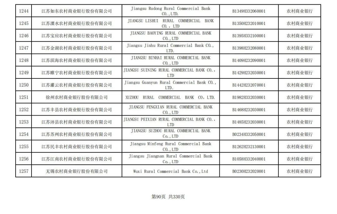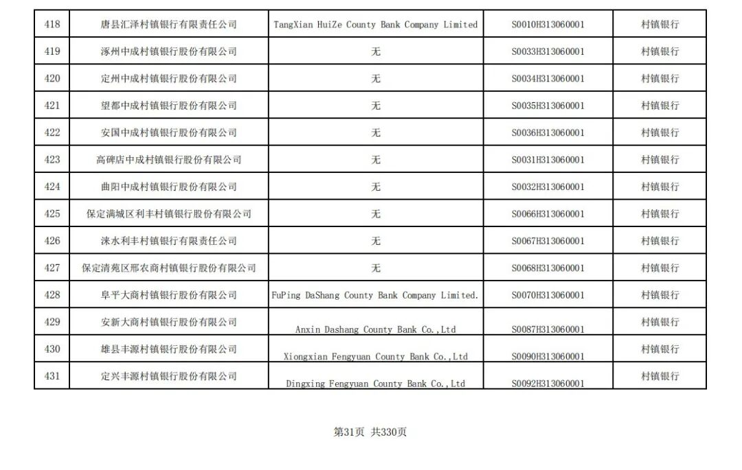 名单中包括1家开发性金融机构、2家政策性银行、6家国有大型商业银行、12家股份制商业银行、5家金融资产管理公司,以及住房储蓄银行、城市商业银行、民营银行、农村商业银行、村镇银行、贷款公司、农村信用社、农村资金互助社、外资法人银行、信托公司、金融租赁公司、企业集团财务公司、汽车金融公司、消费金融公司、货币经纪公司,此外还包括金融资产投资公司、银行理财子公司等在内的其他金融机构等,共计4601家。