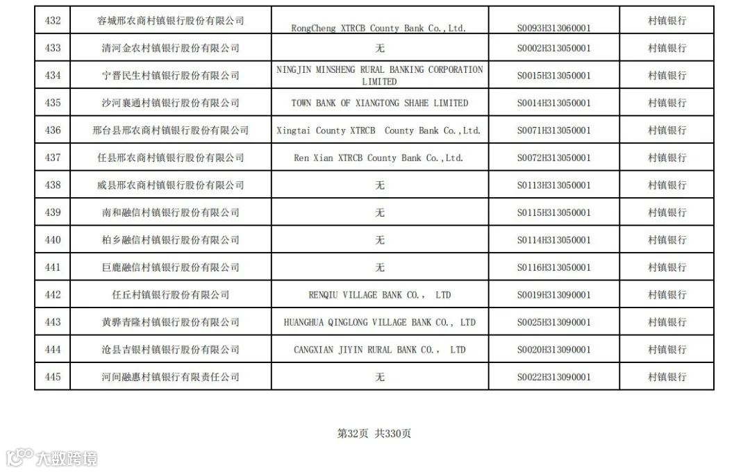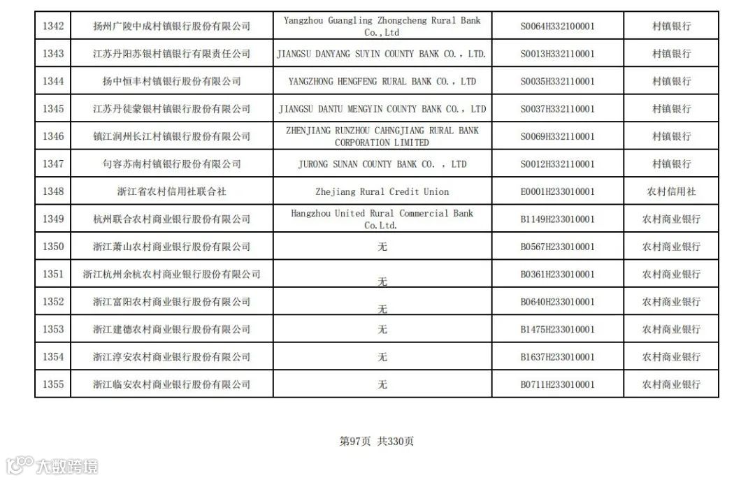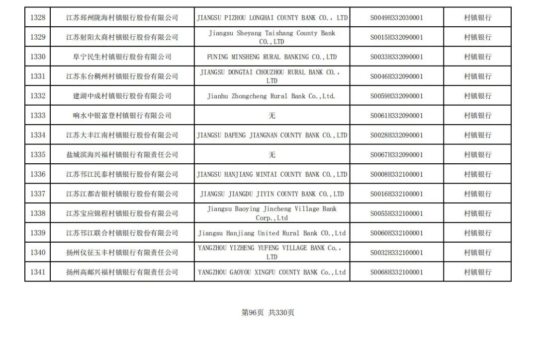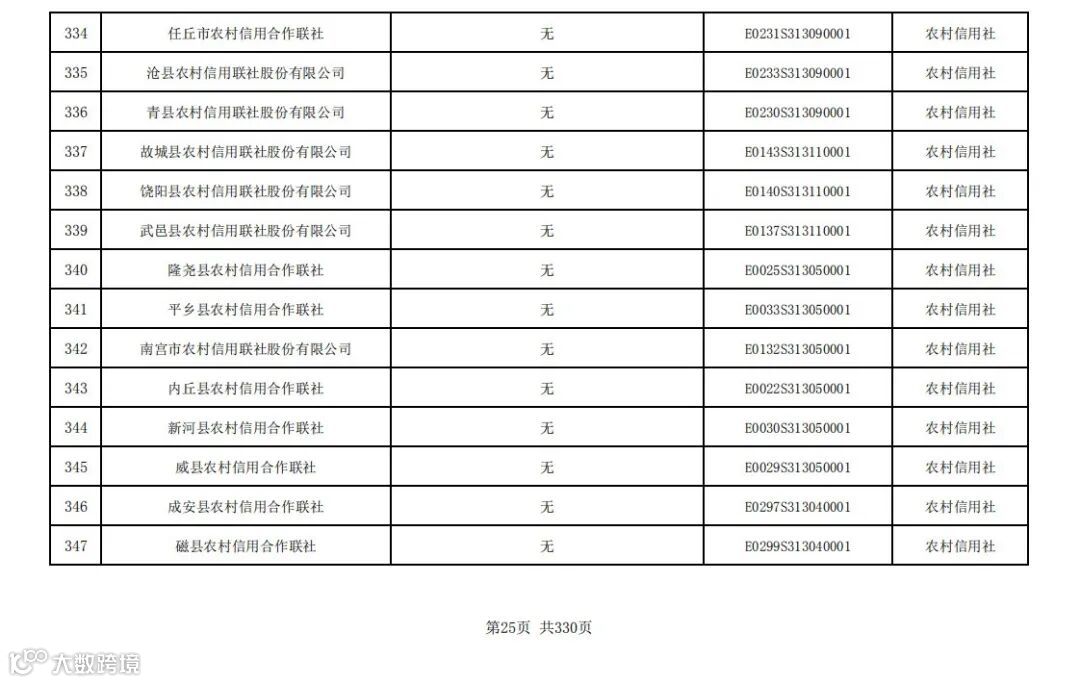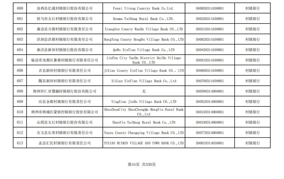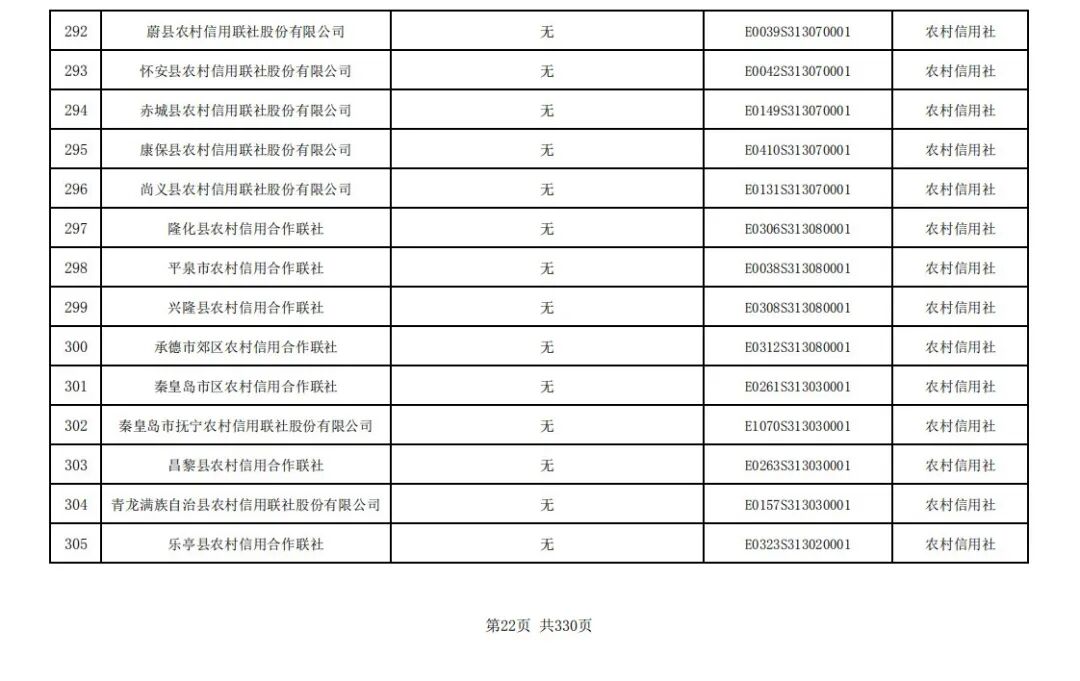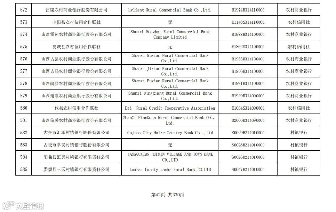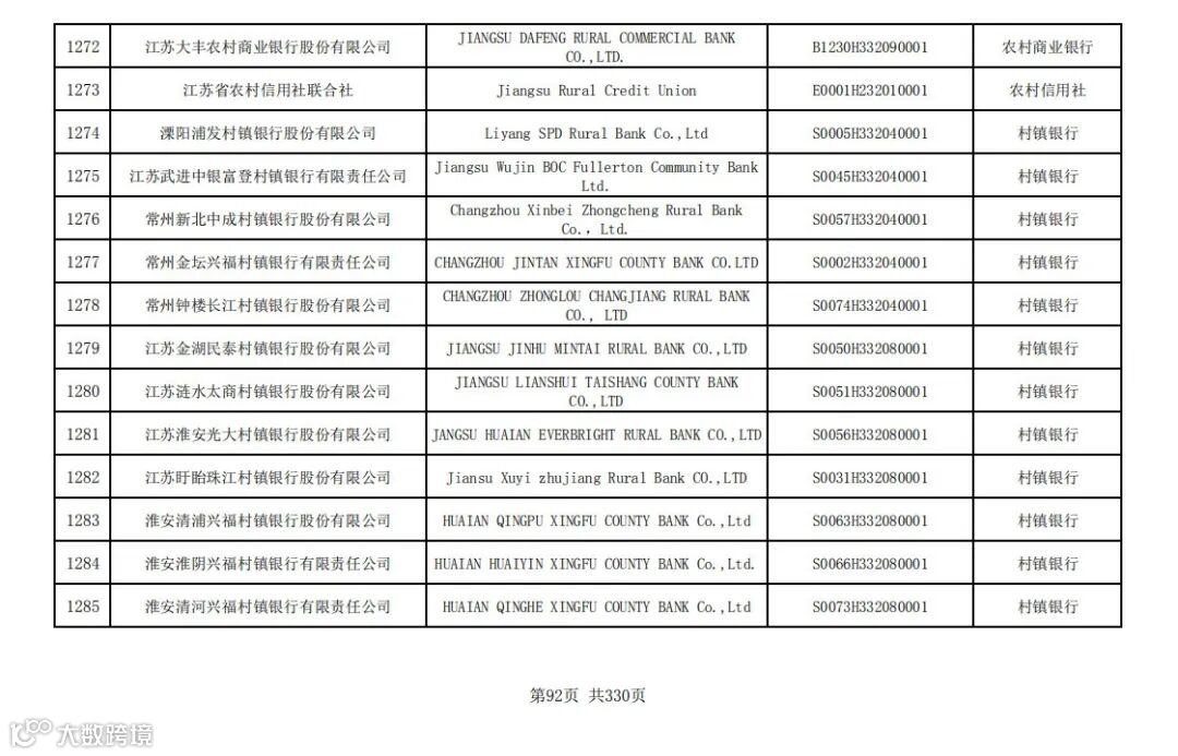 名单中包括1家开发性金融机构、2家政策性银行、6家国有大型商业银行、12家股份制商业银行、5家金融资产管理公司,以及住房储蓄银行、城市商业银行、民营银行、农村商业银行、村镇银行、贷款公司、农村信用社、农村资金互助社、外资法人银行、信托公司、金融租赁公司、企业集团财务公司、汽车金融公司、消费金融公司、货币经纪公司,此外还包括金融资产投资公司、银行理财子公司等在内的其他金融机构等,共计4601家。