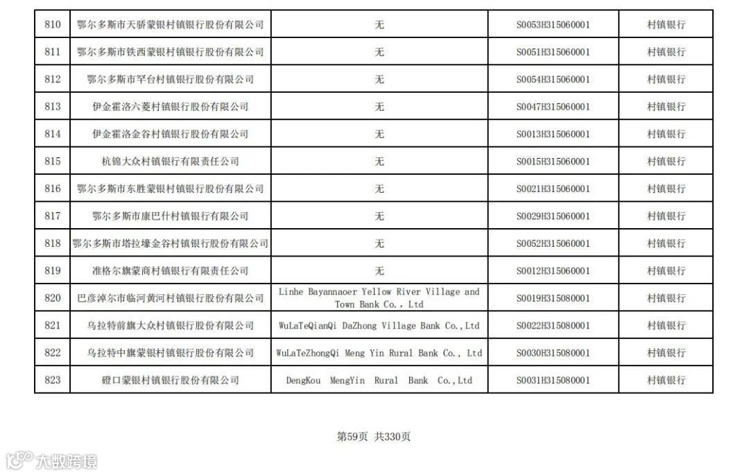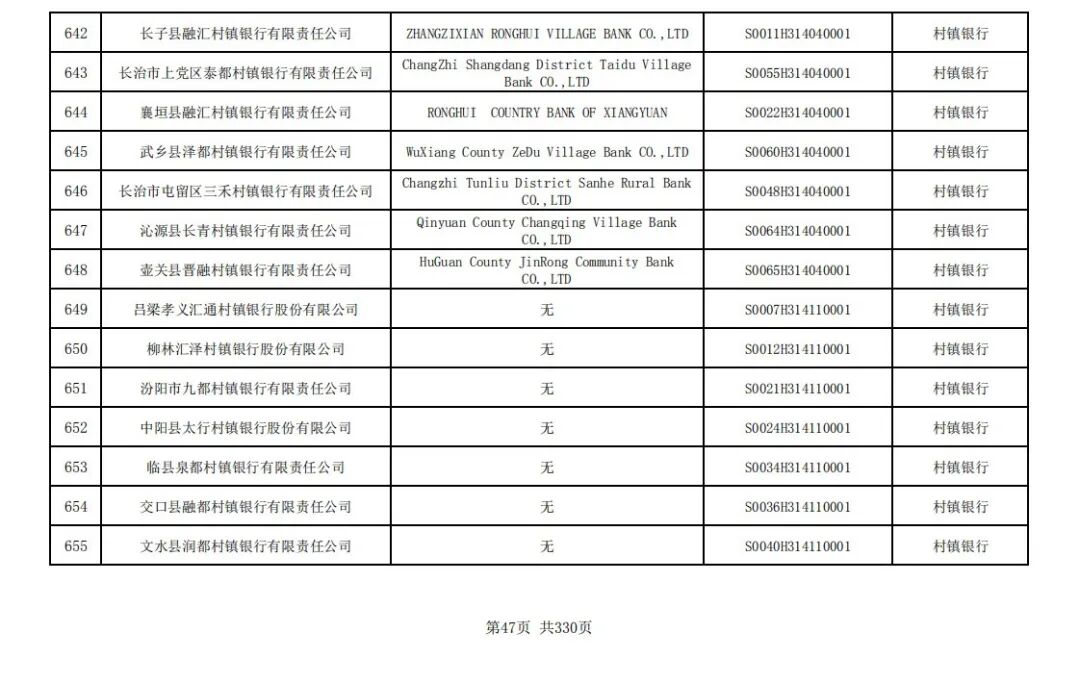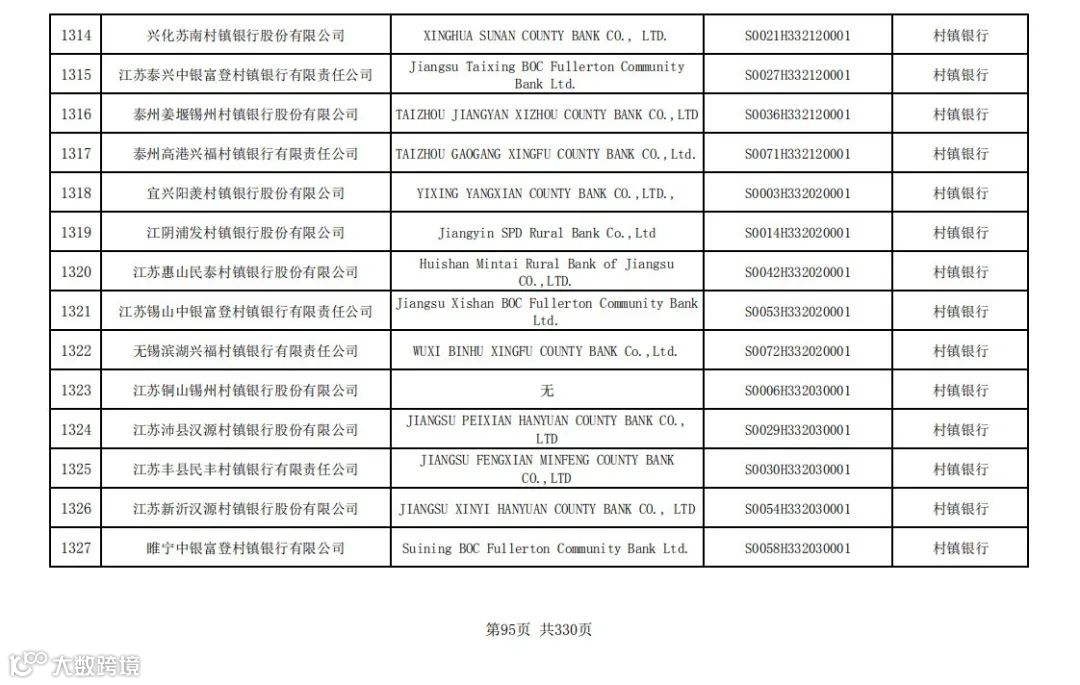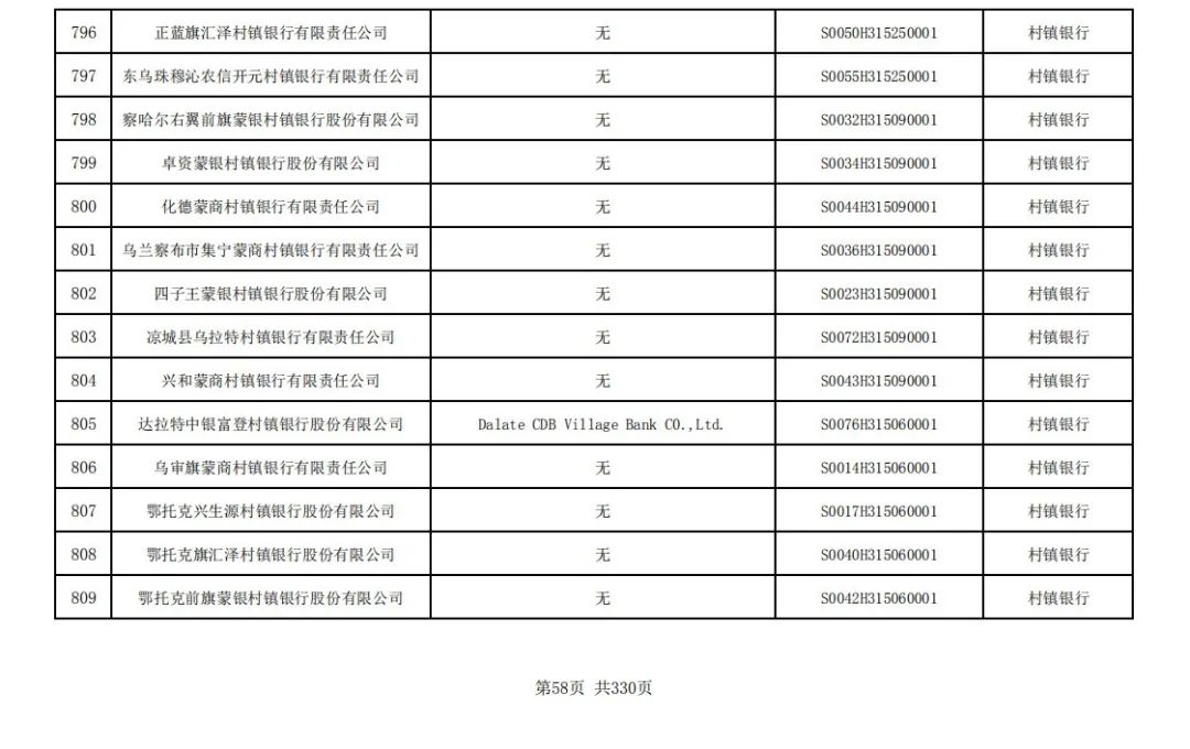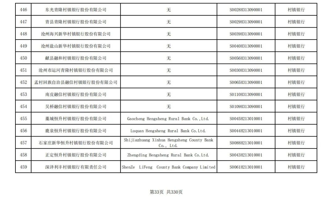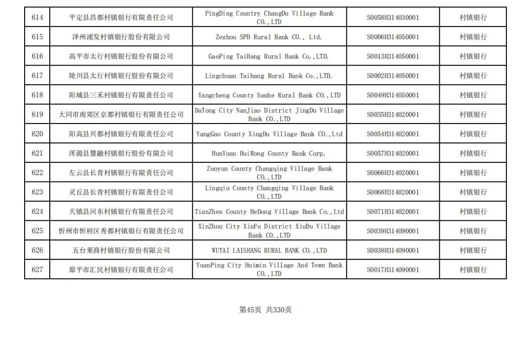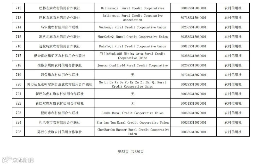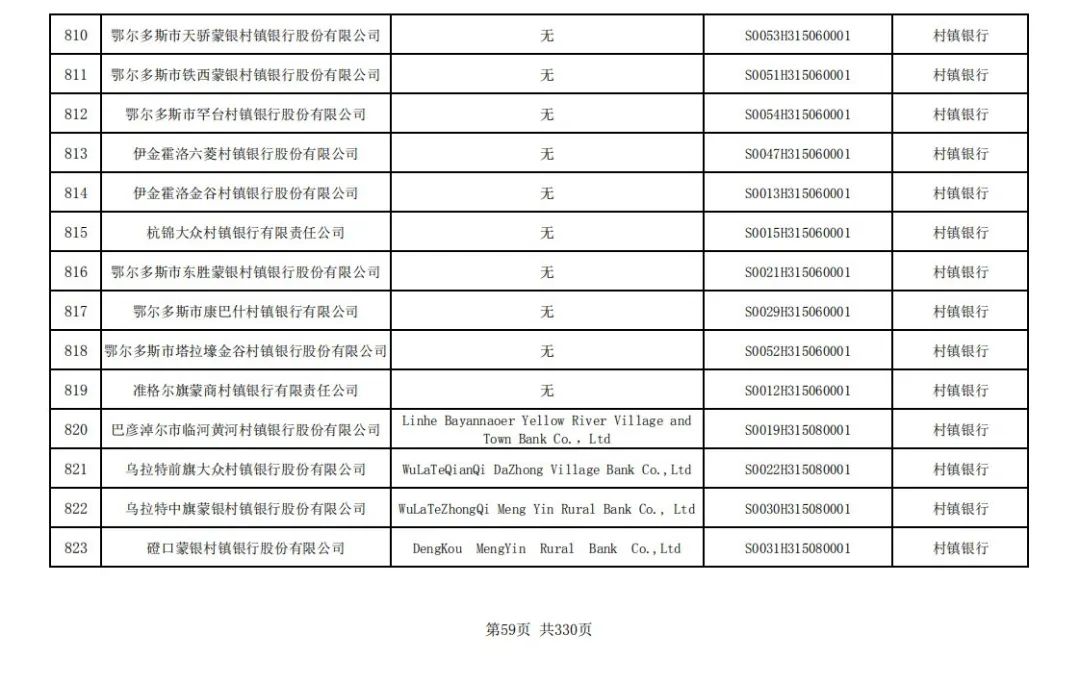 名单中包括1家开发性金融机构、2家政策性银行、6家国有大型商业银行、12家股份制商业银行、5家金融资产管理公司,以及住房储蓄银行、城市商业银行、民营银行、农村商业银行、村镇银行、贷款公司、农村信用社、农村资金互助社、外资法人银行、信托公司、金融租赁公司、企业集团财务公司、汽车金融公司、消费金融公司、货币经纪公司,此外还包括金融资产投资公司、银行理财子公司等在内的其他金融机构等,共计4601家。