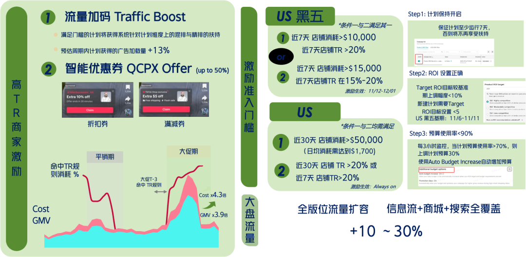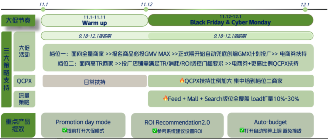 同时我们要非常清楚平台的节奏和策略,跟着平台节奏准备和运营才能最大程度吃到大促红利,而在大促期间最高效直接的放量工具还是广告,我们如何依赖GMV MAX这个广告产品最大化推广效果也是值得去思考的问题,这里是平台黑五大促产品策略overview: