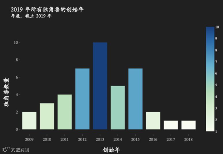 一般而言,初创企业从诞生到身价过十亿都需要成长几年。但也有少数情况是“生来不凡”的。下面这张图是截止 2019 年6 月,所有独角兽的创始年。