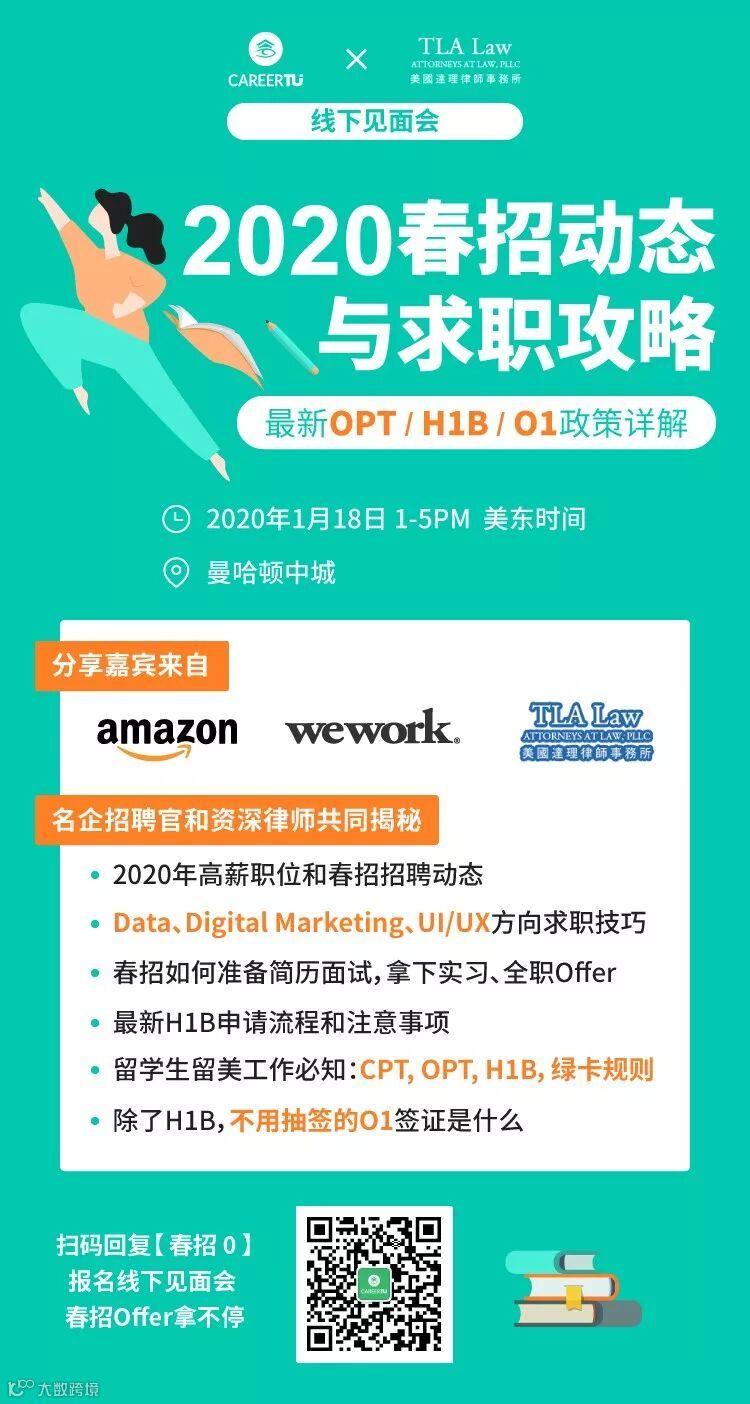 职图CareerTu携手达理律师事务所,邀请Amazon、Wework的资深招聘官,及多位权威律师,将在2020年1月18日,在曼哈顿中城举行一场见面会,为大家揭秘2020年春招求职趋势,以及留美工作戚戚相关的CPT, OPT, H1B,不用抽签的H1B 和O1签证等。