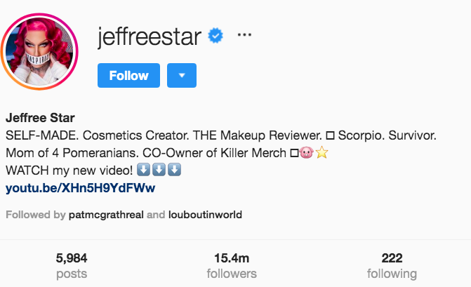 如果有对于J姐还不了解的朋友,今天小编就为大家好好盘点一下J姐的爆红之路。J姐的全名是Jeffree STar,在Ins Tagram上拥有13.1M的followers,在Ins上,J姐也有1千5百万的粉丝。说他是美妆界的顶流一点都不为过。