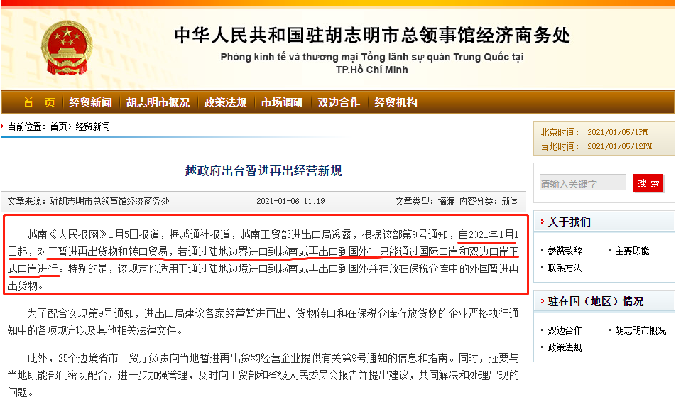 从2021年1月1日开始,越南工贸部颁发的09/2020/TT-BCT号通知开始生效,从第三国过境越南向邻国(其他国家)出口的暂进再出货物将不能通过边民互市点进行交易,而只能经过主要口岸进行交易。