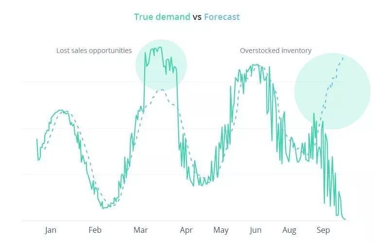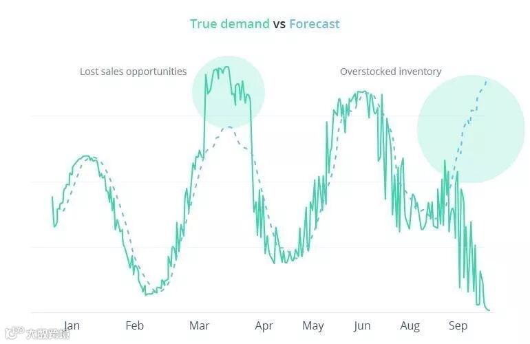 时尚行业要求零售商以短跑运动员冲刺的速度进入市场,在这样的节奏之下,很多品牌就不断加速预测的速度或者不断简化需求预测模型。于是乎,这样的操作就开始了:使用自上而下的方法来建立预测模型,选择整个产业链中某个产品或类别的销售数据。由于不是按照每个店铺的实际情况来分析,就消除了缺货的可能性,因此会导致预测不足。如果零售商在伍德布里奇的商店在每月的第三周内都没有缺货,那么6月将售出多少商品?不考虑实际销售的需求预测并不能反映由于缺货而导致的销售损失,也就导致预测不足的周期延长,损失加重。