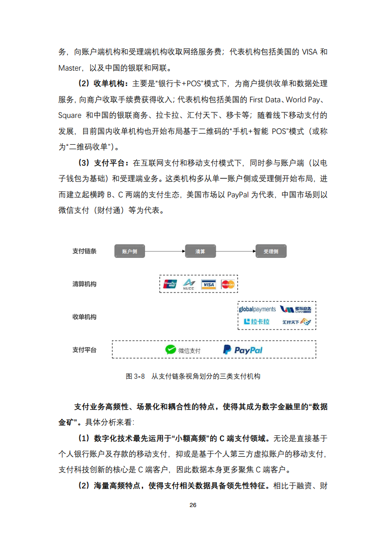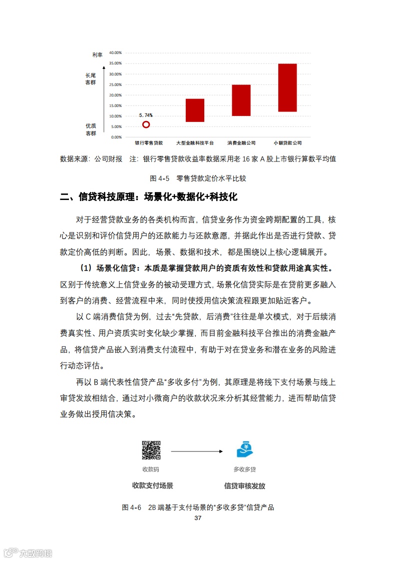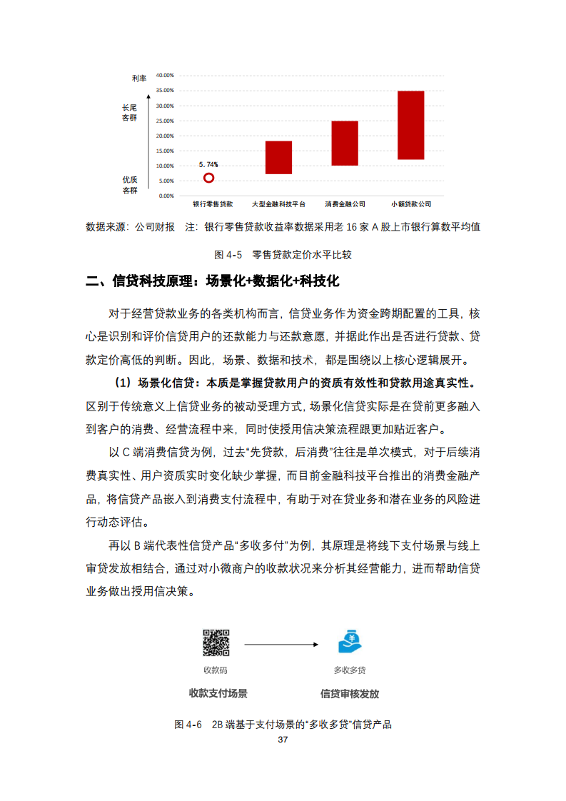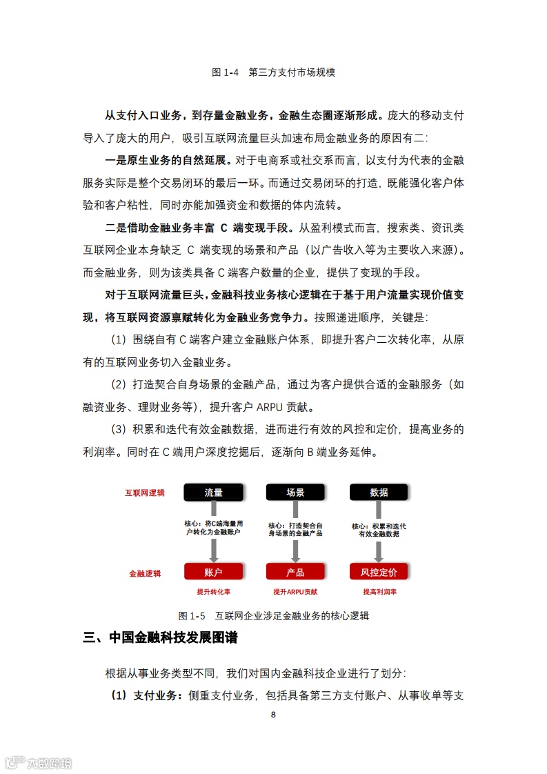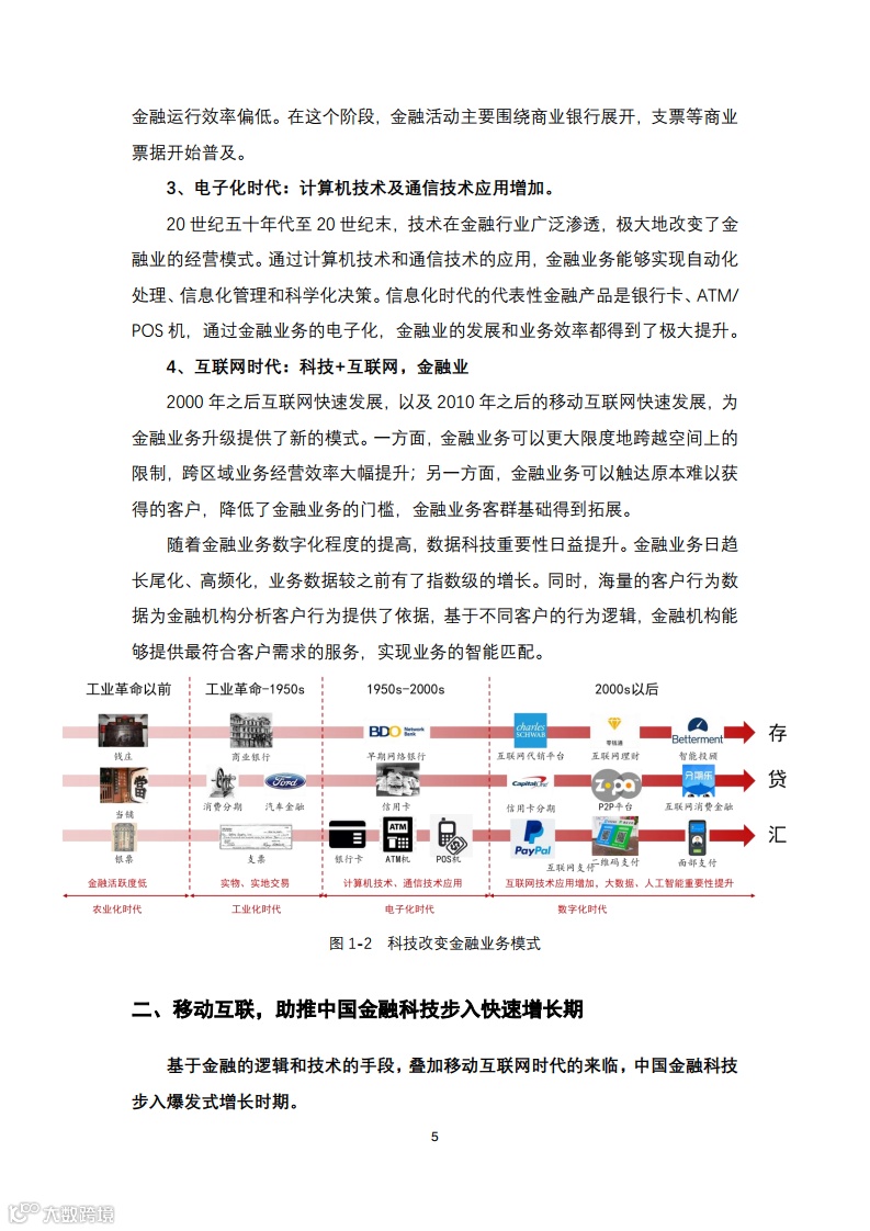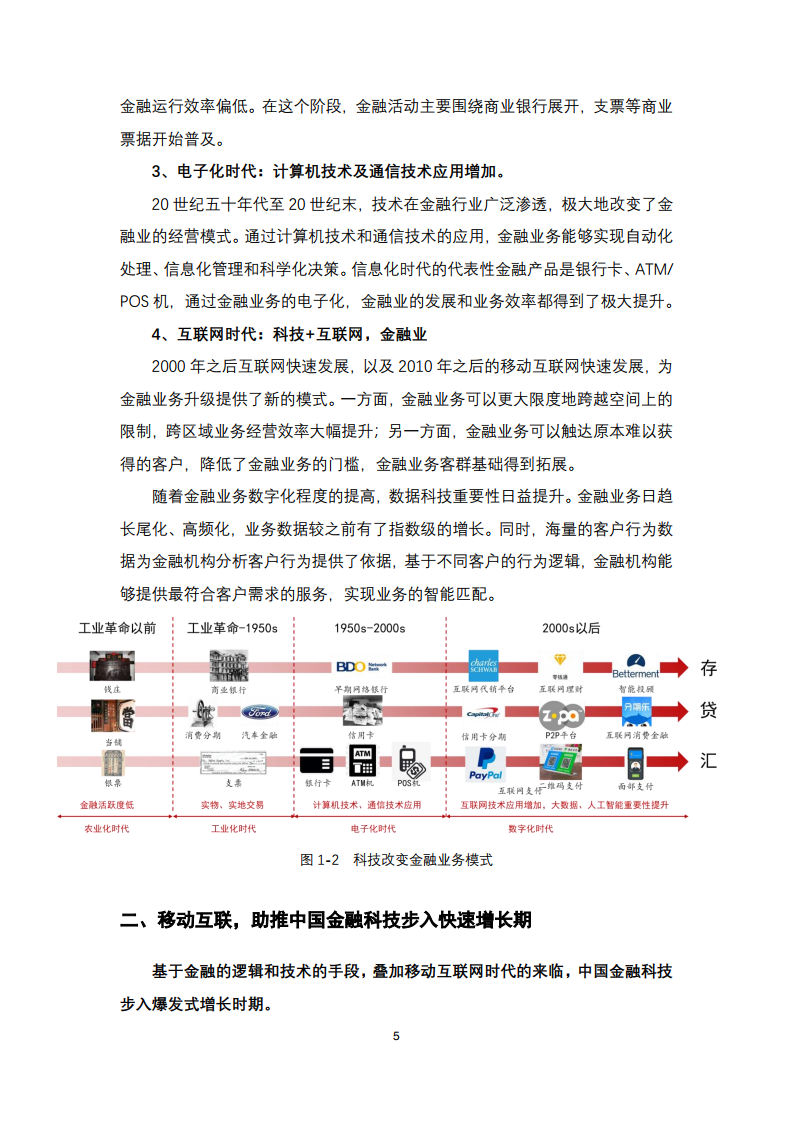 中国金融科技业务发展全球领先。支付、信贷、理财等传统金融业务,与互联网时代的海量客户、海量场景和海量数据高度融合,叠加算法和模型的作用,逐渐演绎为支付科技、信贷科技和理财科技等新兴金融模式。