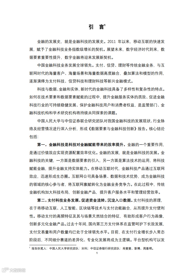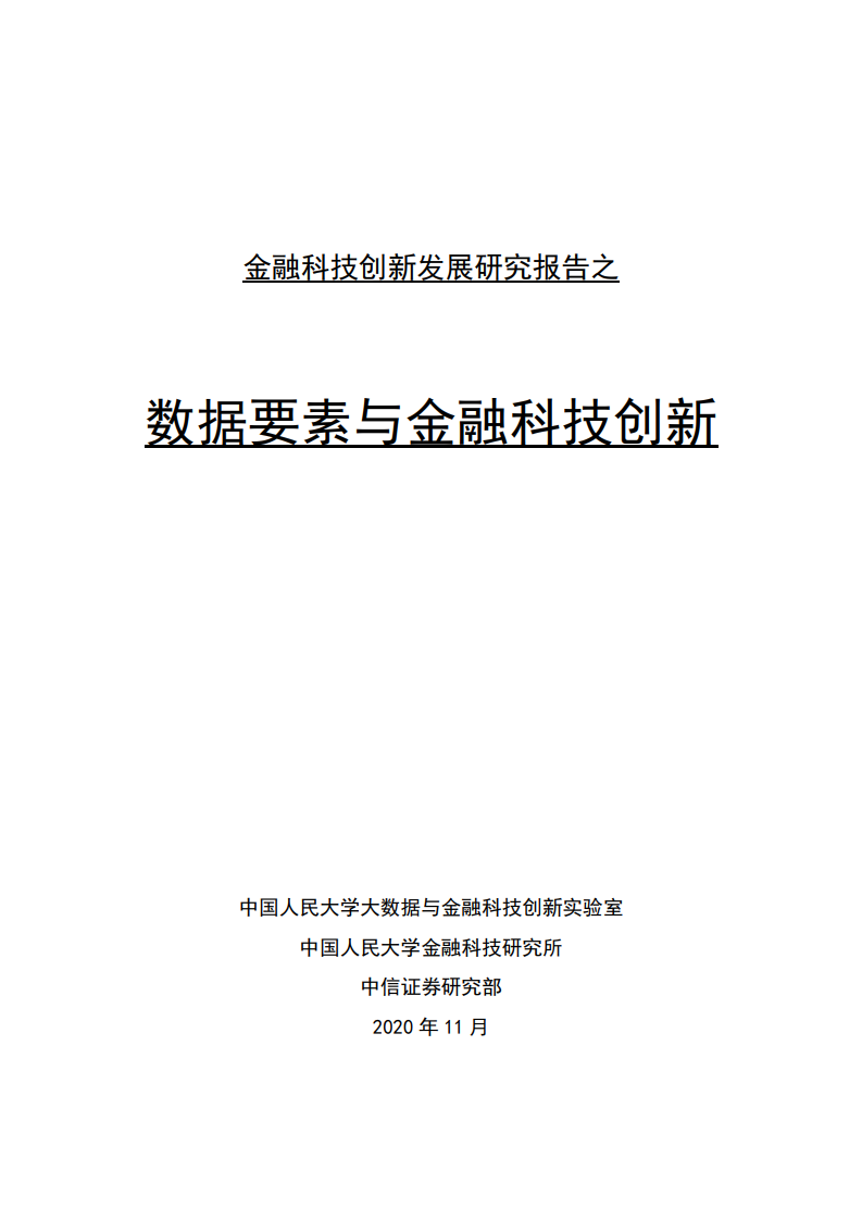 中国人民大学与中信证券联合研究团队对我国金融科技的发展现状、行业脉络及经营情况进行深入分析,形成《数据要素与金融科技创新》报告。