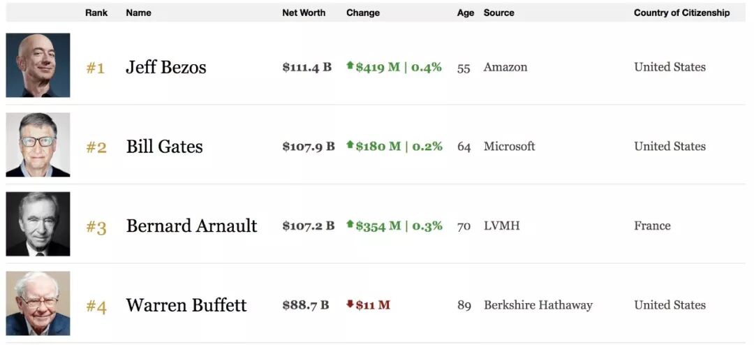 随后在美东时间下午4点美股收市时重新被贝佐斯以1101亿美元的身价反超,Bernard Arnault则位居第二,身价为1093亿美元。