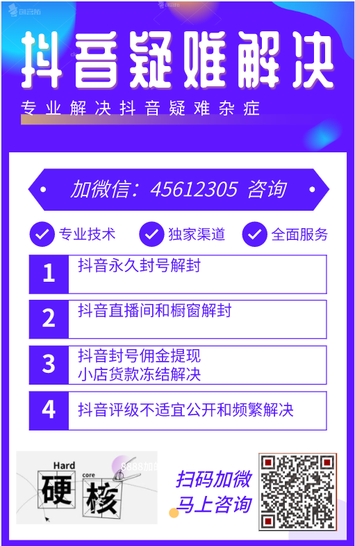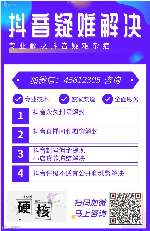 哈喽你好!我是小K,专业解决抖音疑难杂症,各种问题都可以找我:抖音永久封号解决、抖音直播间限制解决、橱窗购物车限制解决、封号佣金提现解决、小店货款冻结解决、各种评级解决不适宜公开和频繁解决。。。!包含不限于以上问题,有需要的朋友联系小K微信:45612305 备注好你的需求。