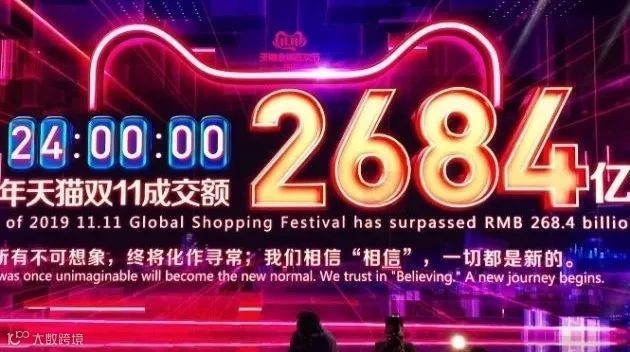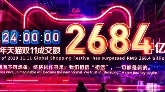 根据阿里巴巴公布的数据显示,2019天猫双11开场后,1分36秒销售额突破100亿元;17分06秒成交额超过571亿元;双十一总成交额达到2684亿元。
