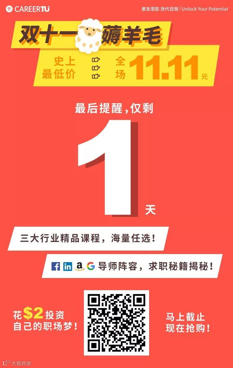 双十一你也买买买了吗?鞋子、衣服、化妆品?还得考虑之后的黑五...其实投资自己不用这么麻烦!双十一职图研究院送福利了!FLAG导师上场,包括数据、营销、UI/UX三个方向精品课程,统统11.11元抢购!限时活动,倒计时已开始,马上抢购!