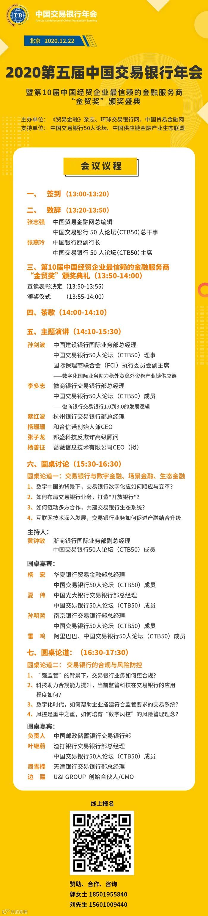 在此大背景下,为进一步增强交易银行对实体经济的支持以及对小微企业的助力,提升银行服务实体经济发展的能力和水平,《贸易金融》杂志、中国贸易金融网、中国交易银行50人携手相关机构共同举办“第五届中国交易银行年会”,本次年会将于12月22日在北京举办,我们诚邀业界人士参加。12月22日,北京,期待您的莅临!