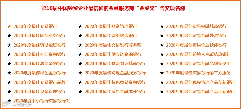 作为业内最知名的交易银行生态圈奖项之一,中国经贸企业最信赖的金融服务商“金贸奖”从2010年举办至今,已经走过了10个年头。在《贸易金融》杂志、中国贸易金融网的鼎力支持下、“第十届中国经贸企业最信赖的金融服务商(金贸奖)评选”如期而至,此次评选旨在通过一年一度的评选,以期表彰先进、树立标杆、分享价值,从而带动整个交易银行行业的持续、稳步发展。