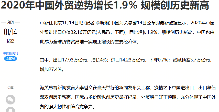 美国的贸易战,没能阻止中国出口的超预期增长。2020年我国货物贸易进出口总额 32.16万亿元,同比增长1.9%,外贸规模再创历史新高,成为全球唯一实现货物贸易正增长的主要经济体。其中,出口17.93万亿元,增长4%;贸易顺差3.7万亿元,增加27.4%。中国出口市场更加多元化,国际市场份额也创历史最好纪录。