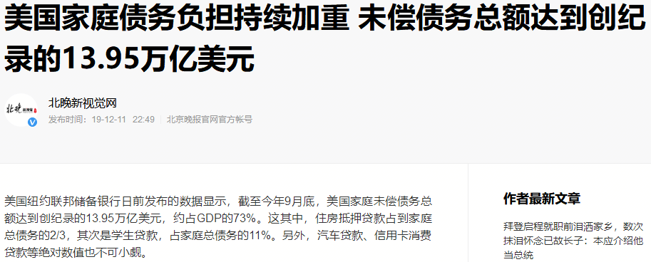 美国经济的“虚”,还体现在美国经济已经负债累累。美国经济表面强大,却是站在巨额债务下的巨人。仔细审视之下,就会看到美国经济背后天量债务的“水分”。美国联邦政府本来就连年赤字,2020年又深陷疫情危机,经济疲敝,随着几轮政府纾困计划的巨额支出,美国联邦政府负债总额已高达27.4万亿美元,占GDP比重约134%。企业部门和家庭部门负债水平也相当高,企业部门债务总额达 17.5 万亿美元(2020年三季度末),约占GDP的92%,美国家庭债务总额达到创纪录的13.95万亿美元,约占GDP的73%。