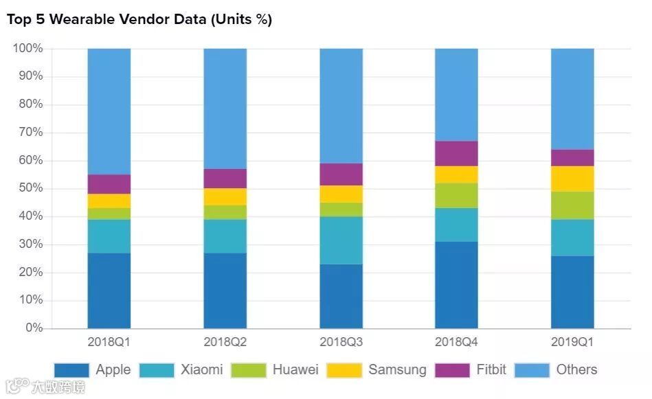 尽管行业先驱们每天都在发现新的可能性,但手腕设备仍然是可穿戴市场的主要焦点。三星、苹果、Fitbit和小米等科技巨头们也一直积极争夺这一数十亿美元市场的份额。市场研究公司 IDC 公布了 2019 Q1 全球可穿戴设备市场的报告,据统计,Q1 的设备销量同比增长 55.2%;其中,苹果的市场份额仍首屈一指,小米和华为也是势头勇猛。从设备的类别来看,消费者购买的大多数可穿戴设备都是健身和健康tracker,如 Fitbit、Jawbone、Moov 和 Garmin 腕带,腕戴式设备的市场份额为 63.2%;而耳戴式设备的市场份额为 34.6%,出货量同比增长 135.1%。