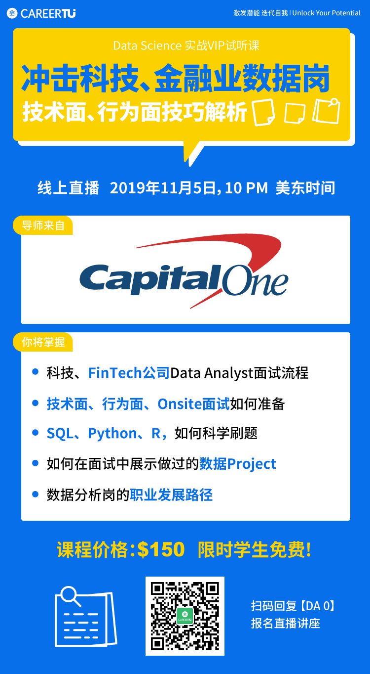 导读:11月5日,Caital one导师手把手教你如何通过技术面、行为面!冲击高薪、好前途的数据岗,现在就报名