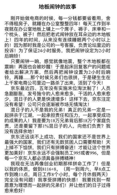 无独有偶,12日下午,京东创始人刘强东在朋友圈发布一则以“地板闹钟的故事”为题的短文,对近期京东爆出的裁员、加班等风波做出了集中回应。