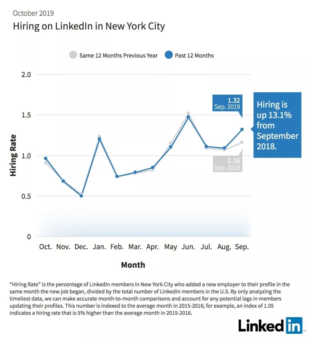 2019年9月的招聘人数比2018年9月增加了13.1%。季节性调整后的招聘人数(消除了可预测的季节性招聘变化)在9月比8月增加了0.6%。通过下图可以看出十月之后的招聘岗位会减少,同时很多公司的招聘流程也会变慢。