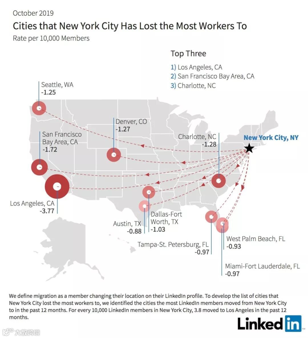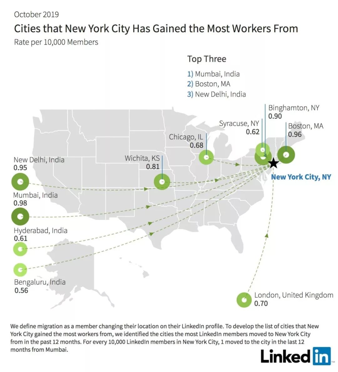 在过去的12个月中,纽约市从印度孟买获得的Professionals最多,其次来自于马萨诸塞州波士顿 ; 和印度新德里。因此,去年纽约市每10,000个LinkedIn会员中,有0.98名Professionals从印度孟买迁至该市。也就是,想在纽约找工作,除了要跟纽约当地的Professionals比,还要和周围如麻省等城市,甚至是来自印度的国际纽漂们,去竞争工作机会!