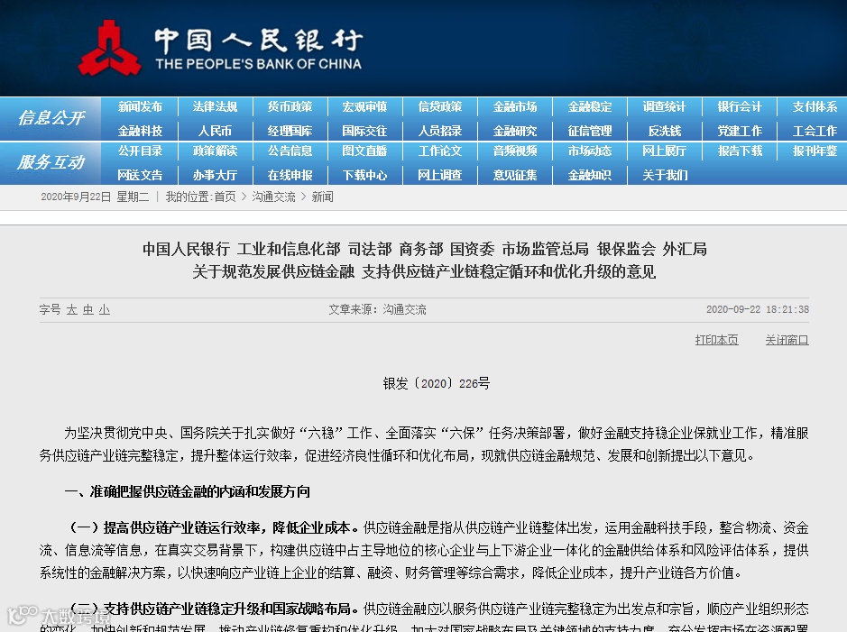 9月22日,中国人民银行等部门联合发布《关于规范发展供应链金融 支持供应链产业链稳定循环和优化升级的意见》(以下简称《意见》)。此前关于供应链金融的内涵等各方面的认识较为模糊、并不统一,此次意见是我国出台的首份供应链金融指导性文件。《意见》既包括供应链金融的内涵、发展方向、产品创新和规范、基础设施建设、政策支持体系、防范风险等,也包括合同签章、银行UKEY等具体事宜,几乎涵盖了供应链金融业务的方方面面。