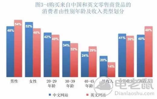 根据Yandex和GFK在2013年发布的一项研究报告可以看出,与中文网站相比,男人更喜欢从英文网站(54%)购买商品,而大多数女性更喜欢从中文网店购物(52%)。这种现象可能与购买的商品品类有关,女性购买的品类多为服装、饰品、儿童用品和家居用品。在中国市场,这些低价商品被广泛使用。与此同时,男性经常集中购买电子产品和汽车配件。