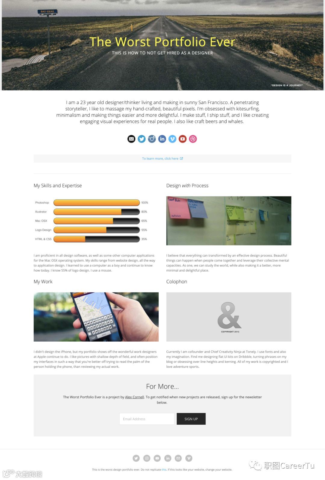 一个长得好看的作品集是吸引HR目光的第一步,想想你要是连作品集的首页都只是用了一个Wix或是Square Space自带的模板,连排版都不自己改一改的,像这样: