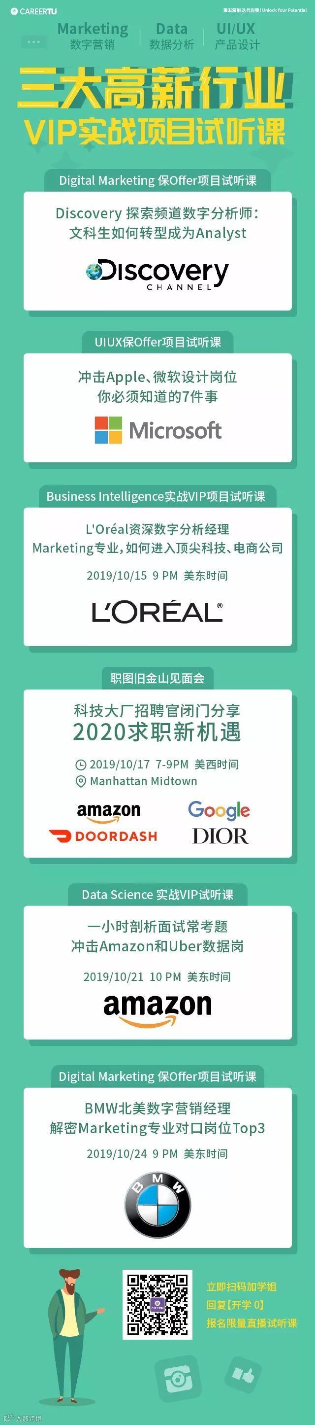 无论政策如何,作为留学生们做好当前的学习,顺利完成学业,获得知识提高能力为之后的就业积累实力才是最重要的事情。十月,职图也为留学生们带来三个高薪行业VIP实战项目试听课,一起成长起来!