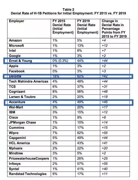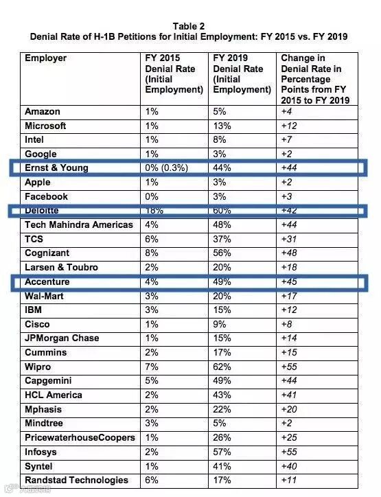 而以往偏爱留学生的Sponsor H1B大户,如科技公司等,在这几年里申请被拒概率出现了非常明显的增长,E&Y的拒签率从0直接上升至19年的44%。