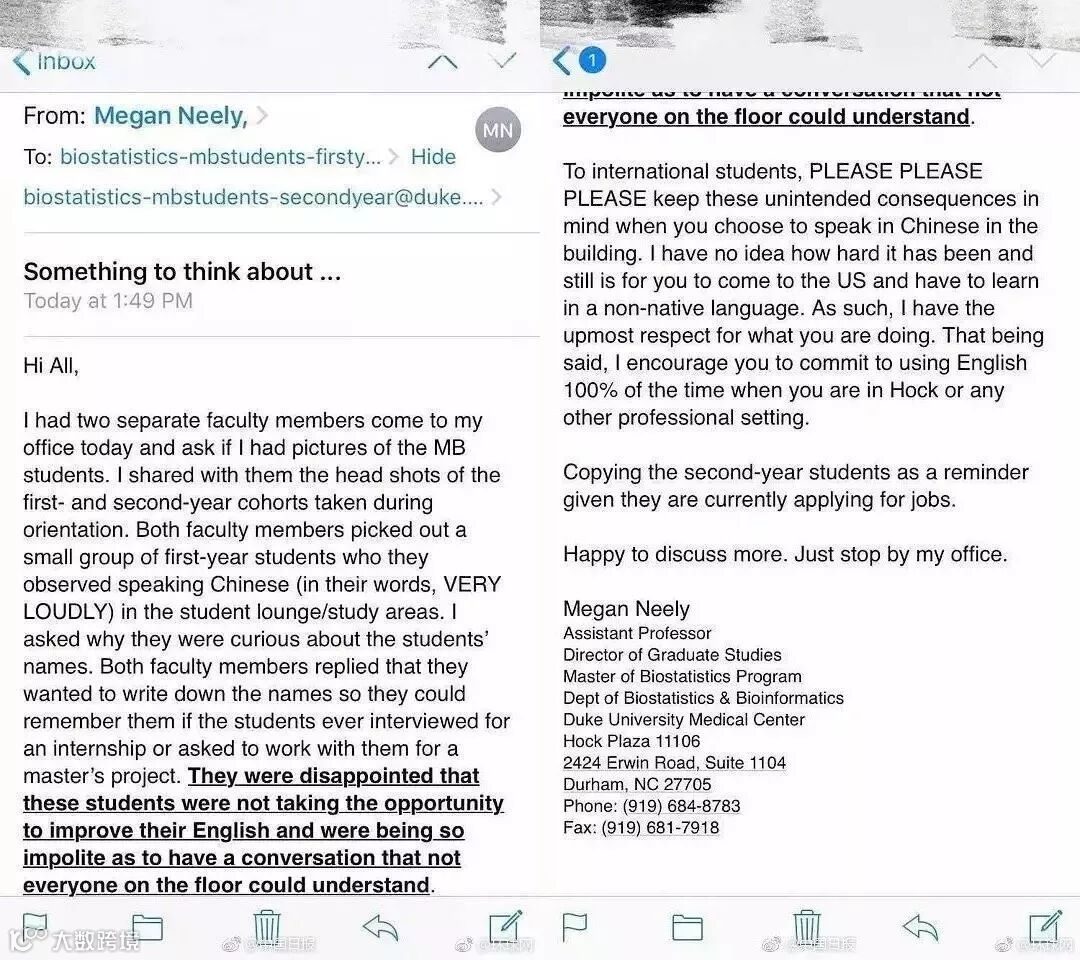 曾有美国杜克大学生物统计助理教授梅根,因为听到两名中国学生在校用中文对话,而向全系学生发送邮件。称在校说别人听不懂的语言不仅不礼貌,而且很可能影响以后找工作。