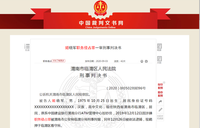 近日,中国裁判文书网披露一起银行加钞员侵占ATM现金的案件。被告人姬某军,男,1975年出生,原系中国建设银行渭南分行ATM管理中心加钞员。