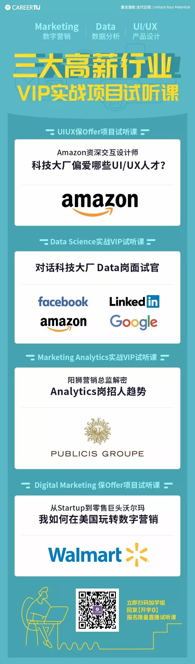 参与职图Data Analytics实战VIP项目,来自Amazon,Facebook, LinkedIn,阳狮,沃尔玛等名企导师带你决胜2019秋招,帮助你在最短时间内了解三个分支的各个细分和技能知识点,从各种工具,分析模型及基本算法的学习,到真实职场的实际运用,让你对Analytics的掌握有质的飞跃。