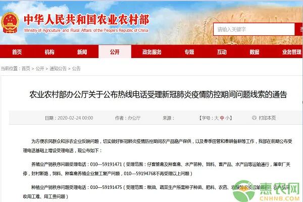 农业农村部办公厅关于公布热线电话受理新冠肺炎疫情防控期间问题线索的通告